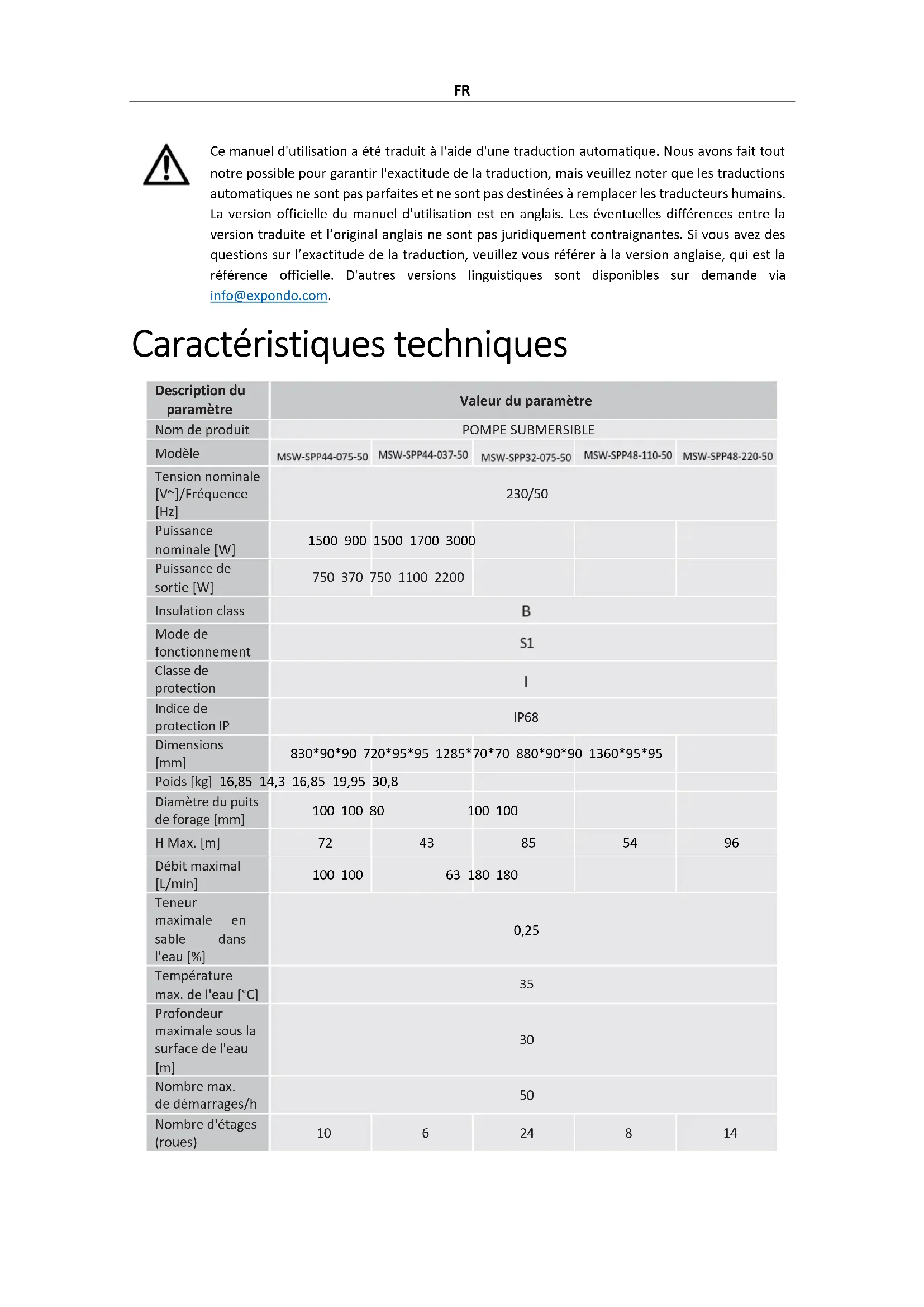 Pour allumer la pompe, placez le bouton marche/arrêt sur la position marche.FR Si le disjoncteur de surintensité est déclenché par un court-circuit, une surchauffe, etc., une fois le problème résolu (cause du déclenchement du disjoncteur de surintensité), relâchez le disjoncteur en appuyant sur le bouton du disjoncteur situé sur le boîtier du panneau de commande. Démonter la pompe Dans les régions où les températures descendent en dessous de zéro, démontez la pompe pour la saison hivernale et stockez-la conformément aux directives de la section « transport et stockage ». Pour démonter la pompe : Réglez le bouton marche/arrêt sur la position Off (« 0 »). Débranchez la pompe de la source d’alimentation. Extraire la pompe du puits de forage à l'aide d'une corde en acier ou d'une autre corde sécurisée attachée aux poignées de la pompe. Débrancher le tuyau d’alimentation en eau de la pompe. Videz l’eau restante dans la pompe en la retournant. Une fois la pompe sèche, elle est prête à être stockée en toute sécurité. Transport et stockage Il convient d'éviter de secouer, de heurter ou de renverser l'appareil lors de son transport. Conservez-le dans un endroit correctement ventilé, avec de l'air sec et sans gaz corrosif. Conservez l'appareil à une température ambiante supérieure à zéro et en position horizontale. Si la pompe a été stockée pendant plus de quelques jours, assurez-vous que l'appareil fonctionne correctement avant de le réinstaller. Nettoyage et entretien Débranchez toujours l'appareil avant de le nettoyer. Utiliser un nettoyant sans substances corrosives pour nettoyer chaque surface. Nettoyez les dépôts organiques de l'appareil après chaque utilisation avec un jet d'eau propre et un chiffon doux. Conservez l’appareil dans un endroit sec et frais, à l’abri de l’humidité et de l’exposition directe au soleil. Contrôle régulier de l'appareil Vérifiez régulièrement si l'appareil est endommagé. En cas de dommage, veuillez cesser immédiatement de l'utiliser et contacter le service client pour résoudre le problème. Que faire en cas de problème ? Veuillez contacter le service client et préparer les informations suivantes : Numéro de facture et numéro de série (ce dernier se trouve sur la plaque technique de l'appareil). Si nécessaire, prenez une photo de la pièce endommagée, cassée ou défectueuse.FR Il sera plus facile pour votre assistant du service client de déterminer la source du problème si vous donnez une description détaillée et précise du problème. Plus vos informations seront détaillées, plus le service client sera en mesure de résoudre votre problème rapidement et efficacement ! ATTENTION ! N'ouvrez jamais l'appareil sans l'autorisation de votre service client. Cela peut entraîner une perte de garantie ! Élimination des appareils usagés Ne jetez pas cet appareil dans les déchets municipaux. Remettez-le à un point de collecte et de recyclage des appareils électriques et électroniques. Vérifiez le symbole sur le produit, le manuel d’instructions et l’emballage. Les plastiques utilisés pour construire l'appareil peuvent être recyclés conformément à leurs marquages. En choisissant de recycler, vous contribuez significativement à la protection de notre environnement. Contactez les autorités locales pour obtenir des informations sur votre centre de recyclage local. Résolution de problèmes Problème Raison possible Solution L'appareil ne démarre pas Le disjoncteur de surintensité s'est déclenché Remédier à la cause du déclenchement du disjoncteur. Attendez que le moteur refroidisse. Remettre le disjoncteur à sa position d’origine. Pas de courant Assurez-vous que le câble d’alimentation est correctement connecté. Moteur ou câble d'alimentation endommagé Appelez votre agent ou technicien qualifié. L'appareil démarre mais ne pompe pas / ne pompe que peu d'eau Alimentation en eau bouchée Enlever le blocage. Fuites au niveau des raccordements d'eau Sceller les connexions. Niveau d'eau insuffisant dans le puits de forage Vérifiez le niveau d'eau. La pompe doit être placée à au moins 2 m sous la surface de l'eau. Hauteur de refoulement de l'eau trop élevée Installer la pompe conformément à ses spécifications techniques.IT Questo manuale utente è stato tradotto utilizzando la traduzione automatica. Abbiamo fatto ogni sforzo per garantire l'accuratezza della traduzione, ma tieni presente che le traduzioni automatiche non sono perfette e non intendono sostituire i traduttori umani. La versione ufficiale del Manuale d'uso è in inglese. Eventuali differenze tra la versione tradotta e quella originale in inglese non sono giuridicamente vincolanti. In caso di dubbi sull'accuratezza della traduzione, fare riferimento alla versione inglese, che è il riferimento ufficiale. Versioni in altre lingue sono disponibili su richiesta scrivendo a info@expondo.com. Dati tecnici Descrizione del parametro Valore del parametro Nome del prodotto POMPA SOMMERGIBILE Modello Tensione nominale [V~]/ Frequenza [Hz] 230/50 Potenza nominale [W]