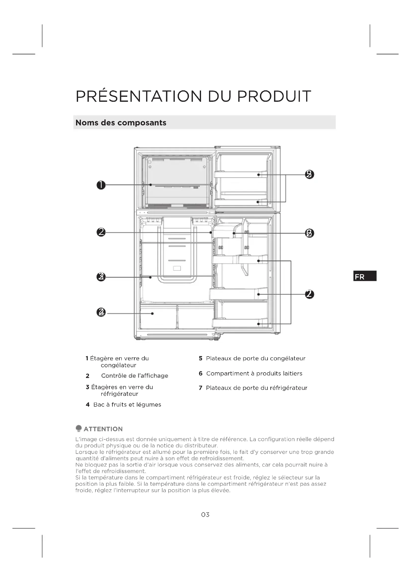1 Étagère en verre du congélateur 3 Étagères en verre du réfrigérateur4 Bac à fruits et légumes5 Plateaux de porte du congélateur 6 Compartiment à produits laitiers 7 Plateaux de porte du réfrigérateur ATTENTION L’image ci-dessus est donnée uniquement à titre de référence. La configuration réelle dépend du produit physique ou de la notice du distributeur.Lorsque le réfrigérateur est allumé pour la première fois, le fait d’y conserver une trop grande Ne bloquez pas la sortie d’air lorsque vous conservez des aliments, car cela pourrait nuire à Si la température dans le compartiment réfrigérateur est froide, réglez le sélecteur sur la position la plus faible. Si la température dans le compartiment réfrigérateur n’est pas assez froide, réglez l’interrupteur sur la position la plus élevée.04