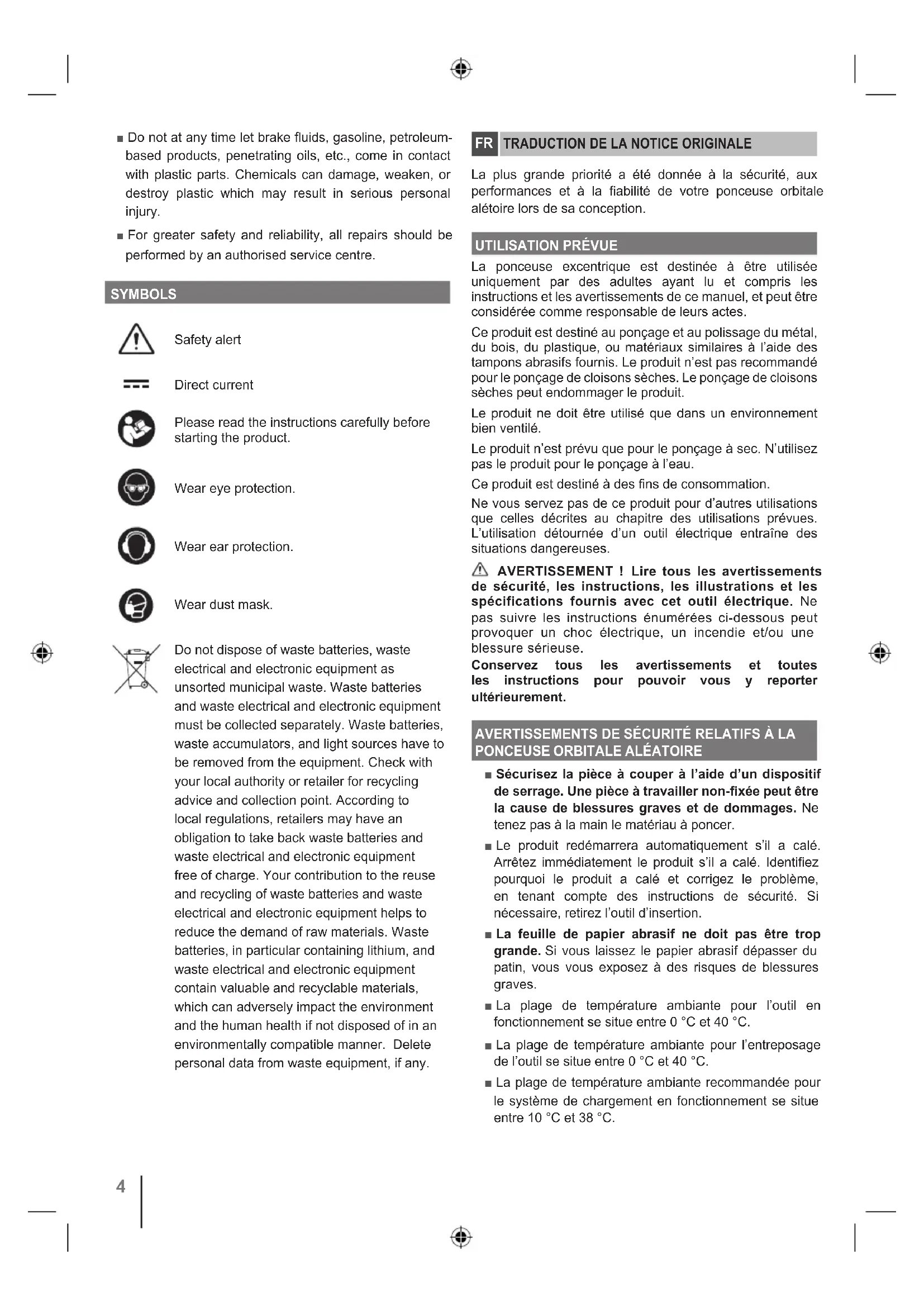 ENTRETIEN ■ Le produit ne doit jamais être branché sur une source de courant lorsque vous-y montez des pièces, lorsque vous effectuez des réglages, lorsque vous le nettoyez, lorsque vous l’entretenez, ou lorsque vous ne l’utilisez pas. Déconnecter le produit de l’alimentation électrique empêche les démarrages accidentels qui peuvent causer des blessures graves. ■ N’effectuez l’entretien qu’à l’aide de pièces détachées et accessoires d’origine constructeur. L’utilisation de toute autre pièce est susceptible de présenter un danger ou d’endommager votre outil. ■ Évitez d’utiliser des solvants pour nettoyer les parties en plastique. La plupart des plastiques sont susceptibles d’être endommagés par les solvants disponibles dans le commerce. Utilisez un chiffon propre pour essuyer les impuretés, la poussière, etc. ■ Ne laissez jamais du liquide de frein, de l’essence, des produits pétroliers, des huiles pénétrantes, etc. entrer en contact avec les éléments en plastique. Les produits chimiques peuvent endommager, affaiblir ou détruire les plastiques, ce qui pourrait entraîner de graves blessures. ■ Pour plus de sécurité et de fiabilité, toutes les réparations doivent être effectuées par un service après-vente agréé. SYMBOLES Alerte de sécurité Courant continu Veuillez lire attentivement le mode d’emploi avant de démarrer la machine. Portez une protection oculaire Portez une protection auditive Portez un masque anti poussières. Ne jetez pas les batteries et les équipements électriques et électroniques usagés parmi les déchets municipaux non triés. Les batteries et les équipements électriques et électroniques usagés doivent être collectés séparément. Les batteries, accumulateurs et sources lumineuses usagés doivent être retirés de l'équipement. Pour obtenir des conseils en matière de recyclage et de points de collecte, se renseigner auprès des autorités locales ou du détaillant. Selon les réglementations locales, les détaillants peuvent avoir l'obligation de récupérer gratuitement les batteries et les équipements électriques et électroniques usagés. Votre contribution à la réutilisation et au recyclage des batteries et équipements électriques et électroniques usagés permet de réduire la demande en matières premières. Les batteries, notamment celles qui contiennent du lithium, ainsi que les équipements électriques et électroniques usagés comportent des matériaux précieux et recyclables, qui peuvent avoir un impact négatif sur l'environnement et la santé humaine s'ils ne sont pas éliminés de manière respectueuse de l'environnement. Supprimer les données personnelles de l'équipement usagé, le cas échéant. Cet appareil et sa baerie se recyclent