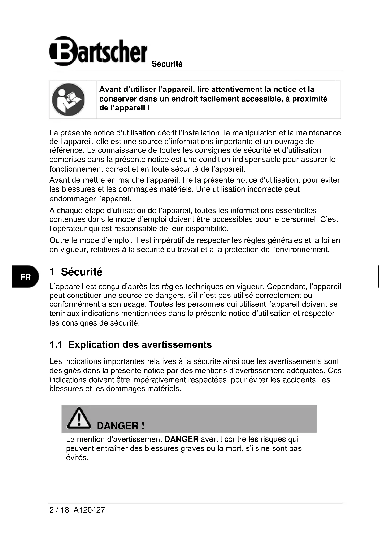 DANGER ! La mention d’avertissement DANGER avertit contre les risques qui peuvent entraîner des blessures graves ou la mort, s’ils ne sont pas évités.Sécurité A120427 3 / 18