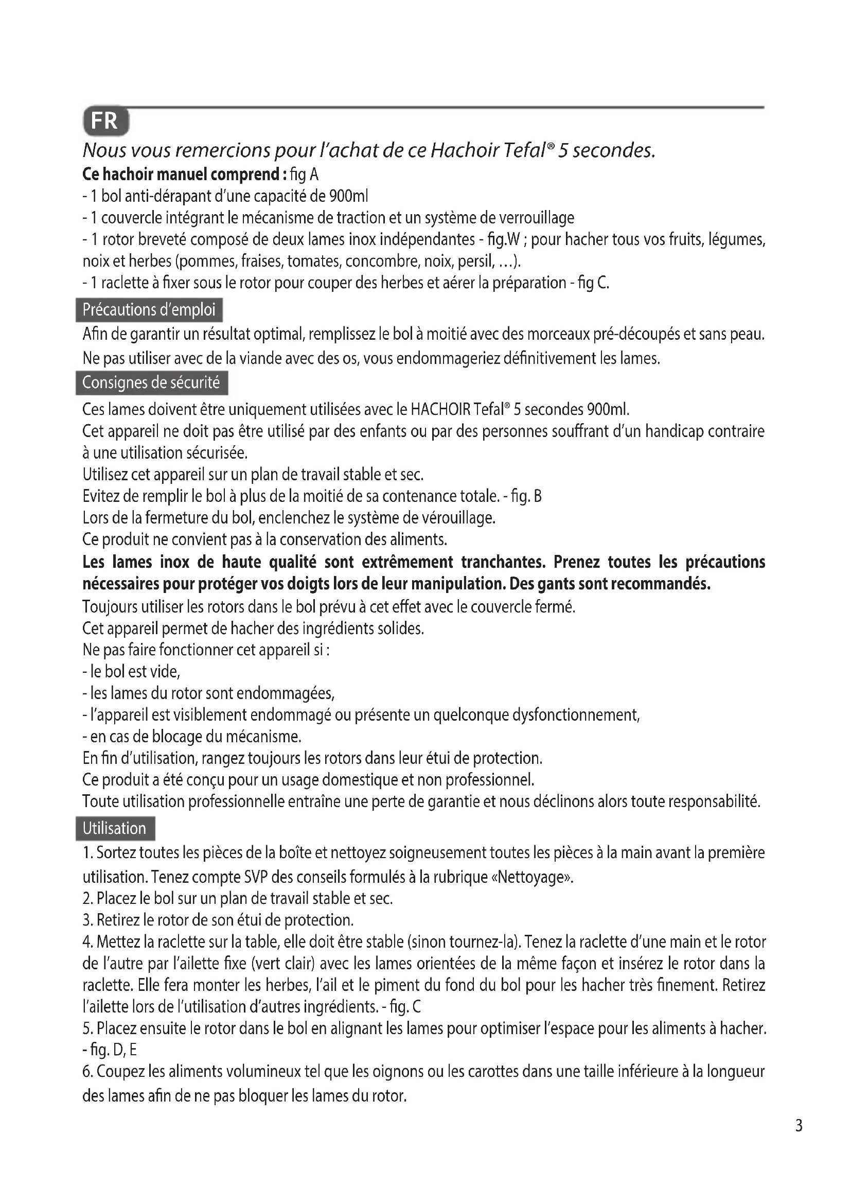 Nous vous remercions pour l’achat de ce Hachoir Tefal® 5 secondes. Ce hachoir manuel comprend : g A - 1 bol anti-dérapant d’une capacité de 900ml - 1 couvercle intégrant le mécanisme de traction et un système de verrouillage - 1 rotor breveté composé de deux lames inox indépendantes - g.W ; pour hacher tous vos fruits, légumes, noix et herbes (pommes, fraises, tomates, concombre, noix, persil, …). - 1 raclette à xer sous le rotor pour couper des herbes et aérer la préparation - g C. Précautions d’emploi An de garantir un résultat optimal, remplissez le bol à moitié avec des morceaux pré-découpés et sans peau. Ne pas utiliser avec de la viande avec des os, vous endommageriez dénitivement les lames. Consignes de sécurité Ces lames doivent être uniquement utilisées avec le HACHOIR Tefal® 5 secondes 900ml. Cet appareil ne doit pas être utilisé par des enfants ou par des personnes sourant d’un handicap contraire à une utilisation sécurisée. Utilisez cet appareil sur un plan de travail stable et sec. Evitez de remplir le bol à plus de la moitié de sa contenance totale. - g. B Lors de la fermeture du bol, enclenchez le système de vérouillage. Ce produit ne convient pas à la conservation des aliments. Les lames inox de haute qualité sont extrêmement tranchantes. Prenez toutes les précautions nécessaires pour protéger vos doigts lors de leur manipulation. Des gants sont recommandés. Toujours utiliser les rotors dans le bol prévu à cet eet avec le couvercle fermé. Cet appareil permet de hacher des ingrédients solides. Ne pas faire fonctionner cet appareil si : - le bol est vide, - les lames du rotor sont endommagées, - l’appareil est visiblement endommagé ou présente un quelconque dysfonctionnement, - en cas de blocage du mécanisme. En n d’utilisation, rangez toujours les rotors dans leur étui de protection. Ce produit a été conçu pour un usage domestique et non professionnel. Toute utilisation professionnelle entraîne une perte de garantie et nous déclinons alors toute responsabilité. Utilisation