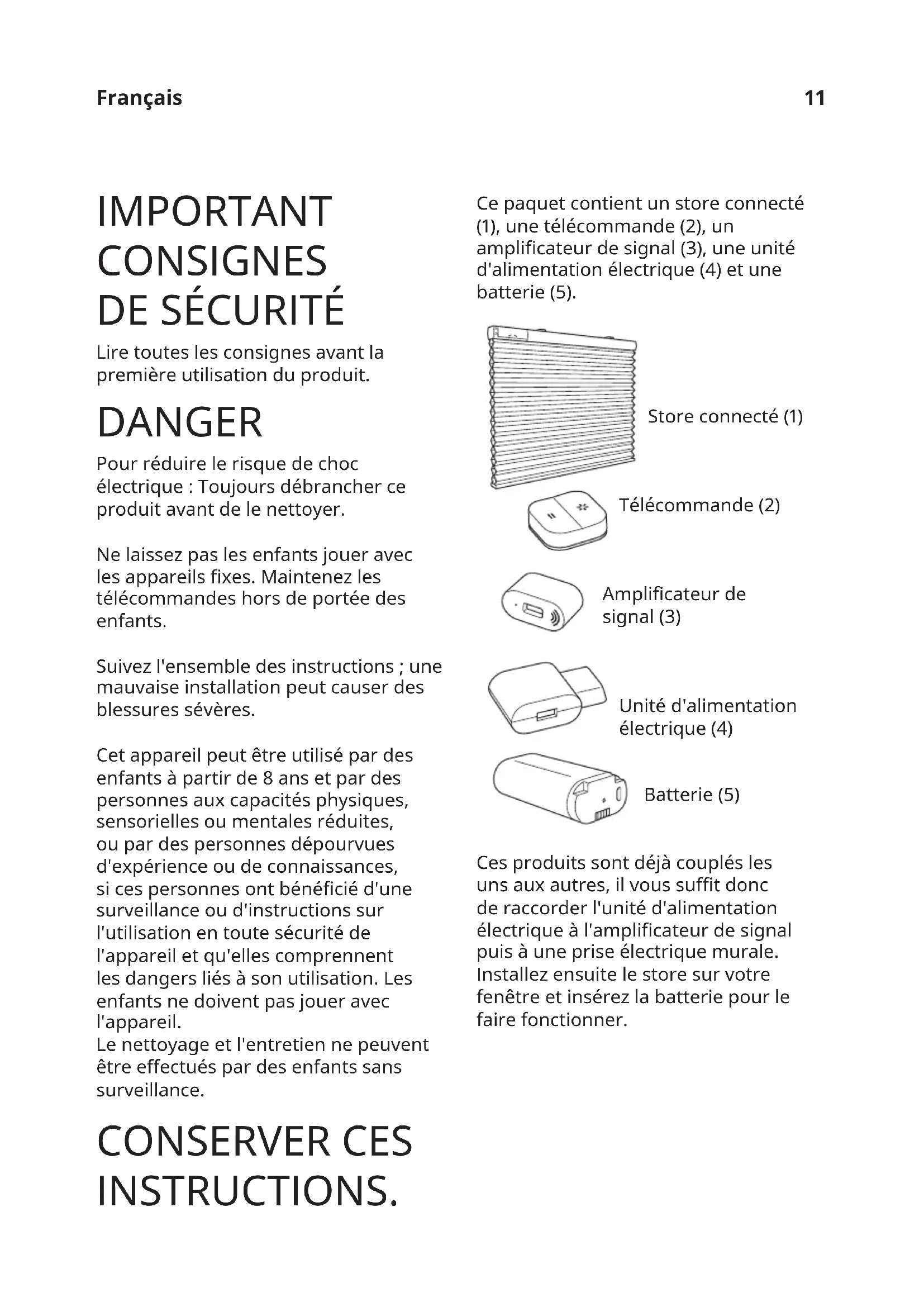 Lire toutes les consignes avant la première utilisation du produit. DANGER Pour réduire le risque de choc électrique : Toujours débrancher ce produit avant de le nettoyer. Ne laissez pas les enfants jouer avec les appareils xes. Maintenez les télécommandes hors de portée des enfants. Suivez l'ensemble des instructions ; une mauvaise installation peut causer des blessures sévères. Cet appareil peut être utilisé par des enfants à partir de 8 ans et par des personnes aux capacités physiques, sensorielles ou mentales réduites, ou par des personnes dépourvues d'expérience ou de connaissances, si ces personnes ont bénécié d'une surveillance ou d'instructions sur l'utilisation en toute sécurité de l'appareil et qu'elles comprennent les dangers liés à son utilisation. Les enfants ne doivent pas jouer avec l'appareil. Le nettoyage et l'entretien ne peuvent être eectués par des enfants sans surveillance. CONSERVER CES INSTRUCTIONS. Ce paquet contient un store connecté (1), une télécommande (2), un amplicateur de signal (3), une unité d'alimentation électrique (4) et une batterie (5). Ces produits sont déjà couplés les uns aux autres, il vous sut donc de raccorder l'unité d'alimentation électrique à l'amplicateur de signal puis à une prise électrique murale. Installez ensuite le store sur votre fenêtre et insérez la batterie pour le faire fonctionner. Store connecté (1) Télécommande (2) Amplicateur de signal (3) Unité d'alimentation électrique (4) Batterie (5)12 Instructions d'utilisation Brancher l’unité d'alimentation électrique à la prise murale, insérer l'amplicateur de signal dans le port libre. Pour le chargement, utiliser uniquement un câble USB recommandé et remplacer immédiatement les câbles présentant des défauts. Fonctions télécommandées Haut : Presser pour lever le store connecté. Bas : Presser pour baisser le store connecté. Couplage : ajouter des produits IKEA connectés (IKEA Home smart) à votre système. Important : l'amplicateur de signal doit être branché et alimenté pour pouvoir commander le store à partir de la télécommande. Fonction de l'amplicateur de signal Grâce à l'amplicateur de signal TRÅDFRI, vous pouvez étendre la portée du signal de vos produits connecté IKEA (IKEA Home smart). Utilisation du store connecté Pour lever entièrement le store : Appuyer une fois (brièvement) sur le bouton vers le haut de la télécommande ou du store. Pour baisser entièrement le store : Appuyer une fois (brièvement) sur le bouton vers le bas de la télécommande ou du store. Pour lever le store : Maintenir enfoncé le bouton vers le haut de la télécommande ou du store. Le store s'ouvre tant que le bouton est maintenu enfoncé. Lâcher le bouton quand le store est à la hauteur désirée ou quand il est entièrement levé. Pour baisser le store : Maintenir enfoncé le bouton vers le bas de la télécommande ou du store. Le store se ferme tant que le bouton est maintenu enfoncé. Lâcher le bouton quand le store est à la hauteur désirée ou quand il est entièrement baissé. Régler à la hauteur minimum souhaitée : Seuls les boutons sur le store peuvent être utilisés pour ce réglage. Placer le store à la hauteur souhaitée. Presser ensuite brièvement vers le haut ou le bas le bouton sur le store pour conserver cette position comme hauteur minimum souhaitée. Le store va se déplacer très légèrement vers le haut et le bas pour conrmer le réglage.13 Régler une nouvelle hauteur minimum : Pour modier la hauteur minimum ou revenir à la hauteur minimum par défaut, commencer par déplacer le store à la position haute. Presser ensuite deux fois le bouton du store vers le haut ou le bas. Le store va se déplacer très légèrement vers le haut et le bas pour conrmer le réglage. Répéter les étapes ci-dessus pour régler une nouvelle hauteur minimum souhaitée. Régler l'équilibre du store : Si le store se bloque à la descente, il se peut qu'il soit mal équilibré. Lever entièrement le store avant de le replacer au niveau souhaité. Ajouter des équipements à la télécommande : Couplage : ajouter des produits IKEA connectés (IKEA Home smart) à votre système. > 10 s Suivez les étapes suivantes pour ajouter d'autres stores. Assurez-vous que votre store connecté soit sous tension.
