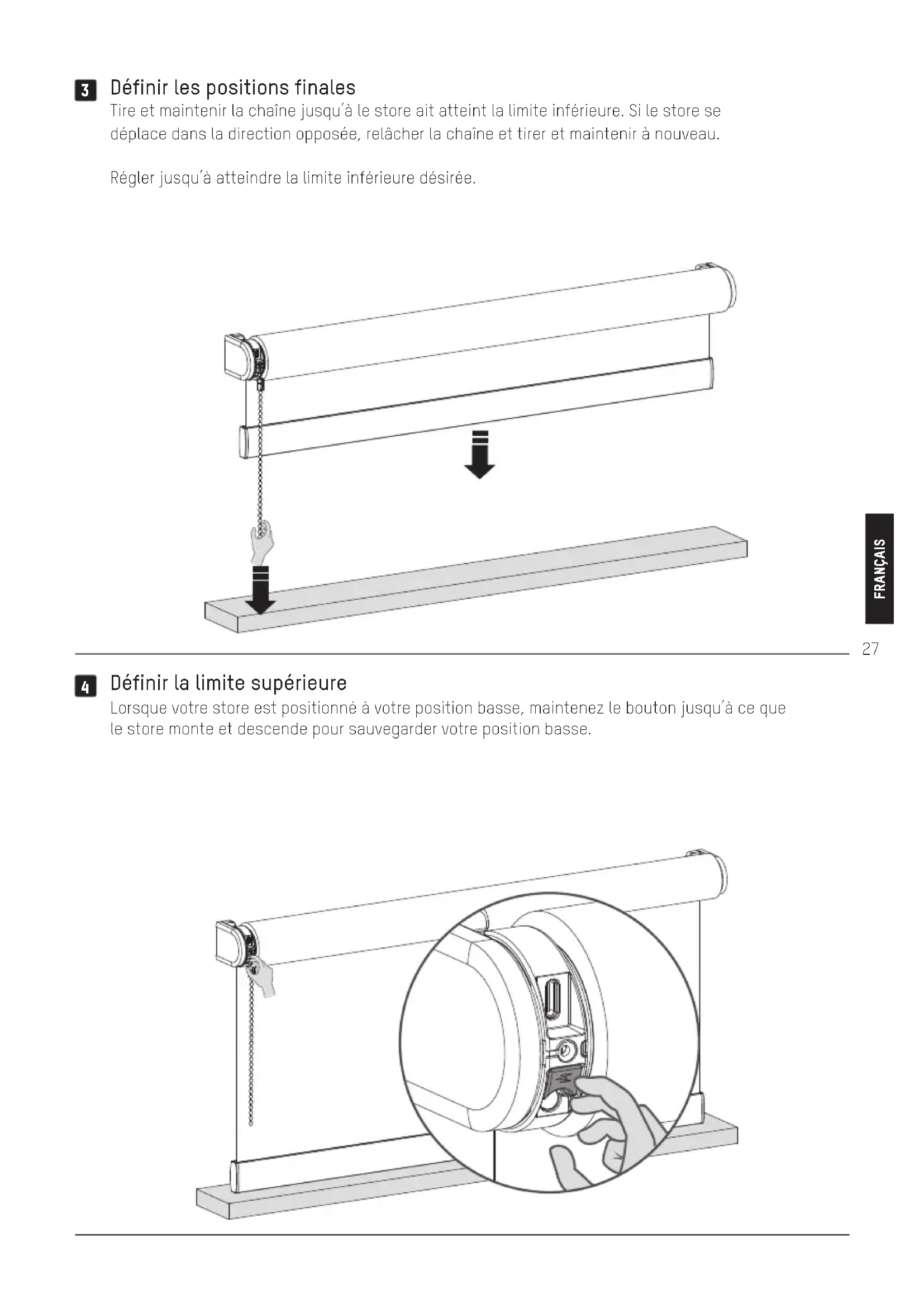 Tire et maintiens la chaîne jusqu'à ce que le store ait atteint la limite inférieure. Si le store se déplace dans la direction opposée, relâche la chaîne et tire et maintiens à nouveau.