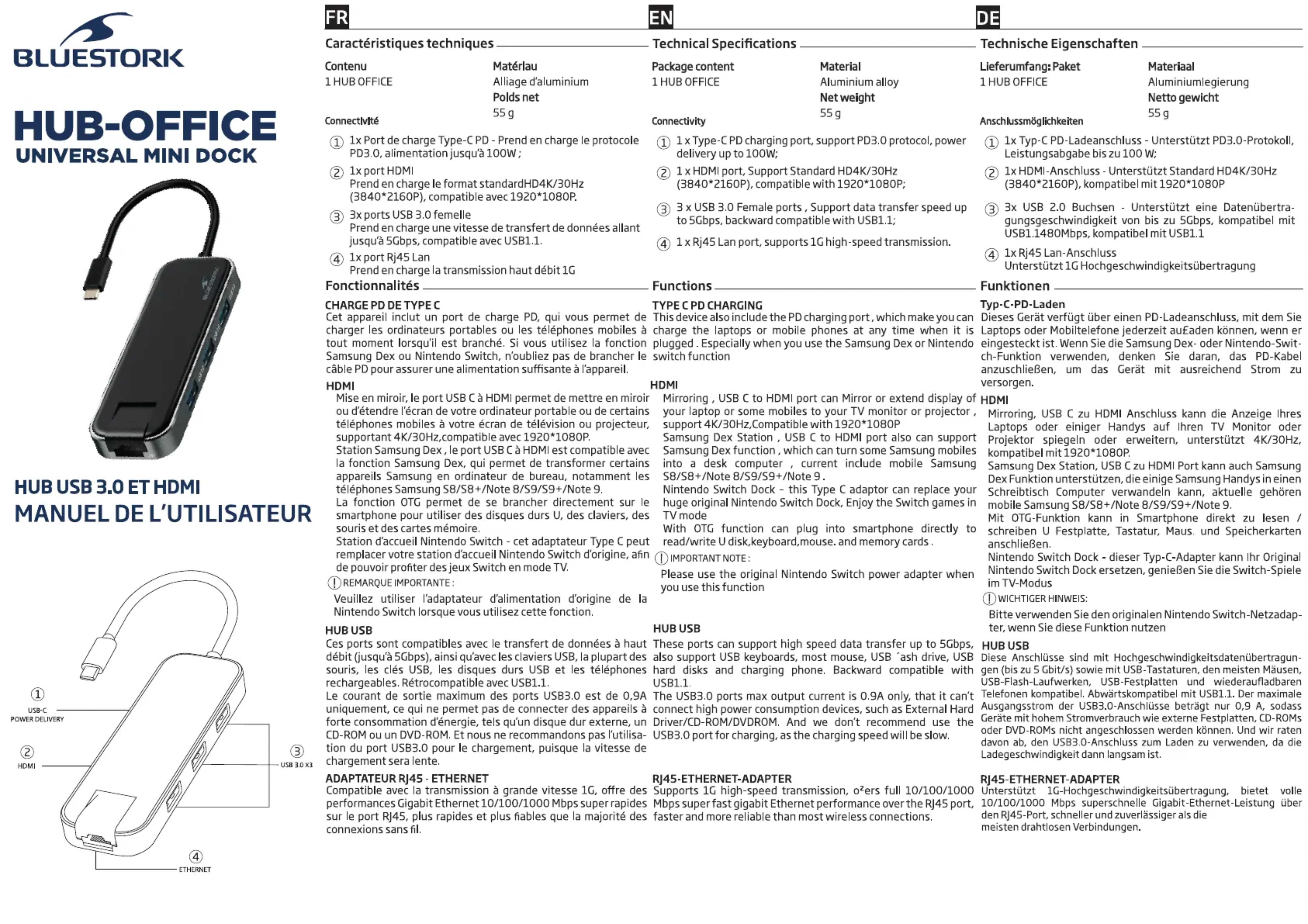 HUB OFFICE - Station d'accueil universelle BLUESTORK - Notice d'utilisation et mode d'emploi gratuit