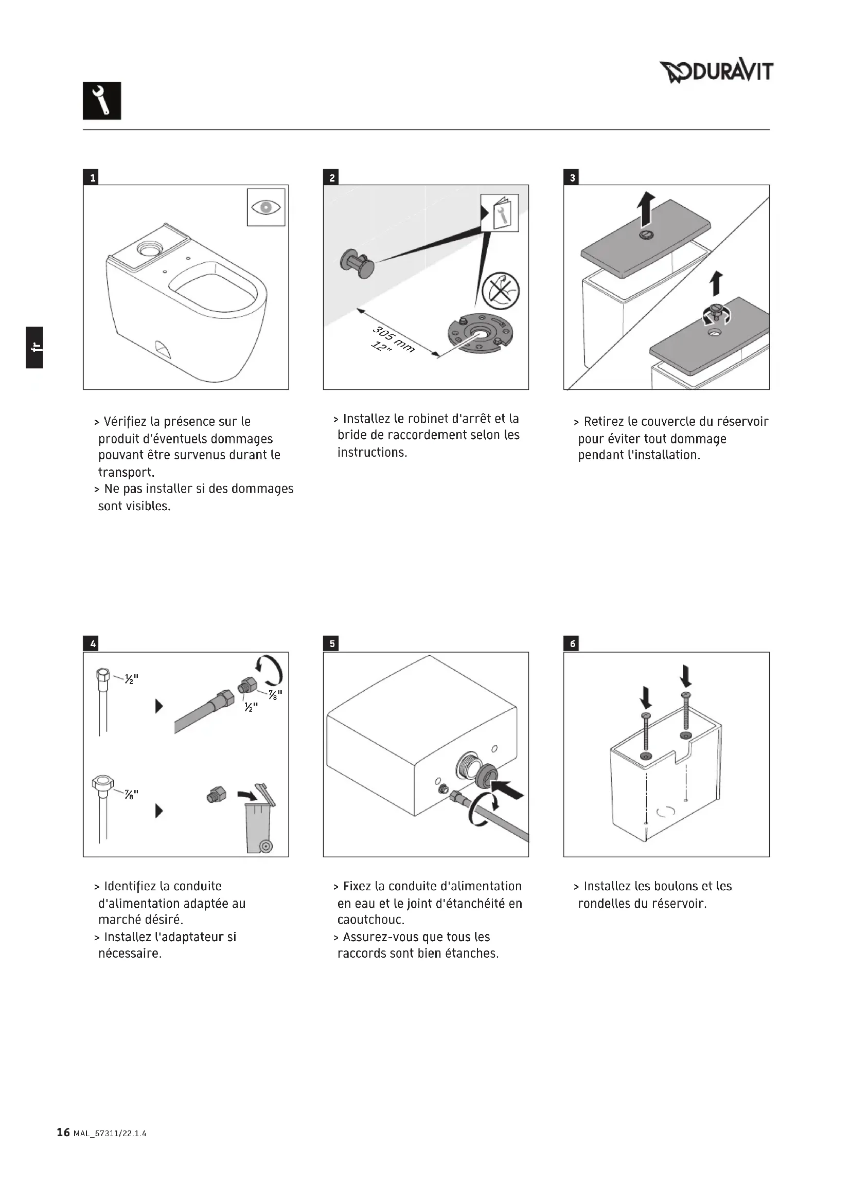 > Installez les boulons et les rondelles du réservoir. > Vérifiez la présence sur le produit d’éventuels dommages pouvant être survenus durant le transport. > Ne pas installer si des dommages sont visibles. > Retirez le couvercle du réservoir pour éviter tout dommage pendant l'installation. > Identifiez la conduite d'alimentation adaptée au marché désiré. > Installez l'adaptateur si nécessaire. > Installez le robinet d'arrêt et la bride de raccordement selon les instructions. > Fixez la conduite d'alimentation en eau et le joint d'étanchéité en caoutchouc. > Assurez-vous que tous les raccords sont bien étanches. 16 MAL_57311/22.1.4