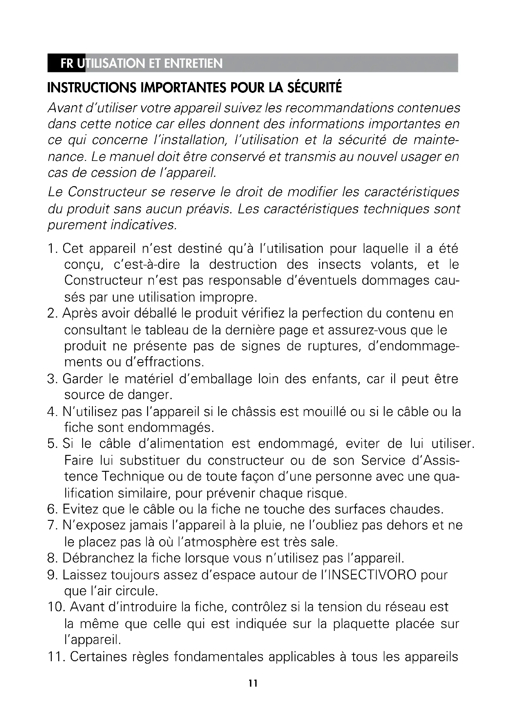 conçu, c’est-à-dire la destruction des insects volants, et le Constructeur n’est pas responsable d’éventuels dommages cau- sés par une utilisation impropre.