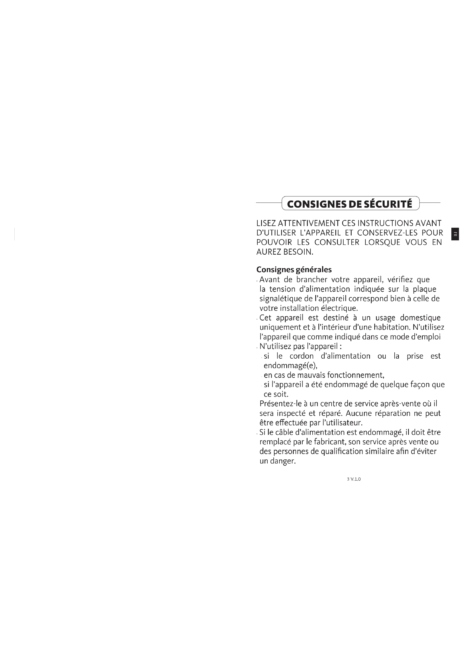 3 V.1.0• N’immergez jamais l’appareil, son cordon d’alimentation ou la prise de courant dans l’eau ou tout autre liquide. Veillez à ne pas exposer le ventilateur aux projections d’eau.