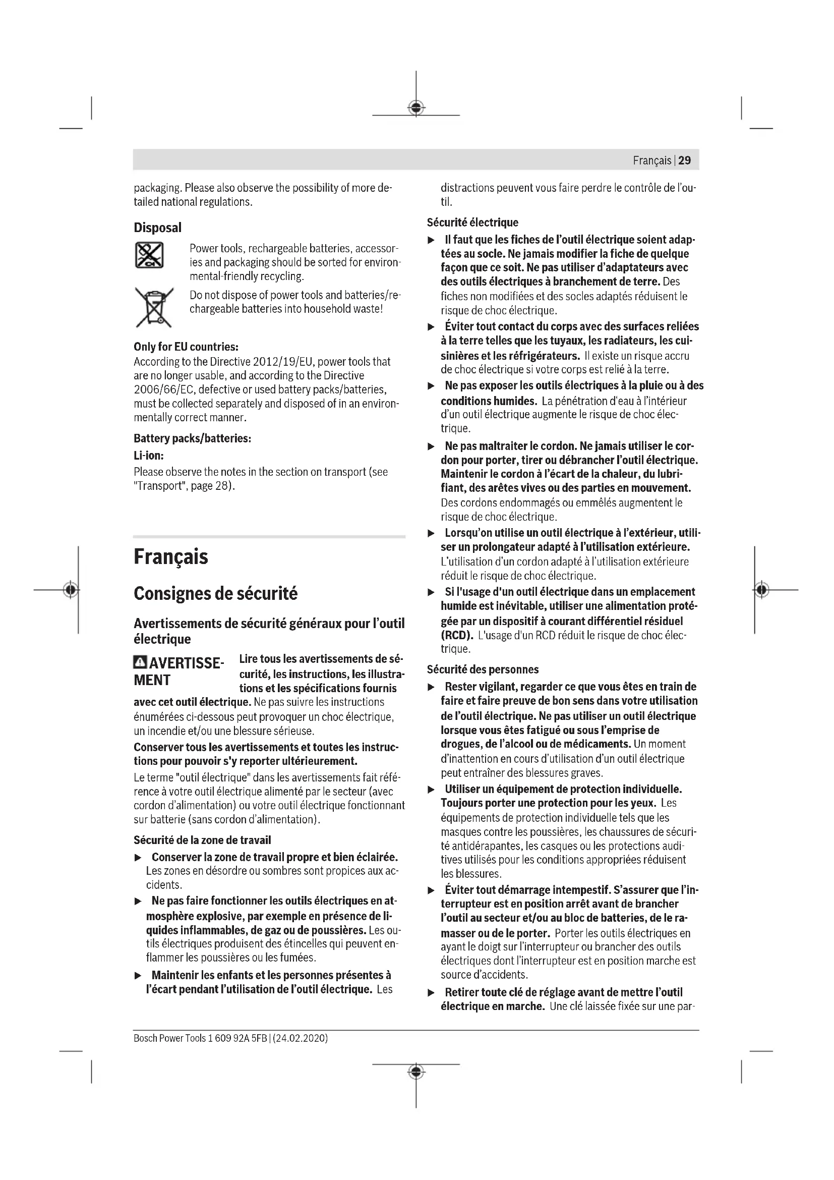 You can use the guide rail (41) to produce straight cuts. The adhesive layer prevents the guide rail from slipping and preserves the surface of the workpiece. The guide rail's coat- ing allows the power tool to glide more easily. Place the circular saw directly on the guide rail (41). Fasten the guide rail (41) to the workpiece using suitable clamping devices, e.g. screw clamps, so that the narrow side of the guide rail (41) is facing the saw blade. The guide rail (41) must not protrude over the edge of the workpiece being sawn into. Switch on the power tool and push it gently in the cutting dir- ection, guiding it evenly. The connector (43) can be used to join two guide rails. The four screws in the connector are used for the purpose of clamping. The groove (44) is suitable for guide rail systems from Bosch and Mafell. The groove (45) is suitable for guide rail systems from Fes- tool and Makita. Recommendations for Optimal Handling of the Battery Protect the battery against moisture and water. Only store the battery within a temperature range of −20 to 50°C. Do not leave the battery in your car in the summer, for example. Occasionally clean the ventilation slots on the battery using a soft brush that is clean and dry. A significantly reduced operating time after charging indic- ates that the battery has deteriorated and must be replaced. Follow the instructions on correct disposal. Maintenance and Service Maintenance and Cleaning u Remove the battery from the power tool before carry- ing out work on the power tool (e.g. maintenance, changing tool, etc.). The battery should also be re- moved for transport and storage. There is risk of injury from unintentionally pressing the on/off switch. Bosch Power Tools 1 609 92A 5FB | (24.02.2020)28 | English u To ensure safe and efficient operation, always keep the power tool and the ventilation slots clean. The retracting blade guard must always be able to move freely and retract automatically. It is therefore important to keep the area around the retracting blade guard clean at all times. Remove dust and chips with a paintbrush. Non-coated saw blades can be protected against corrosion using a thin layer of acid-free oil. Remove the oil again before sawing as failure to do so will stain the wood. Resin or glue residue on the saw blade has a detrimental ef- fect on the quality of the cut. You should therefore clean saw blades straight after use. After-Sales Service and Application Service Our after-sales service responds to your questions concern- ing maintenance and repair of your product as well as spare parts. You can find explosion drawings and information on spare parts at: www.bosch-pt.com The Bosch product use advice team will be happy to help you with any questions about our products and their accessor- ies. In all correspondence and spare parts orders, please always include the 10‑digit article number given on the nameplate of the product. Australia, New Zealand and Pacific Islands Robert Bosch Australia Pty. Ltd. Power Tools Locked Bag 66 Clayton South VIC 3169 Customer Contact Center Inside Australia: Phone: (01300) 307044 Fax: (01300) 307045 Inside New Zealand: Phone: (0800) 543353 Fax: (0800) 428570 Outside AU and NZ: Phone: +61 3 95415555 www.bosch-pt.com.au www.bosch-pt.co.nz Great Britain Robert Bosch Ltd. (B.S.C.) P.O. Box 98 Broadwater Park North Orbital Road Denham Uxbridge UB 9 5HJ At www.bosch-pt.co.uk you can order spare parts or arrange the collection of a product in need of servicing or repair. Tel. Service: (0344) 7360109 E-Mail: boschservicecentre@bosch.com Ireland Origo Ltd. Unit 23 Magna Drive Magna Business Park City West Dublin 24 Tel. Service: (01) 4666700 Fax: (01) 4666888 Republic of South Africa Customer service Hotline: (011) 6519600 Gauteng – BSC Service Centre 35 Roper Street, New Centre Johannesburg Tel.: (011) 4939375 Fax: (011) 4930126 E-Mail: bsctools@icon.co.za KZN – BSC Service Centre Unit E, Almar Centre 143 Crompton Street Pinetown Tel.: (031) 7012120 Fax: (031) 7012446 E-Mail: bsc.dur@za.bosch.com Western Cape – BSC Service Centre Democracy Way, Prosperity Park Milnerton Tel.: (021) 5512577 Fax: (021) 5513223 E-Mail: bsc@zsd.co.za Bosch Headquarters Midrand, Gauteng Tel.: (011) 6519600 Fax: (011) 6519880 E-Mail: rbsa-hq.pts@za.bosch.com Armenia, Azerbaijan, Georgia Robert Bosch Ltd. David Agmashenebeli ave. 61 0102 Tbilisi, Georgia Tel. +995322510073 www.bosch.com Kyrgyzstan, Mongolia, Tajikistan, Turkmenistan, Uzbekistan TOO “Robert Bosch” Power Tools, After Sales Service Muratbaev Ave., 180 050012, Almaty, Kazakhstan Service Email: service.pt.ka@bosch.com Official Website: www.bosch.com, www.bosch-pt.com Transport The contained lithium-ion batteries are subject to the Dan- gerous Goods Legislation requirements. The batteries are suitable for road-transport by the user without further re- strictions. When shipping by third parties (e.g.: by air transport or for- warding agency), special requirements on packaging and la- belling must be observed. For preparation of the item being shipped, consulting an expert for hazardous material is re- quired. Dispatch battery packs only when the housing is undam- aged. Tape or mask off open contacts and pack up the bat- tery in such a manner that it cannot move around in the 1 609 92A 5FB | (24.02.2020) Bosch Power ToolsFrançais | 29 packaging. Please also observe the possibility of more de- tailed national regulations. Disposal Power tools, rechargeable batteries, accessor- ies and packaging should be sorted for environ- mental-friendly recycling. Do not dispose of power tools and batteries/re- chargeable batteries into household waste! Only for EU countries: According to the Directive 2012/19/EU, power tools that are no longer usable, and according to the Directive 2006/66/EC, defective or used battery packs/batteries, must be collected separately and disposed of in an environ- mentally correct manner. Battery packs/batteries: Li-ion: Please observ