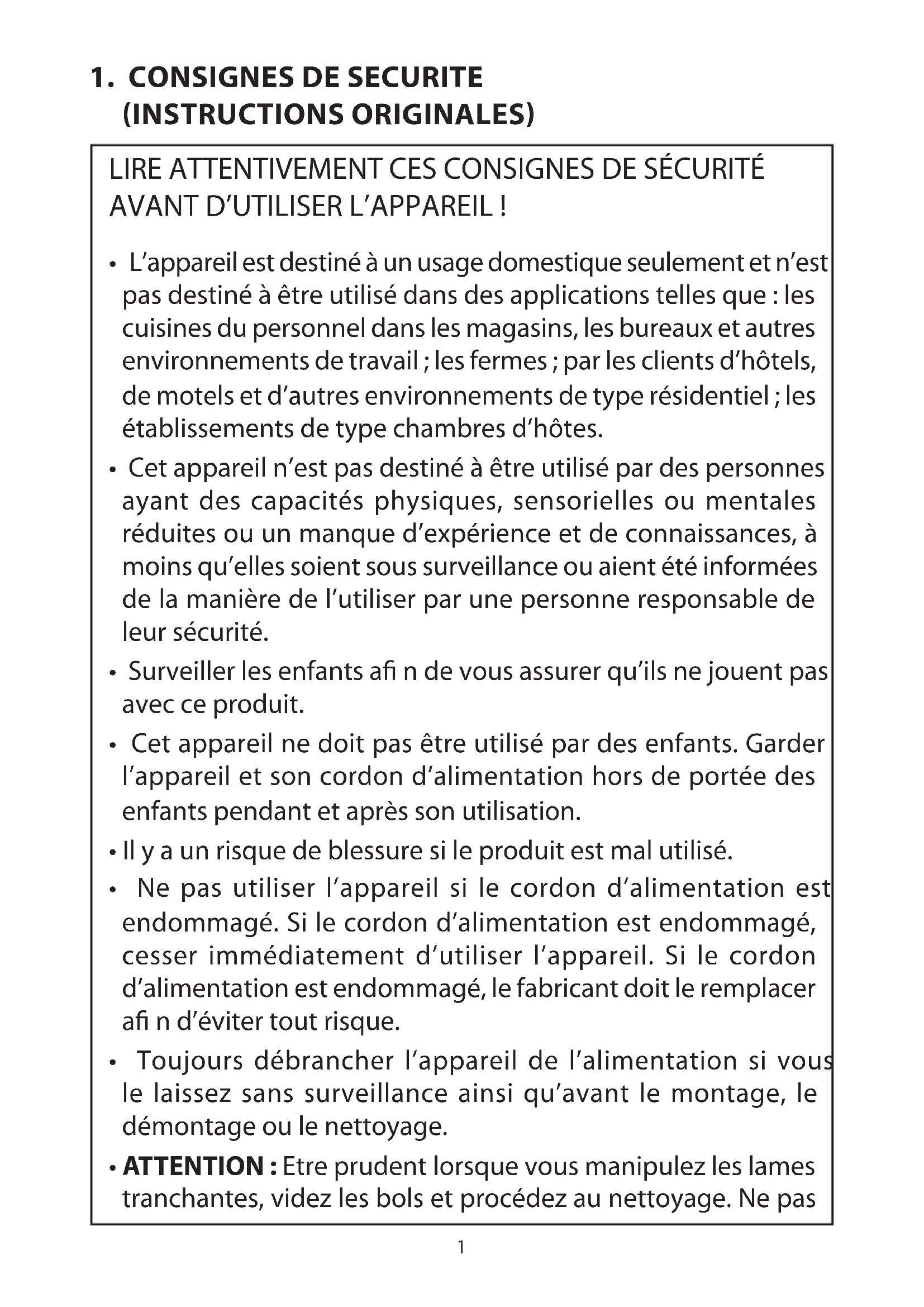 - ATTENTION : Etre prudent lorsque vous manipulez les lames tranchantes, videz les bols et procédez au nettoyage. Ne pas2 toucher les lames métalliques ou les bords tranchants des disques. Toutes ces pièces sont extrêmement tranchantes et un contact peut entraîner des blessures.