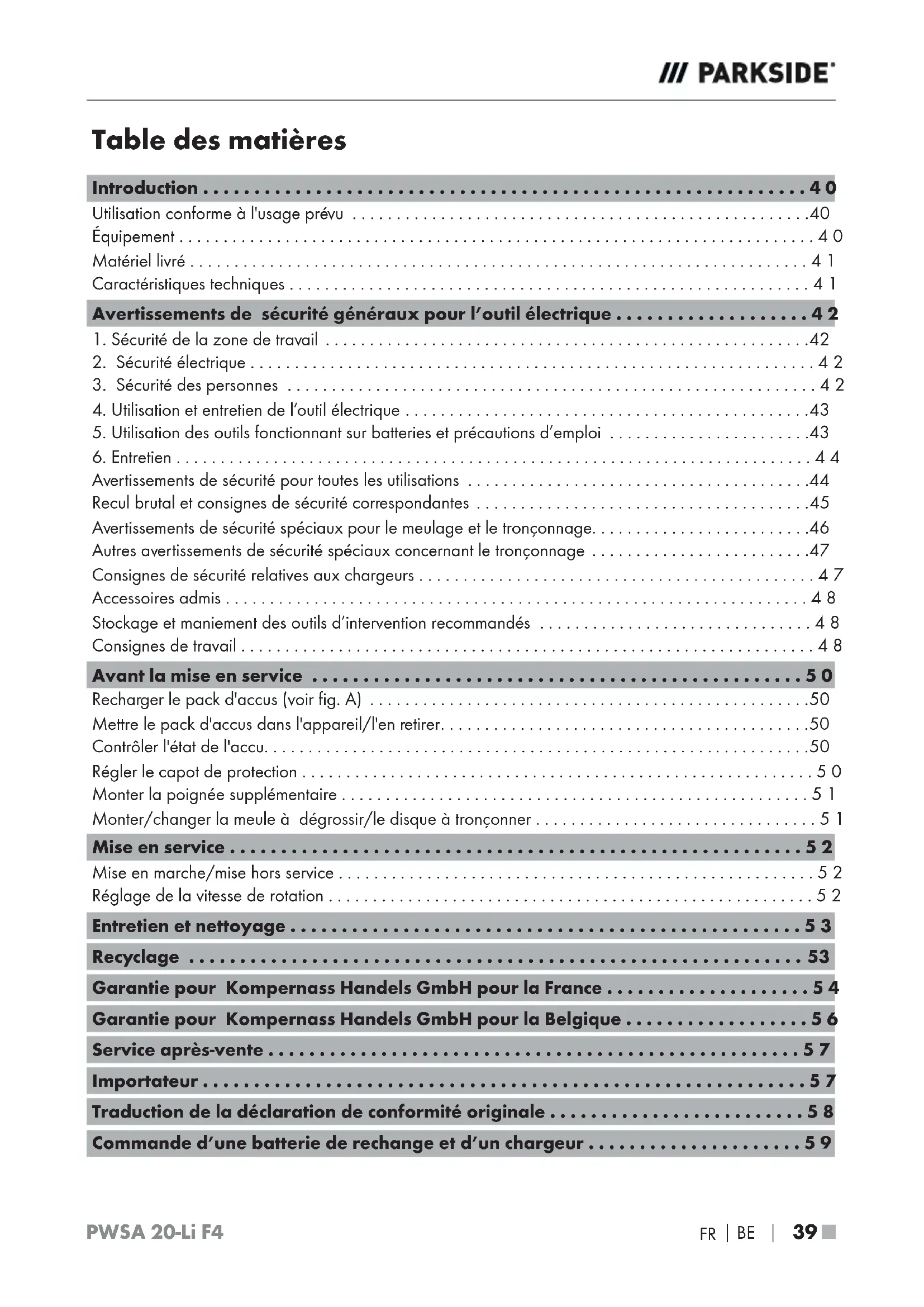 FIL 20 V PWSA 20-Li F4 Introduction Nous vous félicitons pour l'achat de votre nouvel appareil. Vous venez ainsi d'opter pour un produit de grande qualité. Le mode d'emploi fait partie de ce produit. Il contient des remarques importantes concernant la sécurité, l'usage et le recyclage. Avant d'utiliser le produit, veuillez vous familiariser avec toutes les consignes d'utilisation et de sécurité. N'utilisez le produit que conformément aux con- signes et pour les domaines d'utilisation prévus. Si vous cédez le produit à un tiers, remettez-lui également tous les documents. Utilisation conforme à l'usage prévu L'appareil est conçu pour le tronçonnage, le dé- grossissage de métal, béton ou carrelages sans utiliser d'eau. Toute utilisation autre ou modification de l'appareil est considérée comme non conforme et s'accompagne de risques d'accident non négli- geables. Nous déclinons toute responsabilité pour les dommages causés résultant d'une utilisation non conforme. L'appareil n'est pas conçu pour un usage professionnel. Explication des symboles Lisez le mode d'emploi d'origine et les consignes de sécurité avant la mise en service. L'utilisation de disques à tronçonner ou de meules à dégrossir endommagés est dangereuse et peut occasionner des blessures graves! Diamètre du disque Meuleuse d'angle sans fil Porter des lunettes de protection! Porter une protection auditive! Porter des chaussures de sécurité! Porter des gants de protection! Porter un masque de protection anti-poussière! Non admis pour la rectification sous arrosage Non admis pour la rectification latérale Conçue pour le ponçage de métaux Utilisez toujours l‘outil électrique à deux mains Équipement Interrupteur MARCHE/ARRÊT Touche de déverrouillage du pack d'accus Pack d'accus* Touche d'état d'accu LED d'affichage de l'accu Molette de présélection de la vitesse Poignée supplémentaire Capot de protection Touche de retenue de broche Filetage (3 x) pour poignée supplémentaire Bague de montage Vis Fixation du capot de protection Chargeur rapide (voir fig. A)* LED de contrôle de chargement rouge (voir fig. A) LED de contrôle de chargement verte (voir fig. A) Broche de fixation (voir fig. C) Bride de fixation (voir fig. C) Écrou de serrage (voir fig. C) Clé de montage à deux ergots (voir fig. D) CavitésPWSA 20-Li F4
