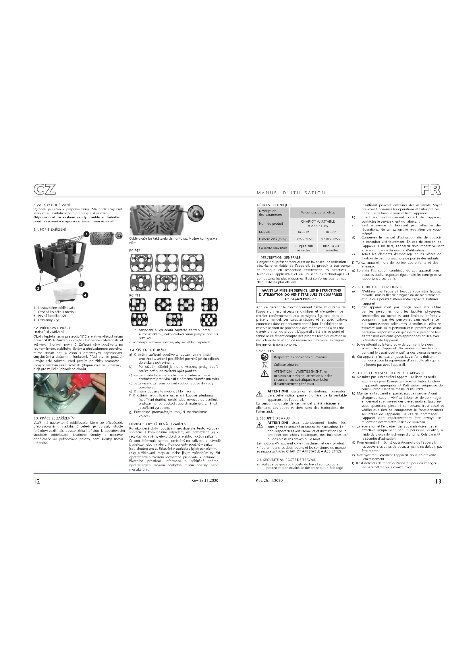 Rev. 25.11.2020 Description des paramètres Valeur des paramètres Nom du produit CHARIOT AJUSTABLE À ASSIETTES Modèle RC-PT2 RC-PT1 Dimensions [mm] 930x720x775 1090x720x775 Capacité maximale Jusqu'à 300 assiettes Jusqu'à 400 assiettes