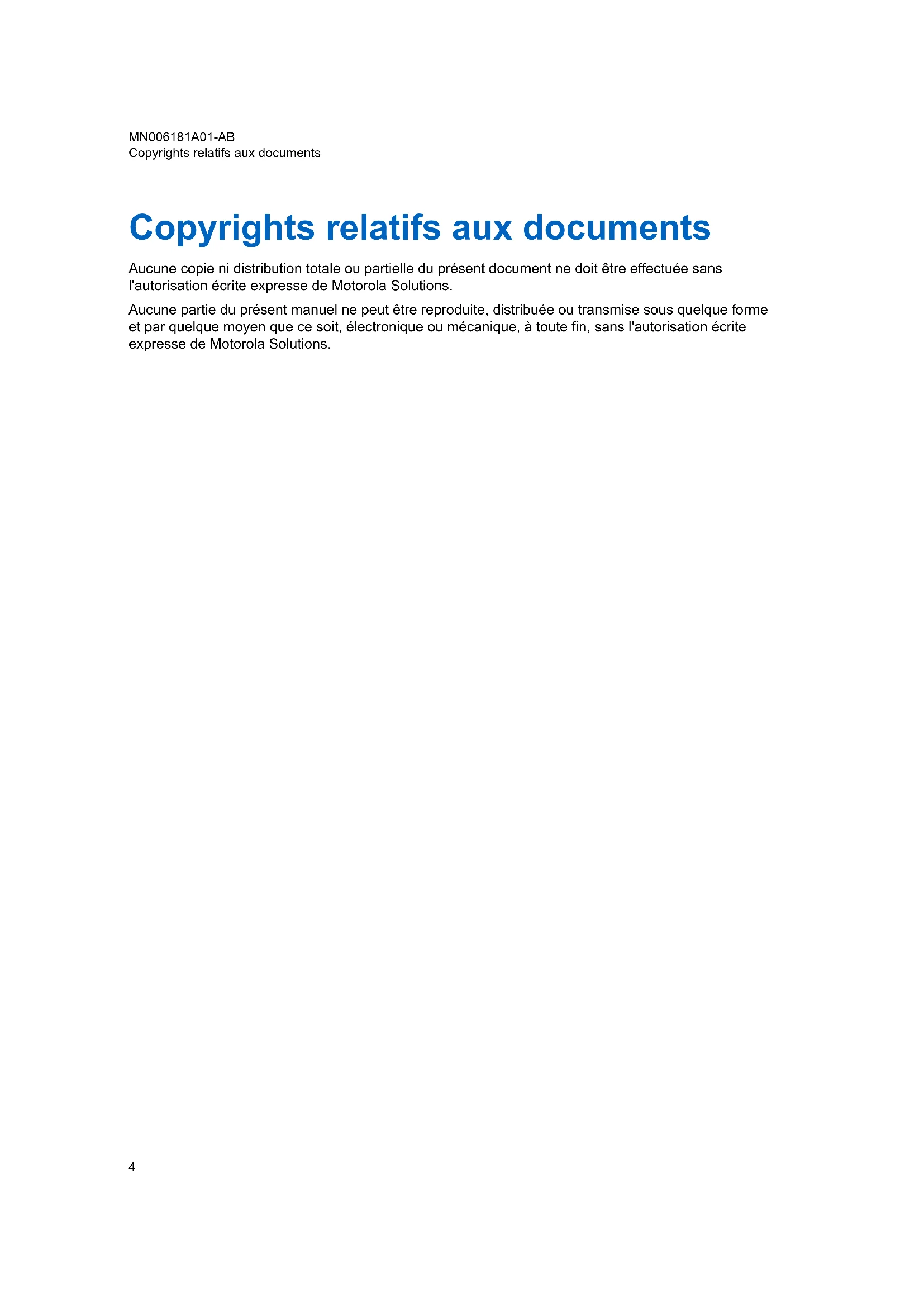 MN006181A01-AB Sommaire 3Copyrights relatifs aux documents Aucune copie ni distribution totale ou partielle du présent document ne doit être effectuée sans l'autorisation écrite expresse de Motorola Solutions. Aucune partie du présent manuel ne peut être reproduite, distribuée ou transmise sous quelque forme et par quelque moyen que ce soit, électronique ou mécanique, à toute fin, sans l'autorisation écrite expresse de Motorola Solutions. MN006181A01-AB Copyrights relatifs aux documents 4Limitation de responsabilité Les informations contenues dans le présent document sont étudiées attentivement et sont considérées comme totalement fiables. Aucune responsabilité ne peut toutefois être acceptée pour d'éventuelles inexactitudes. En outre, Motorola Solutions se réserve le droit de modifier tout produit concerné par le présent document, afin d'améliorer la lisibilité, le fonctionnement ou la conception. Motorola Solutions n'accepte aucune responsabilité résultant des applications ou de l'utilisation d'un produit ou circuit décrit dans le présent document et n'inclut aucune licence dans ses droits de brevet ni les droits d'autre nature. MN006181A01-AB Limitation de responsabilité 5Copyrights relatifs aux logiciels informatiques Les produits Motorola Solutions décrits dans ce manuel peuvent inclure des programmes informatiques protégés par copyright de Motorola Solutions et stockés dans des mémoires à semi- conducteurs ou sur tout autre support. La législation des États-Unis, ainsi que celle d'autres pays, réservent à Motorola Solutions certains droits de copyright exclusifs concernant les programmes informatiques ainsi protégés, incluant sans limitations, le droit exclusif de copier ou de reproduire, sous quelque forme que ce soit, lesdits programmes. En conséquence, il est interdit de copier, reproduire, modifier, faire de l'ingénierie inverse ou distribuer, de quelque manière que ce soit, les programmes informatiques de Motorola Solutions protégés par copyright contenus dans les produits Motorola Solutions décrits dans ce manuel sans l'autorisation expresse et écrite de Motorola Solutions. En outre, l'acquisition de ces produits Motorola Solutions ne saurait en aucun cas conférer, directement, indirectement ou de toute autre manière, aucune licence, aucun droit d'auteur, brevet ou demande de brevet appartenant à Motorola Solutions, autres que la licence habituelle d'utilisation non exclusive qui découle légalement de la vente du produit. MN006181A01-AB Copyrights relatifs aux logiciels informatiques 6Informations sur la sécurité des batteries, des chargeurs et des accessoires audio Ce document contient des consignes d'utilisation et de sécurité importantes. Veuillez les lire attentivement et les conserver pour vous y référer à l'avenir. Avant d'utiliser le chargeur de batterie, lisez attentivement toutes les instructions et mises en garde sur :