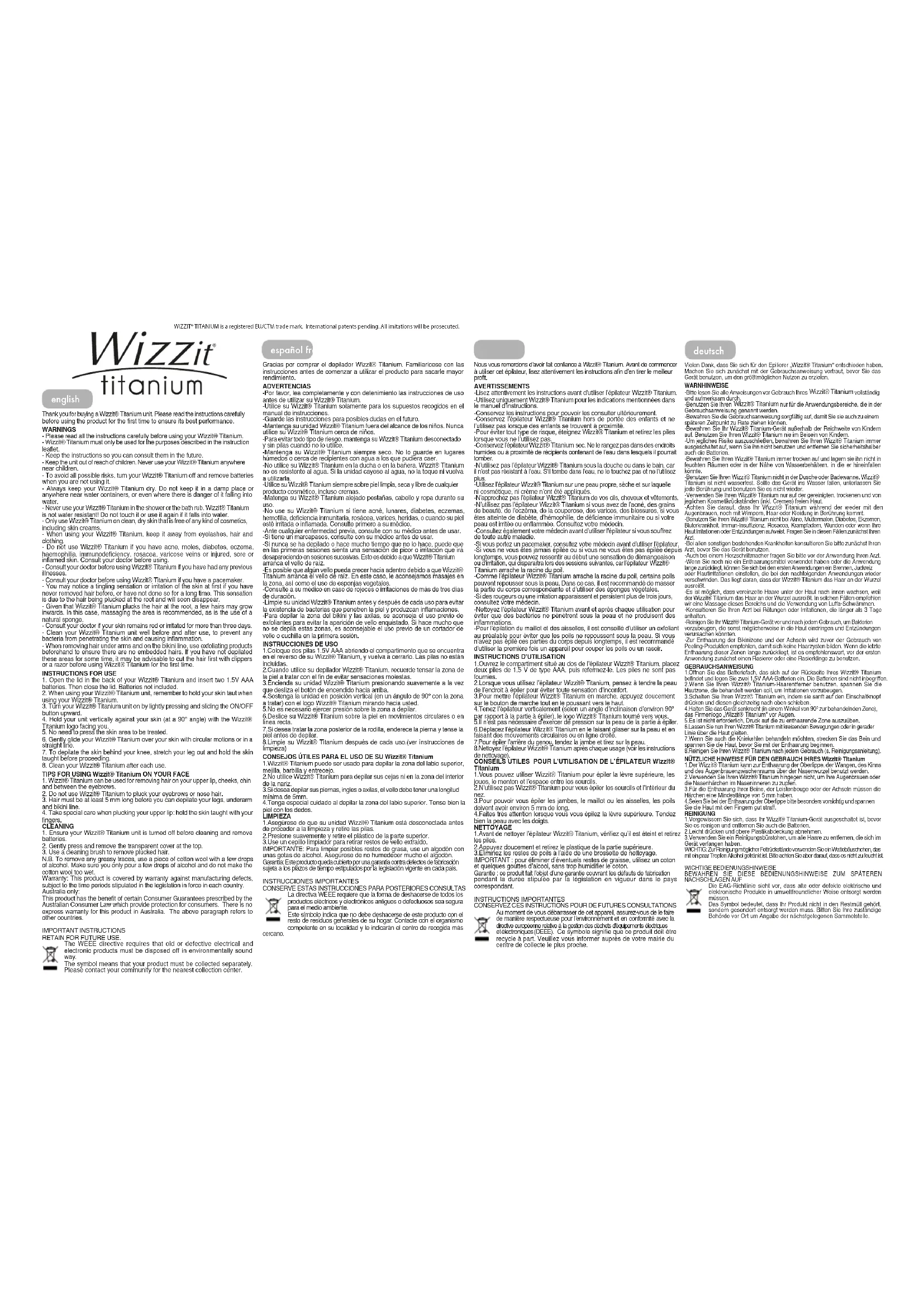 La directiva WEEE requiere que la forma de deshacerse de todos los productos eléctricos y electrónicos antiguos o defectuosos sea segura para el medio ambiente. Este símbolo indica que no debe deshacerse de este producto con el resto de residuos generales de su hogar. Contacte con el organismo competente en su localidad y le indicarán el centro de recogida más cercano. Nous vous remercions d’avoir fait confiance à Wizzit® Titanium. Avant de commencer à utiliser cet épilateur, lisez attentivement les instructions afin d’en tirer le meilleur profit. AVERTISSEMENTS -Lisez attentivement les instructions avant d’utiliser l’épilateur Wizzit® Titanium. -Utilisez uniquement Wizzit® Titanium pour les indications mentionnées dans le manuel d’instructions. -Conservez les instructions pour pouvoir les consulter ultérieurement. -Conservez l’épilateur Wizzit® Titanium hors de portée des enfants et ne l’utilisez pas lorsque des enfants se trouvent à proximité. -Pour éviter tout type de risque, éteignez Wizzit® Titanium et retirez les piles lorsque vous ne l’utilisez pas. -Conservez l’épilateur Wizzit® Titanium sec. Ne le rangez pas dans des endroits humides ou à proximité de récipients contenant de l’eau dans lesquels il pourrait tomber. -N’utilisez pas l’épilateur Wizzit® Titanium sous la douche ou dans le bain, car il n’est pas résistant à l’eau. S’il tombe dans l’eau, ne le touchez pas et ne l’utilisez plus. -Utilisez l’épilateur Wizzit® Titanium sur une peau propre, sèche et sur laquelle ni cosmétique, ni crème n’ont été appliqués. -N’approchez pas l’épilateur Wizzit® Titanium de vos cils, cheveux et vêtements. -N’utilisez pas l’épilateur Wizzit® Titanium si vous avez de l’acné, des grains de beauté, de l’eczéma, de la couperose, des varices, des blessures, si vous êtes atteinte de diabète, d’hémophilie, de déficience immunitaire ou si votre peau est irritée ou enflammée. Consultez votre médecin. -Consultez également votre médecin avant d'utiliser l'épilateur si vous souffrez de toute autre maladie. -Si vous portez un pacemaker, consultez votre médecin avant d’utiliser l’épilateur. -Si vous ne vous êtes jamais épilée ou si vous ne vous êtes pas épilée depuis longtemps, vous pouvez ressentir au début une sensation de démangeaison ou d’irritation, qui disparaîtra lors des sessions suivantes, car l’épilateur Wizzit® Titanium arrache la racine du poil. -Comme l’épilateur Wizzit® Titanium arrache la racine du poil, certains poils peuvent repousser sous la peau. Dans ce cas, il est recommandé de masser la partie du corps correspondante et d’utiliser des éponges végétales. -Si des rougeurs ou une irritation apparaissent et persistent plus de trois jours, consultez votre médecin. -Nettoyez l’épilateur Wizzit® Titanium avant et après chaque utilisation pour éviter que des bactéries ne pénètrent sous la peau et ne produisent des inflammations. -Pour l’épilation du maillot et des aisselles, il est conseillé d’utiliser un exfoliant au préalable pour éviter que les poils ne repoussent sous la peau. Si vous n’avez pas épilé ces parties du corps depuis longtemps, il est recommandé d’utiliser la première fois un appareil pour couper les poils ou un rasoir.