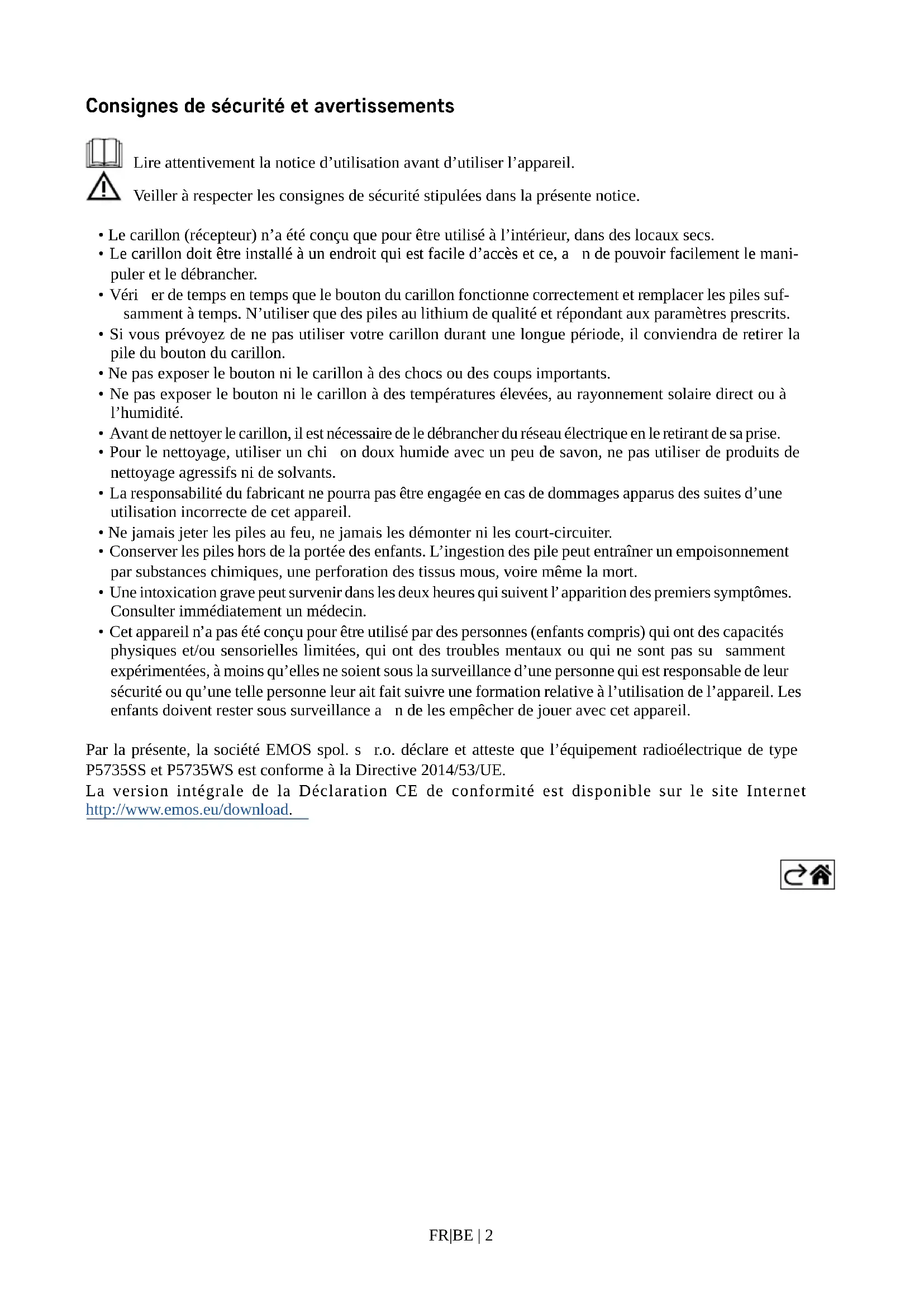 - Cet appareil n’a pas été conçu pour être utilisé par des personnes (enfants compris) qui ont des capacités physiques et/ou sensorielles limitées, qui ont des troubles mentaux ou qui ne sont pas susamment expérimentées, à moins qu’elles ne soient sous la surveillance d’une personne qui est responsable de leur sécurité ou qu’une telle personne leur ait fait suivre une formation relative à l’utilisation de l’appareil. Les enfants doivent rester sous surveillance an de les empêcher de jouer avec cet appareil. Par la présente, la société EMOS spol. sr.o. déclare et atteste que l’équipement radioélectrique de type P5735SS et P5735WS est conforme à la Directive 2014/53/UE. La version intégrale de la Déclaration CE de conformité est disponible sur le site Internet http://www.emos.eu/download.FR|BE | 3 80 mm 38 mm 19 mm 65 mm 80 mm 92 mm Spécications techniques Portée du signal : jusqu’à 150 m à l’air libre (dans un espace construit, elle pourra tomber à 20 % de cette valeur) Bouton : étanche à l’eau ; indice de protection IP44 Appariement du carillon aux boutons : Fonction de «self-learning» (auto-apprentissage) Capacité d’appariement : au maximum 8 boutons pour 1 carillon, au maximum 2 boutons pour 1 carillon dans l’application EMOS GoS- mart Nombre de mélodies : 52 Fréquence de la transmission : 433,92 MHz, 10 mW e.r.p. max. Alimentation du carillon : 230V AC / 50Hz Alimentation du bouton : 1 pile de 3 V (de type CR2032, fournie avec le carillon) Contenu des fournitures : ruban adhésif double faceFR|BE | 4