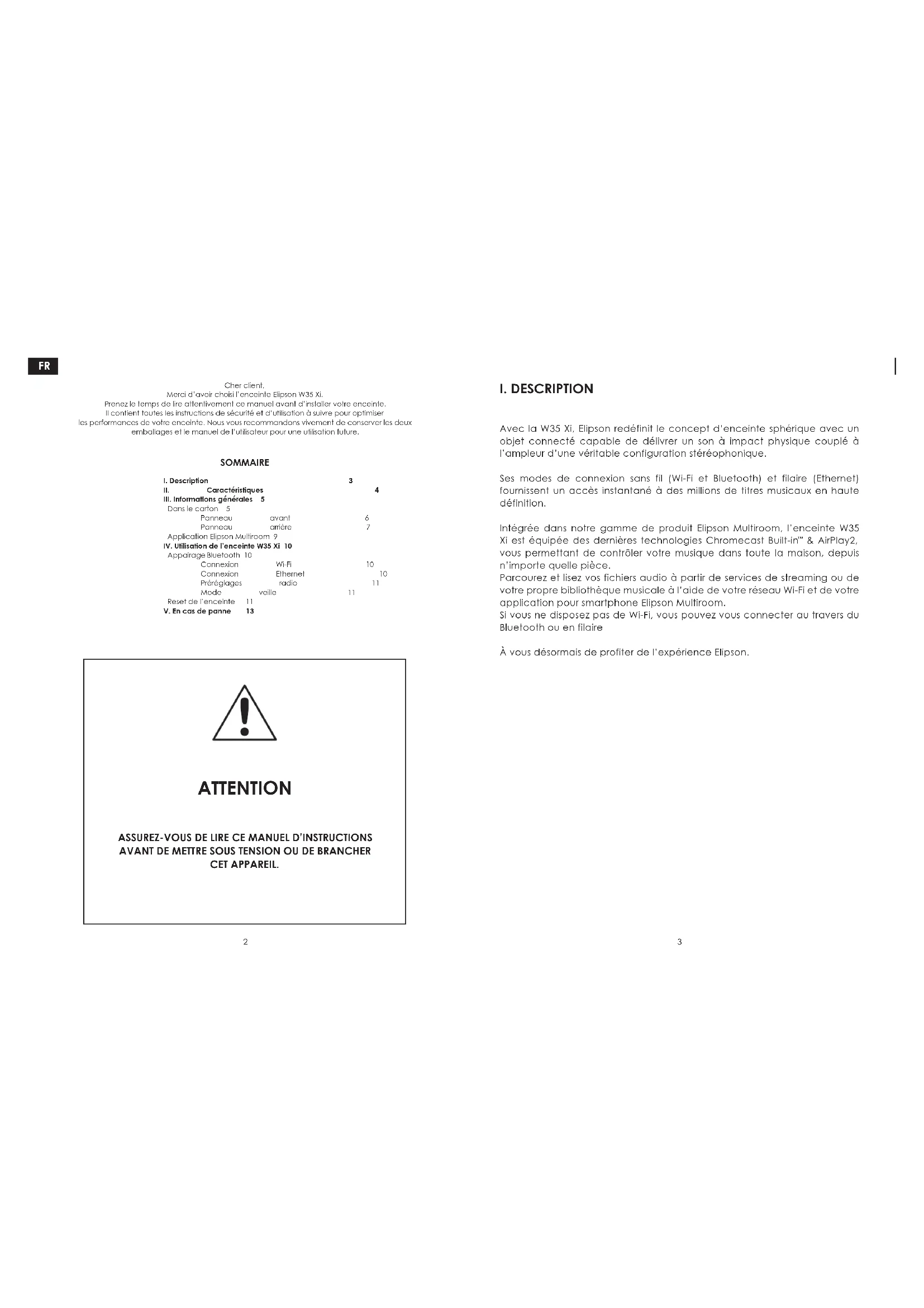 Cher client,Merci d’avoir choisi l’enceinte Elipson W35 Xi.Prenez le temps de lire attentivement ce manuel avant d’installer votre enceinte. Il contient toutes les instructions de sécurité et d’utilisation à suivre pour optimiserles performances de votre enceinte. Nous vous recommandons vivement de conserver les deuxemballages et le manuel de l’utilisateur pour une utilisation future. SOMMAIRE I. Description 3II. Caractéristiques 4III. Informations générales 5 Dans le carton 5 Panneau avant 6 Panneau arrière 7 Application Elipson Multiroom 9IV. Utilisation de l’enceinte W35 Xi 10 Appairage Bluetooth 10 Connexion Wi-Fi 10 Connexion Ethernet 10 Préréglages radio 11 Mode veille 11 Reset de l’enceinte 11V. En cas de panne 13 ATTENTION ASSUREZ-VOUS DE LIRE CE MANUEL D’INSTRUCTIONS AVANT DE METTRE SOUS TENSION OU DE BRANCHER CET APPAREIL.
