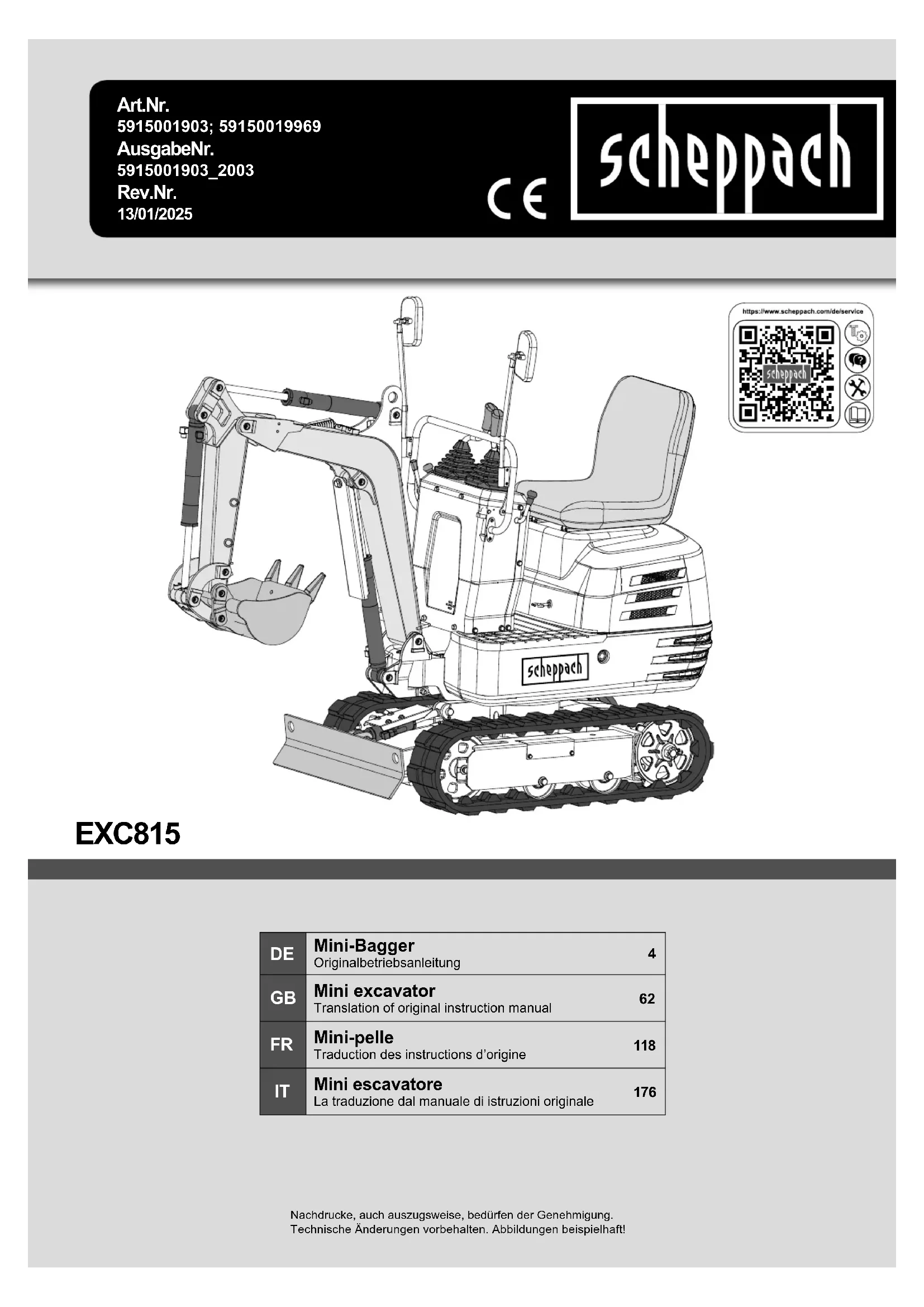 - Informations de la plaque signalétique Pièces de rechange/accessoires Référence : Arceau de protection 7915001704 Butée de pelle 7915001701 Godet râteau 7915001705 Godet de terrassement 7915001703 Grappin à godet 7915001702www.scheppach.com