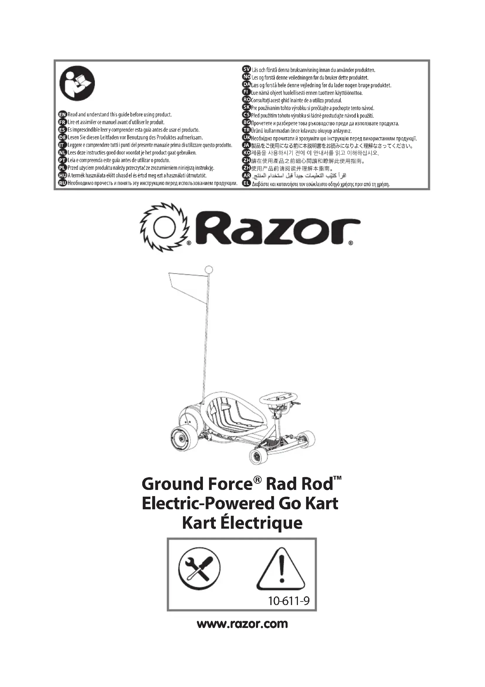 Razor USA LLC Kurokawa 3-1, Asaoku, Kawasaki, Kanagawa 215-0035 JAPAN +81 (0) 44 328 9057 Tél. +81 (0) 44 328 9067 Téléc. info@razor-asia.com Imprimé en Chine pour Razor USA LLC. Copyright ©2003-2024 Razor USA, LLC. Tous droits réservés. Razor®, Ground Force® et le logo Razor sont des marques déposées de Razor USA LLC et de ses sociétés aliées aux États-Unis et/ou dans une sélection de pays étrangers. Rad Rod™ et le logo Ground Force Rad Rod sont des marques de commerce de Razor USA LLC. In the US and Canada only: For more information regarding recycling of rechargeable batteries, call toll free 1-800-822-8837, or visit http://www.call2recycle.org Au Canada et aux États-Unis seulement : Pour plus de renseignements sur le recyclage des batteries rechargeables, appelez le numéro sans frais 1 800 822-8837 ou visitez http://www.call2recycle.org