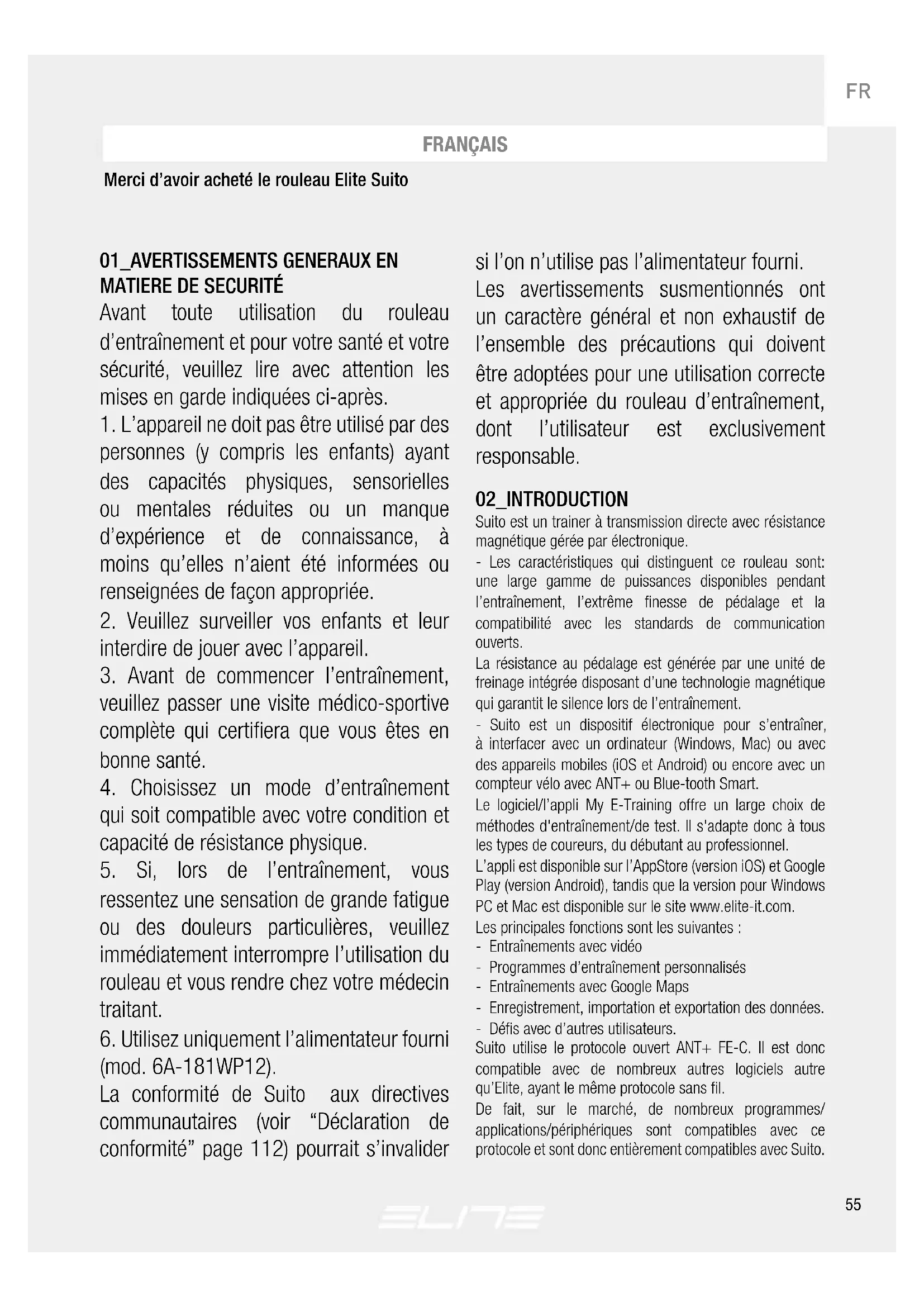 (mod. 6A-181WP12). La conformité de Suito aux directives communautaires (voir “Déclaration de conformité” page 112) pourrait s’invalider si l’on n’utilise pas l’alimentateur fourni. Les avertissements susmentionnés ont un caractère général et non exhaustif de l’ensemble des précautions qui doivent être adoptées pour une utilisation correcte et appropriée du rouleau d’entraînement, dont l’utilisateur est exclusivement responsable. 02_INTRODUCTION Suito est un trainer à transmission directe avec résistance magnétique gérée par électronique. - Les caractéristiques qui distinguent ce rouleau sont: une large gamme de puissances disponibles pendant l’entraînement, l’extrême finesse de pédalage et la compatibilité avec les standards de communication ouverts. La résistance au pédalage est générée par une unité de freinage intégrée disposant d’une technologie magnétique qui garantit le silence lors de l’entraînement. - Suito est un dispositif électronique pour s’entraîner, à interfacer avec un ordinateur (Windows, Mac) ou avec des appareils mobiles (iOS et Android) ou encore avec un compteur vélo avec ANT+ ou Blue-tooth Smart. Le logiciel/l’appli My E-Training offre un large choix de méthodes d'entraînement/de test. Il s'adapte donc à tous les types de coureurs, du débutant au professionnel. L’appli est disponible sur l’AppStore (version iOS) et Google Play (version Android), tandis que la version pour Windows PC et Mac est disponible sur le site www.elite-it.com. Les principales fonctions sont les suivantes : - Entraînements avec vidéo - Programmes d’entraînement personnalisés - Entraînements avec Google Maps - Enregistrement, importation et exportation des données. - Défis avec d’autres utilisateurs. Suito utilise le protocole ouvert ANT+ FE-C. Il est donc compatible avec de nombreux autres logiciels autre qu’Elite, ayant le même protocole sans fil. De fait, sur le marché, de nombreux programmes/ applications/périphériques sont compatibles avec ce protocole et sont donc entièrement compatibles avec Suito.56