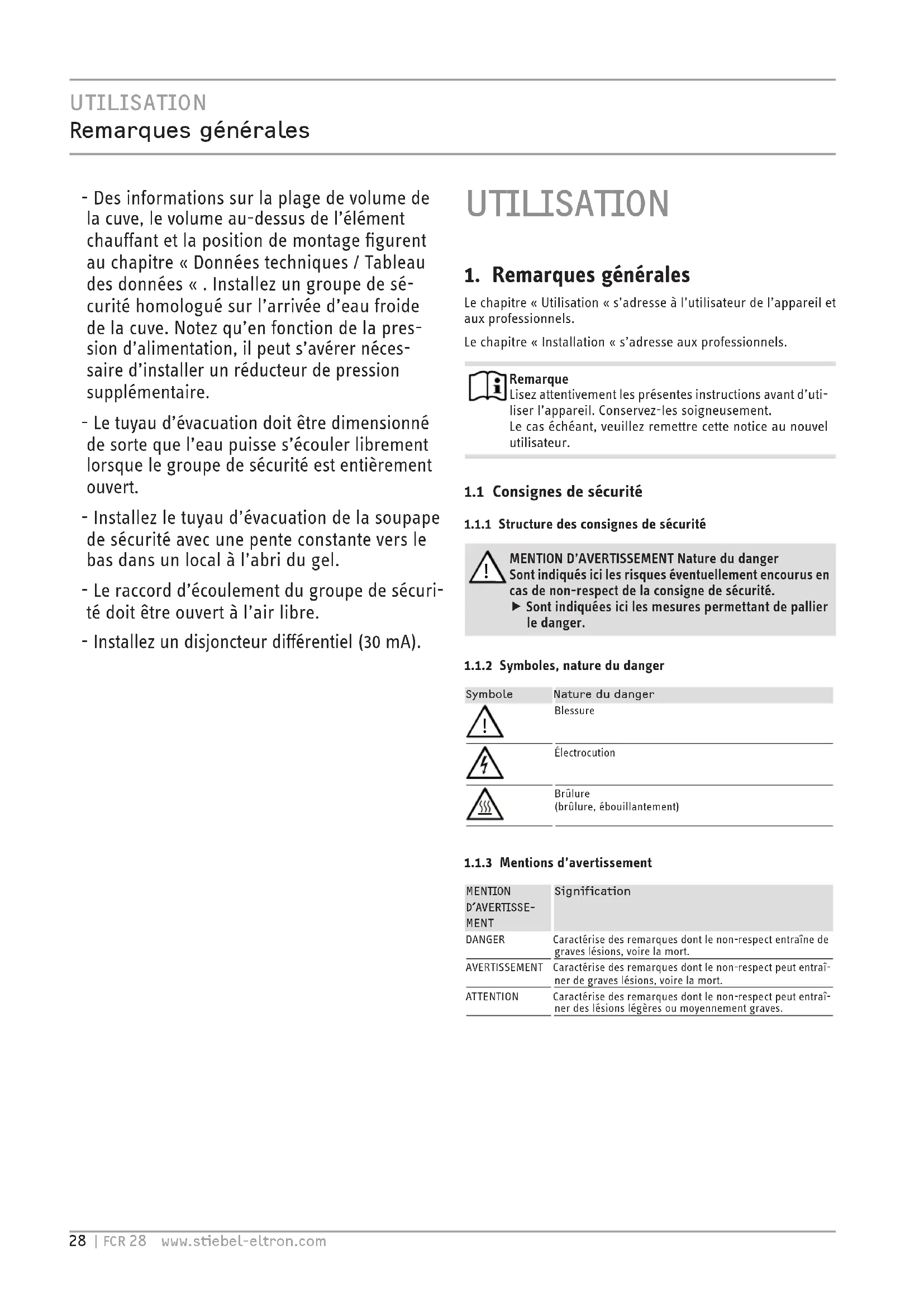 Brûlure(brûlure, ébouillantement) 1.1.3 Mentions d’avertissementMENTION D’AVERTISSE- MENT Signification DANGER Caractérise des remarques dont le non-respect entraîne de graves lésions, voire la mort. AVERTISSEMENT Caractérise des remarques dont le non-respect peut entraî- ner de graves lésions, voire la mort. ATTENTION Caractérise des remarques dont le non-respect peut entraî- ner des lésions légères ou moyennement graves. !UTILISATION Sécurité FRANÇAISwww.stiebel-eltron.com FCR 28 | 29