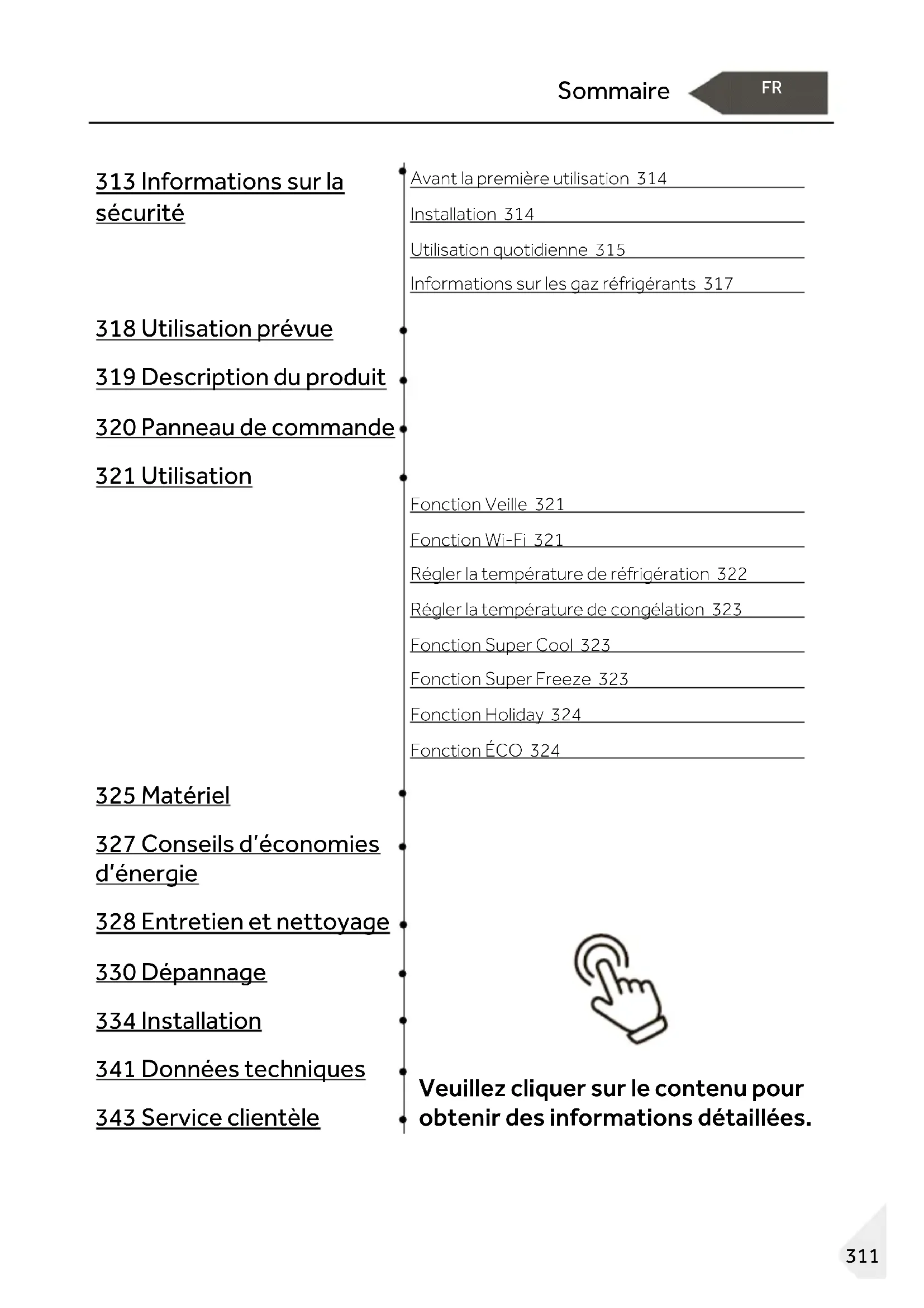 327 Conseils d’économies d’énergie 328 Entretien et nettoyage 330 Dépannage 334 Installation 341 Données techniques Veuillez cliquer sur le contenu pour obtenir des informations détaillées. 343 Service clientèleMerci