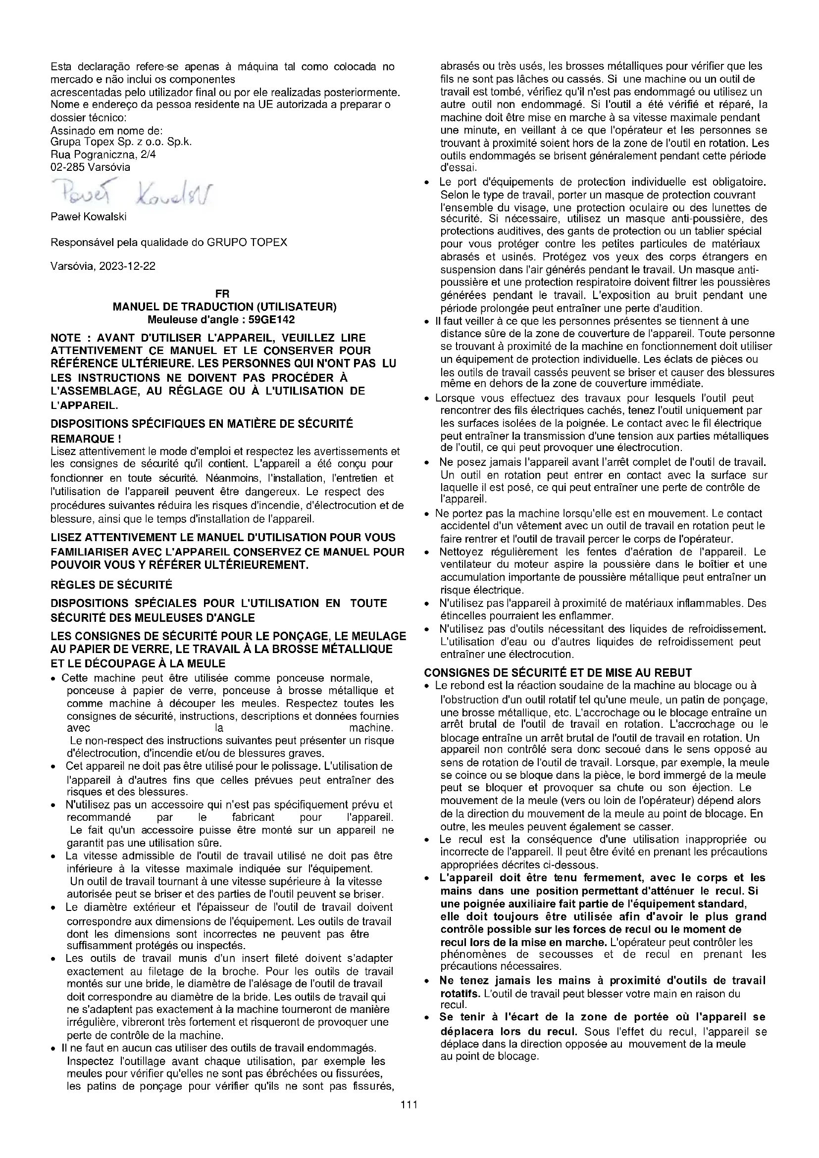 Les produits électriques ne doivent pas être jetés avec les ordures ménagères, mais doivent être déposés dans des installations appropriées pour être éliminés. Contactez votre revendeur ou les autorités locales pour obtenir des informations sur la mise au rebut. Les déchets d'équipements électriques et électroniques contiennent des substances inertes pour l'environnement. Les équipements qui ne sont pas recyclés présentent un risque potentiel pour l'environnement et la santé humaine. "Grupa Topex Spółka z ograniczoną odpowiedzialnością" Spółka komandytowa, dont le siège social est situé à Varsovie, ul. Pograniczna 2/4 (ci-après : "Grupa Topex") informe que tous les droits d'auteur sur le contenu de ce manuel (ci-après : "Manuel"), y compris, entre autres. Son texte, ses photographies, ses diagrammes, ses dessins, ainsi que sa composition, appartiennent exclusivement à Grupa Topex et font l'objet d'une protection juridique en vertu de la loi du 4 février 1994 sur le droit d'auteur et les droits connexes (Journal officiel 2006 n° 90 Poz. 631, telle qu'amendée). La copie, le traitement, la publication, la modification à des fins commerciales de l'ensemble du manuel et de ses différents éléments, sans l'accord écrit de Grupa Topex, sont strictement interdits et peuvent entraîner des responsabilités civiles et pénales. Déclaration de conformité CE Fabricant : Grupa Topex Sp. z o.o. Sp.k., Pograniczna 2/4 02-285 Warszawa Produit : Meuleuse d'angle sans fil Modèle : 58GE142 Nom commercial : GRAPHITE Numéro de série : 00001 ÷ 99999 Cette déclaration de conformité est délivrée sous la seule responsabilité du fabricant. Le produit décrit ci-dessus est conforme aux documents suivants : Directive Machines 2006/42/CE Directive sur la compatibilité électromagnétique 2014/30/EU Directive RoHS 2011/65/EU modifiée par la directive 2015/863/EU Et répond aux exigences des normes : EN 62841-1:2015+A11 ; EN IEC 62841-2-3:2021+A11 EN IEC 55014-1:2021 ; EN IEC 55014-2:2021 ; EN IEC 63000:2018 Cette déclaration ne concerne que la machine telle qu'elle est mise sur le marché et n'inclut pas les composants ajoutés par l'utilisateur final ou effectués par lui ultérieurement. Nom et adresse de la personne résidant dans l'UE autorisée à préparer le dossier technique : Signé au nom de : Grupa Topex Sp. z o.o. Sp.k. 2/4 rue Pograniczna 02-285 Varsovie Paweł Kowalski GROUPE TOPEX Responsable de la qualité Varsovie, 2023-12-22