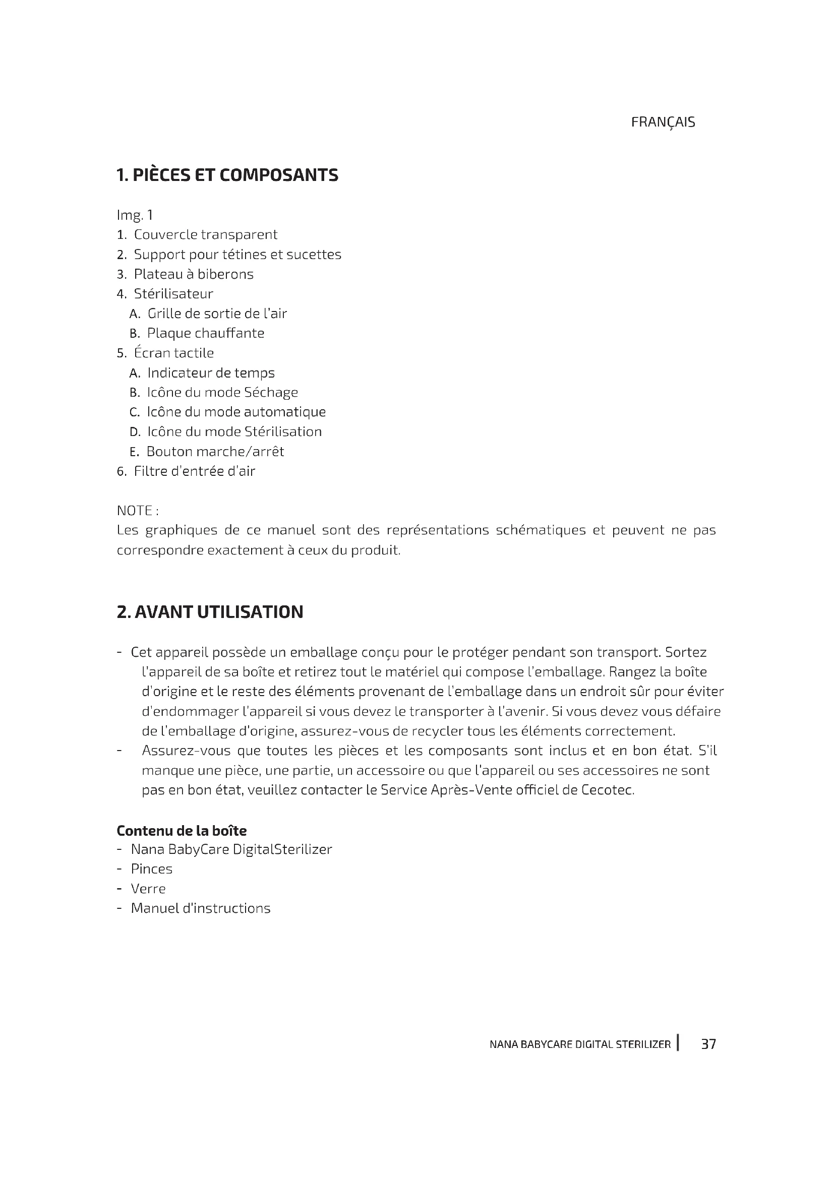 - Cet appareil possède un emballage conçu pour le protéger pendant son transport. Sortez l’appareil de sa boîte et retirez tout le matériel qui compose l’emballage. Rangez la boîte d’origine et le reste des éléments provenant de l’emballage dans un endroit sûr pour éviter d’endommager l’appareil si vous devez le transporter à l’avenir. Si vous devez vous défaire de l’emballage d’origine, assurez-vous de recycler tous les éléments correctement. - Assurez-vous que toutes les pièces et les composants sont inclus et en bon état. S’il manque une pièce, une partie, un accessoire ou que l’appareil ou ses accessoires ne sont pas en bon état, veuillez contacter le Service Après-Vente ociel de Cecotec. Contenu de la boîte - Nana BabyCare DigitalSterilizer - Pinces - Verre - Manuel d’instructionsNANA BABYCARE DIGITAL STERILIZER