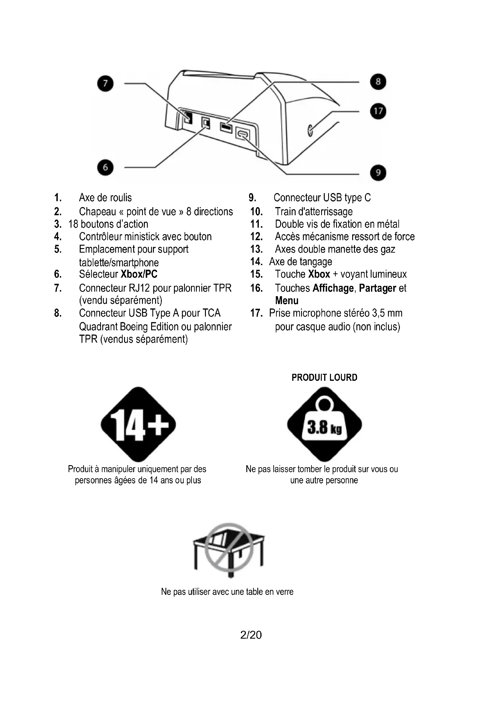 du code civil: L'action résultant des vices rédhibitoires doit être intentée par l'acquéreur dans un délai de deux ans à compter de la découverte du vice. Stipulations additionnelles à la garantie Pendant la période de garantie, Guillemot ne fournira, en principe, pas de pièce détachée car le Support Technique est seul habilité tant à ouvrir qu'à remettre en état tout produit Thrustmaster (à l'exception des remises en état que le Support Technique demanderait, par instructions écrites, au consommateur d'effectuer -par exemple en raison de la simplicité et de l'absence de confidentialité du processus de remise en état-, en lui fournissant, le cas échéant, la ou les pièces détachées nécessaires). Compte tenu de ses cycles d'innovation et pour préserver ses savoir-faire et secrets, Guillemot ne fournira, en principe, ni notice de remise en état, ni pièce détachée pour tout produit Thrustmaster dont la période de garantie est expirée. Aux États-Unis d’Amérique et au Canada, la présente garantie est limitée au mécanisme interne et au boîtier externe du produit. En aucun cas, Guillemot ou ses sociétés affiliées ne sauraient être tenues responsables envers qui que ce soit de tous dommages indirects ou dommages accessoires résultant du non respect des garanties expresses ou implicites. Certains États/Provinces n’autorisent pas la limitation sur la durée d’une garantie implicite, ou l’exclusion ou la limitation de responsabilité pour les dommages indirects ou accessoires, de sorte que les limitations ou exclusions ci-dessus peuvent ne pas vous être applicables. Cette garantie vous confère des droits spécifiques ; vous pouvez également bénéficier d’autres droits qui peuvent différer d’un État/Province à l’autre. Responsabilité Lorsque la loi applicable l’autorise, Guillemot Corporation S.A. (ci-après « Guillemot ») et ses filiales excluent toute responsabilité pour tous dommages causés par un ou plusieurs des faits suivants: (1) le produit a été modifié, ouvert, altéré, (2) l’irrespect des instructions de montage, (3) l’utilisation inappropriée ou abusive, la négligence, l’accident (un choc, par exemple), (4) l’usure normale du produit, (5) l’utilisation du produit en dehors du cadre privé, à des fins professionnelles ou commerciales (salles de jeu, formations, compétitions, par exemple). Lorsque la loi applicable l’autorise, Guillemot et ses filiales excluent toute responsabilité pour tout dommage dont la cause n’est pas liée à un défaut matériel ou à un vice de fabrication du produit (y compris, mais non limitativement, tout dommage causé directement ou indirectement par tout logiciel, ou par une combinaison du produit Thrustmaster avec tout élément inadapté, notamment alimentations électriques, batteries, chargeurs, ou tous autres éléments non-fournis par Guillemot pour ce produit). SUPPORT TECHNIQUE https://support.thrustmaster.com20/20 Déclaration de conformité UTILISATEURS CANADIENS : Cet appareil numérique de la classe B respecte toutes les exigences du Règlement sur le matériel brouilleur du Canada. COPYRIGHT © 2021 Guillemot Corporation S.A. Tous droits réservés. Thrustmaster® est une marque déposée de Guillemot Corporation S.A. Produit sous licence de Boeing. Boeing, 787 Dreamliner, Dreamliner avec le croissant de lune et les logos distinctifs associés de Boeing, les marquages de produit et l'habillage commercial sont des marques de The Boeing Company. Windows® est une marque déposée de Microsoft Corporation aux Etats-Unis et/ou dans d’autres pays. Toutes les autres marques déposées et noms commerciaux sont reconnus par les présentes et sont la propriété de leurs propriétaires respectifs. Illustrations non contractuelles. Le contenu, la conception et les spécifications sont susceptibles de changer sans préavis et de varier selon les pays. Fabriqué en Chine. RECOMMANDATION RELATIVE A LA PROTECTION DE L’ENVIRONNEMENT Dans l’Union Européenne : En fin de vie, ce produit ne doit pas être éliminé avec les déchets ménagers normaux mais déposé à un point de collecte des déchets d'équipements électriques et électroniques en vue de son recyclage. Ceci est confirmé par le symbole figurant sur le produit, le manuel utilisateur ou l’emballage. En fonction de leurs caractéristiques, les matériaux peuvent être recyclés. Par le recyclage et par les autres formes de valorisation des déchets d'équipements électriques et électroniques, vous contribuez de manière significative à la protection de l’environnement. Veuillez consulter les autorités locales qui vous indiqueront le point de collecte concerné. Dans les autres pays : Veuillez vous reporter aux législations locales relatives au recyclage des équipements électriques et électroniques. Informations à conserver. Les couleurs et décorations peuvent varier. Il est recommandé de retirer les attaches en plastique et les adhésifs avant d’utiliser le produit. Ce produit est en conformité avec l’ensemble des normes relatives aux enfants de plus de 14 ans. Il ne convient pas aux enfants de moins de 14 ans. www.thrustmaster.com *Applicable à l’UE, au RU et à la Turquie uniquement
