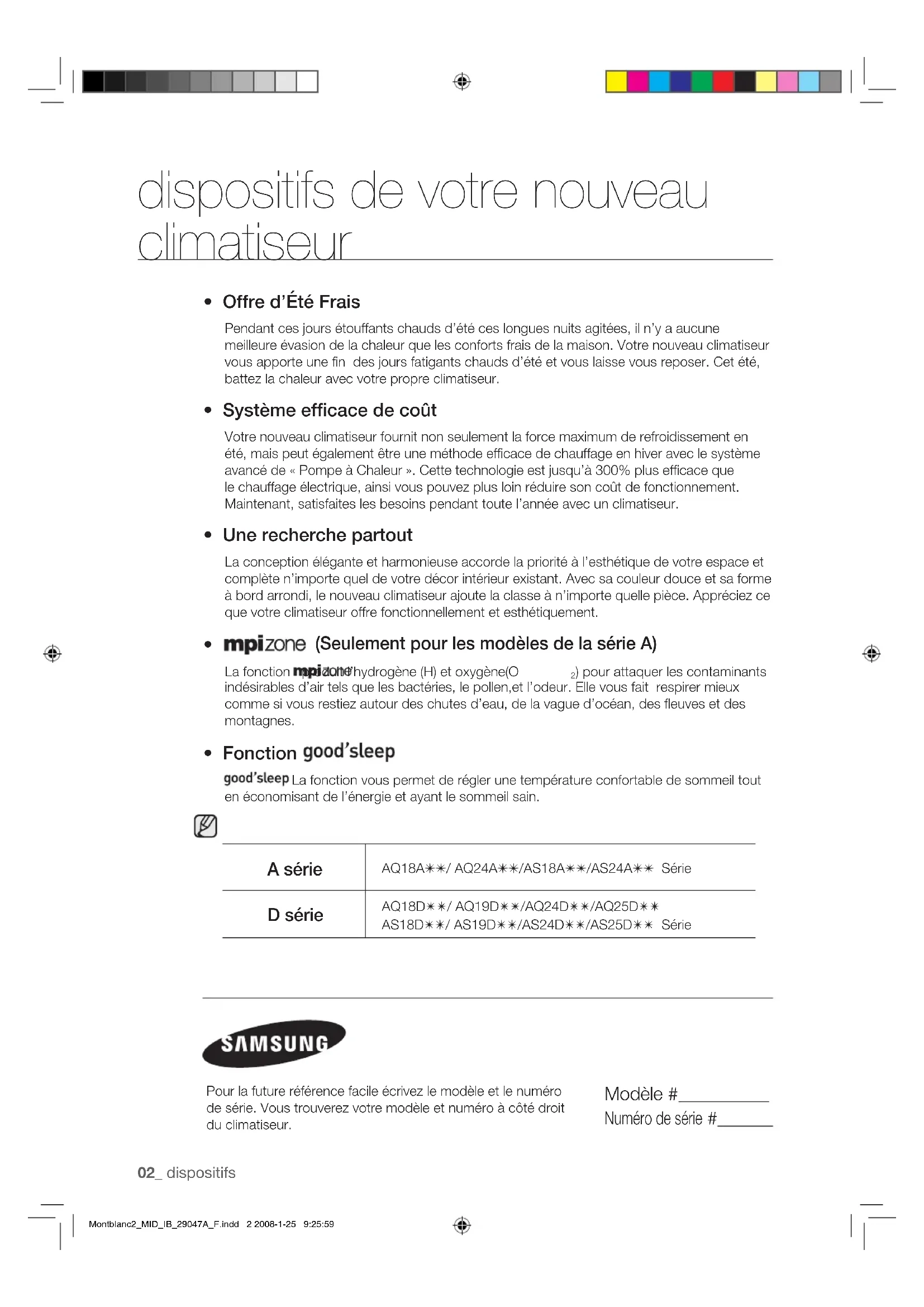 - Fonction La fonction vous permet de régler une température confortable de sommeil tout en économisant de l’énergie et ayant le sommeil sain. A série AQ18A/ AQ24A/AS18A/AS24A Série D série AQ18D/ AQ19D/AQ24D/AQ25D AS18D/ AS19D/AS24D/AS25D Série Montblanc2_MID_IB_29047A_F.indd 2 2008-1-25 9:25:59information de sûreté _03FRANÇAIS information de sûreté Pour empêcher la décharge électrique, débranchez le courant avant d’entretenir, nettoyer, et installer l’unité.