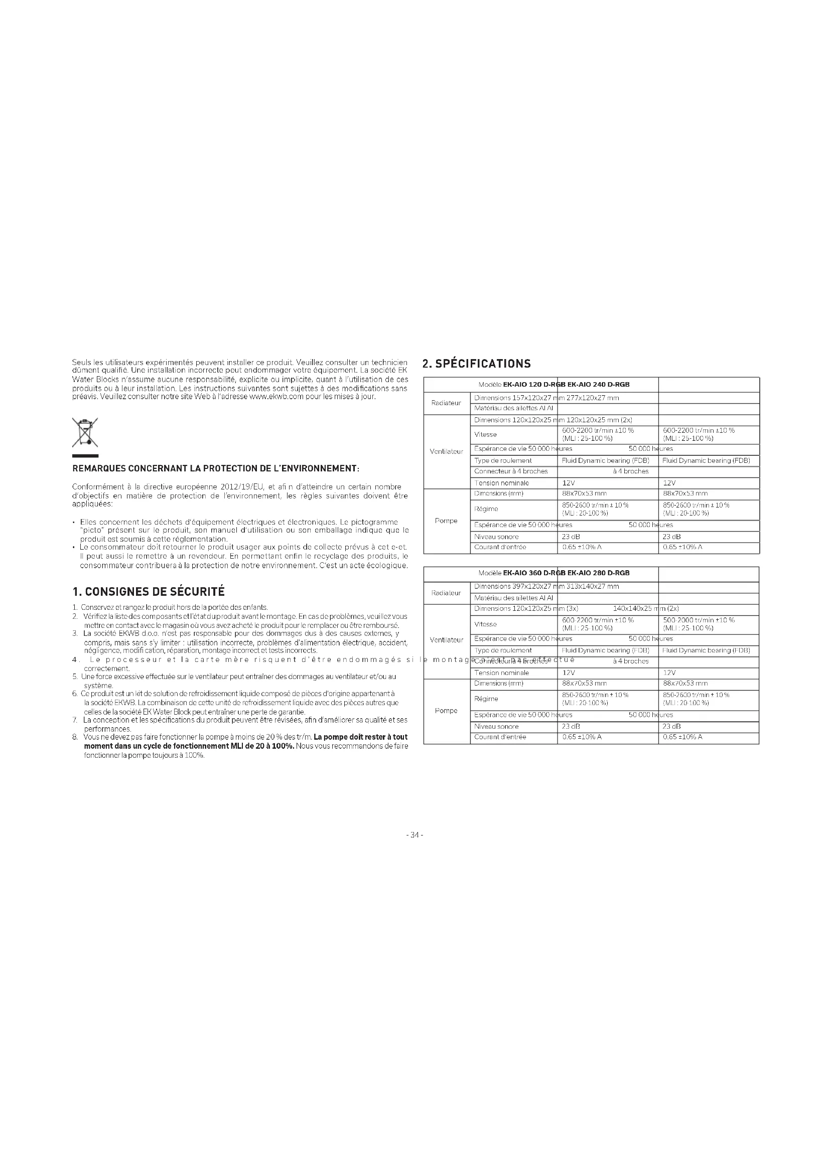 Modèle EK-AIO 120 D-RGB EK-AIO 240 D-RGB Radiateur Dimensions 157x120x27 mm 277x120x27 mm Matériau des ailettes Al Al Ventilateur Dimensions 120x120x25 mm 120x120x25 mm (2x) Vitesse 600-2200 tr/min ±10 % (MLI : 25-100 %) 600-2200 tr/min ±10 % (MLI : 25-100 %) Espérance de vie 50 000 heures 50 000 heures Type de roulement Fluid Dynamic bearing (FDB) Fluid Dynamic bearing (FDB) Connecteur à 4 broches à 4 broches Tension nominale 12V 12V Pompe Dimensions (mm) 88x70x53 mm 88x70x53 mm Régime 850-2600 tr/min ± 10 % (MLI : 20-100 %) 850-2600 tr/min ± 10 % (MLI : 20-100 %) Espérance de vie 50 000 heures 50 000 heures Niveau sonore 23 dB 23 dB Courant d’entrée 0.65 ±10% A 0.65 ±10% A Modèle EK-AIO 360 D-RGB EK-AIO 280 D-RGB Radiateur Dimensions 397x120x27 mm 313x140x27 mm Matériau des ailettes Al Al Ventilateur Dimensions 120x120x25 mm (3x) 140x140x25 mm (2x) Vitesse 600-2200 tr/min ±10 % (MLI : 25-100 %) 500-2000 tr/min ±10 % (MLI : 25-100 %) Espérance de vie 50 000 heures 50 000 heures Type de roulement Fluid Dynamic bearing (FDB) Fluid Dynamic bearing (FDB) Connecteur à 4 broches à 4 broches Tension nominale 12V 12V Pompe Dimensions (mm) 88x70x53 mm 88x70x53 mm Régime 850-2600 tr/min ± 10 % (MLI : 20-100 %) 850-2600 tr/min ± 10 % (MLI : 20-100 %) Espérance de vie 50 000 heures 50 000 heures Niveau sonore 23 dB 23 dB Courant d’entrée 0.65 ±10% A 0.65 ±10% A REMARQUES CONCERNANT LA PROTECTION DE L’ENVIRONNEMENT: Conformément à la directive européenne 2012/19/EU, et afi n d’atteindre un certain nombre d’objectifs en matière de protection de l’environnement, les règles suivantes doivent être appliquées: