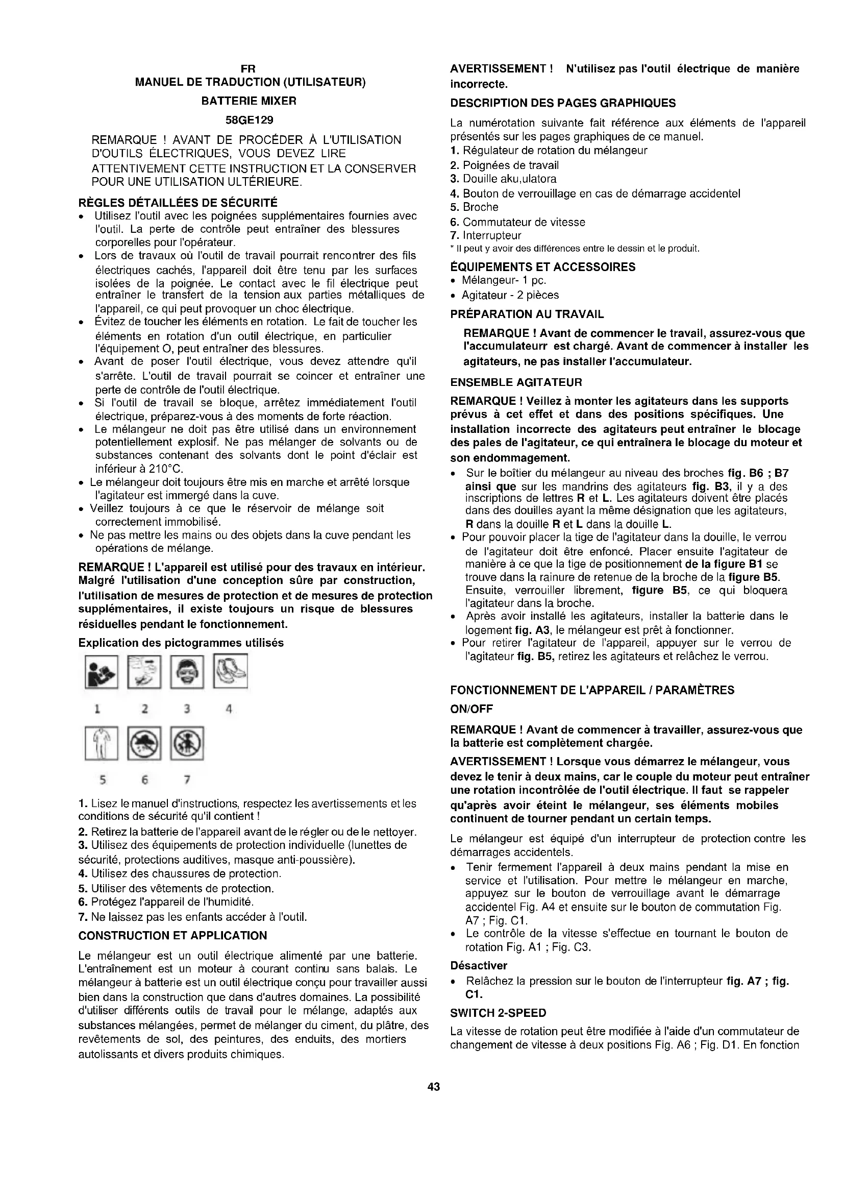 ON/OFF REMARQUE ! Avant de commencer à travailler, assurez-vous que la batterie est complètement chargée. AVERTISSEMENT ! Lorsque vous démarrez le mélangeur, vous devez le tenir à deux mains, car le couple du moteur peut entraîner une rotation incontrôlée de l'outil électrique. Il faut se rappeler qu'après avoir éteint le mélangeur, ses éléments mobiles continuent de tourner pendant un certain temps. Le mélangeur est équipé d'un interrupteur de protection contre les démarrages accidentels.