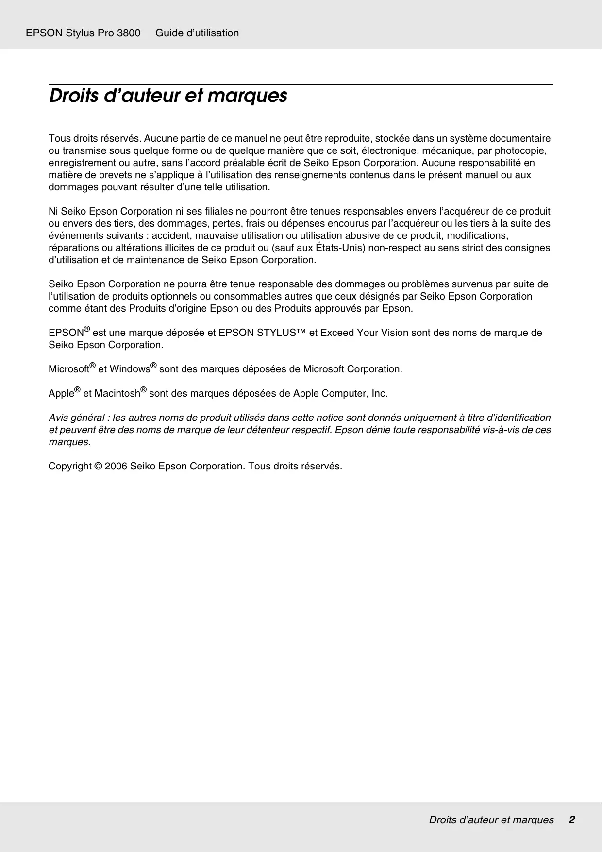EPSON Stylus Pro 3800 Guide d’utilisation Table des matières Droits d’auteur et marques