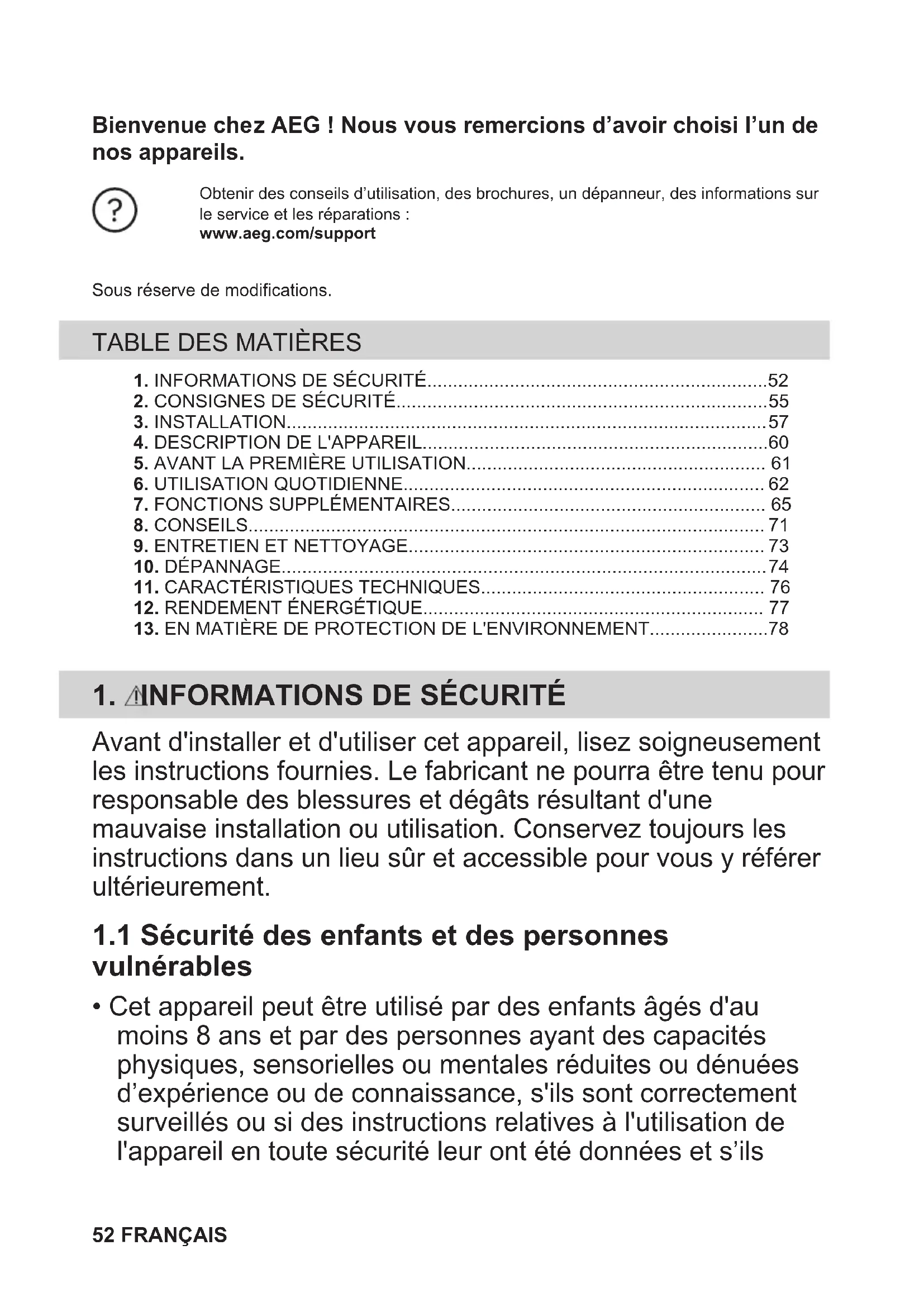 - Cet appareil peut être utilisé par des enfants âgés d'au moins 8 ans et par des personnes ayant des capacités physiques, sensorielles ou mentales réduites ou dénuées d’expérience ou de connaissance, s'ils sont correctement surveillés ou si des instructions relatives à l'utilisation de l'appareil en toute sécurité leur ont été données et s’ils 52 FRANÇAIScomprennent les risques encourus. Les enfants de moins de 8 ans et les personnes ayant un handicap très important et complexe doivent être tenus à l'écart de l’appareil, à moins d'être surveillés en permanence.