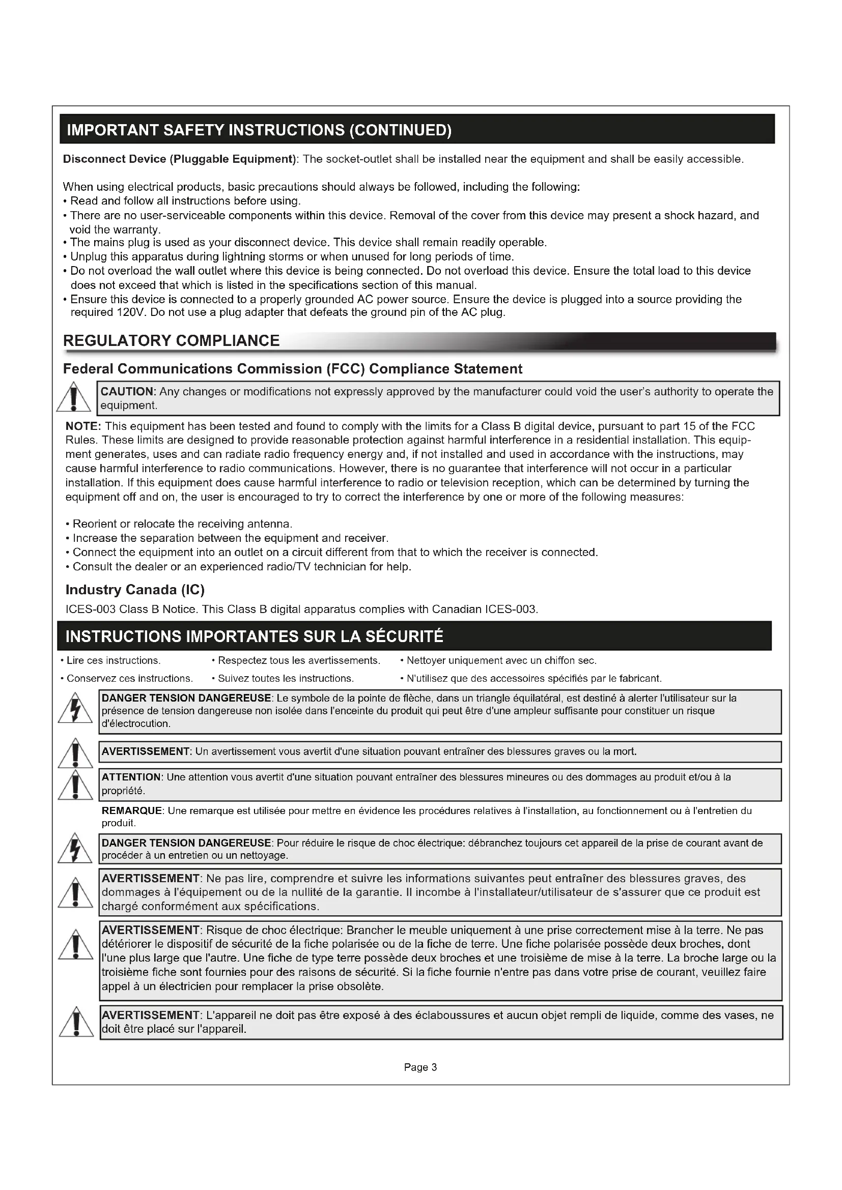 - Ensure this device is connected to a properly grounded AC power source. Ensure the device is plugged into a source providing the required 120V. Do not use a plug adapter that defeats the ground pin of the AC plug. DANGER TENSION DANGEREUSE: Le symbole de la pointe de flèche, dans un triangle équilatéral, est destiné à alerter l'utilisateur sur la présence de tension dangereuse non isolée dans l'enceinte du produit qui peut être d'une ampleur suffisante pour constituer un risque d'électrocution.