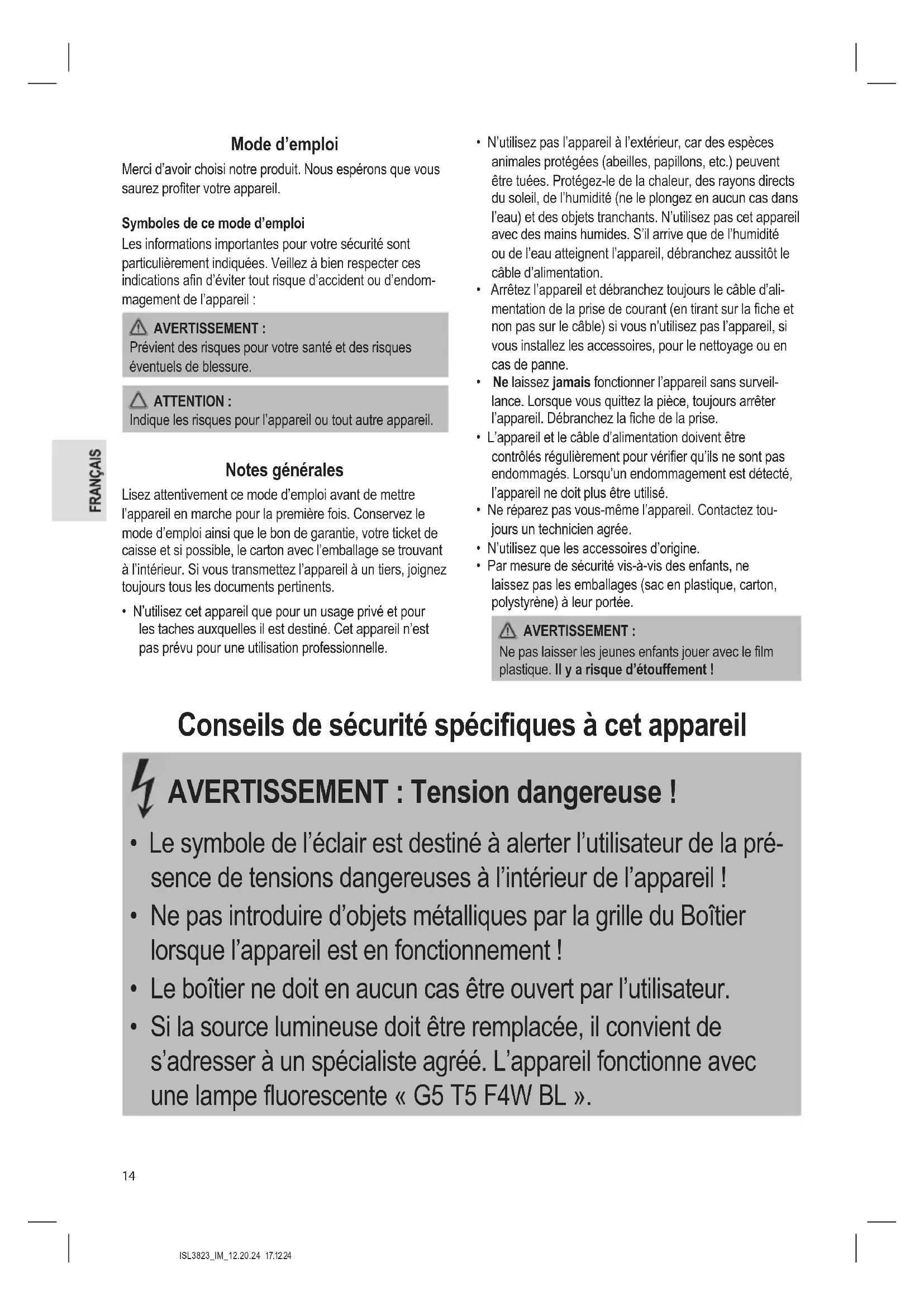 - Rangez toujours l’appareil hors de portée des enfants, dans un endroit sec et bien ventilé. Données techniques Modèle : ................................................................... ISL 3823 Alimentation électrique : .....................220 – 240 V~, 50 / 60 Hz Puissance absorbée : .......................................................4 W Tube fluorescent* : ....................................1 × G5 T5 F4W BL Classe de protection : .......................................................... Poids net : ..............................................................env. 0,4 kg