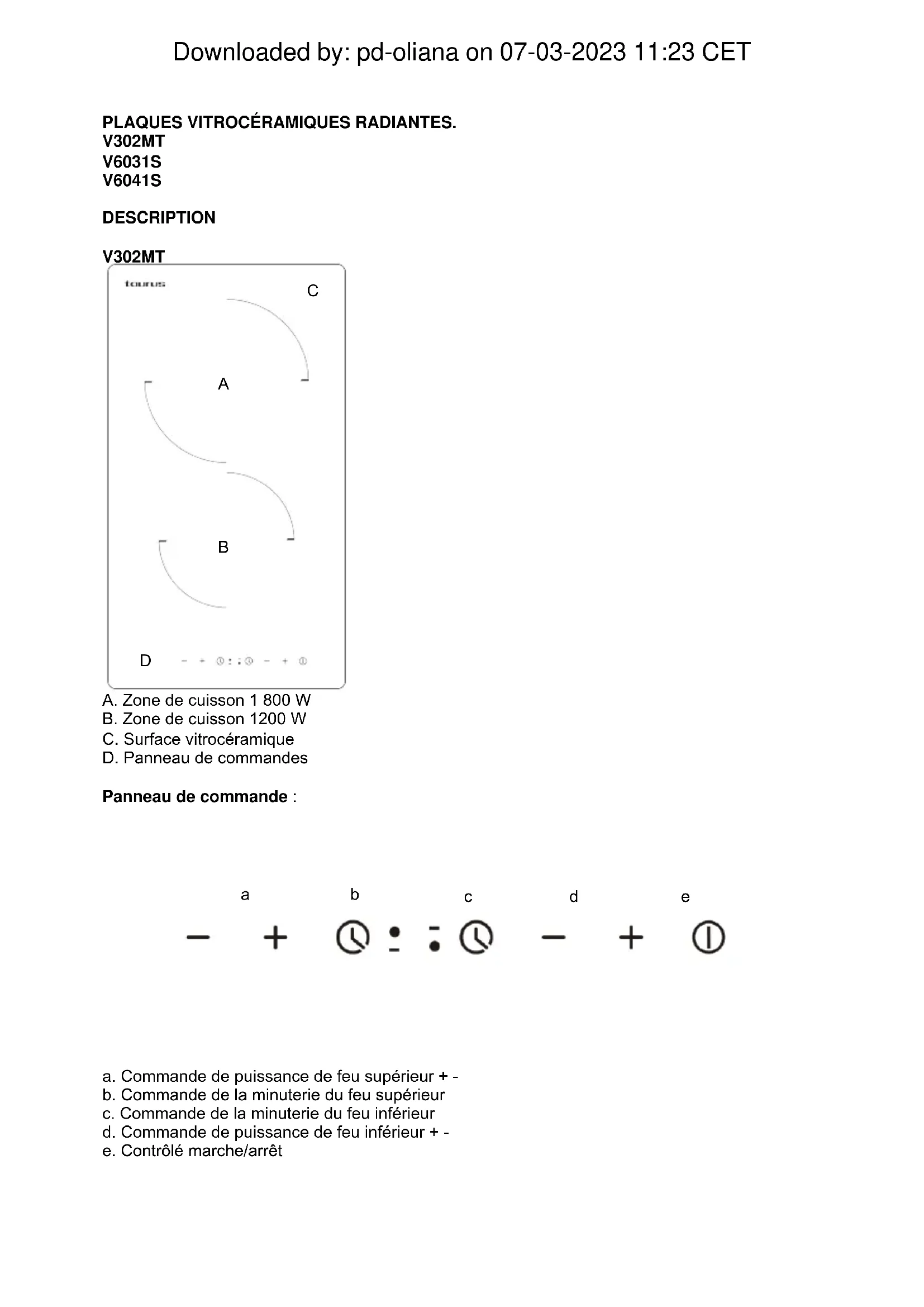 Downloaded by: pd-oliana on 07-03-2023 11:23 CETPLAQUES VITROCÉRAMIQUES RADIANTES. V302MT V6031S V6041S DESCRIPTION V302MT A. Zone de cuisson 1 800 W B. Zone de cuisson 1200 W C. Surface vitrocéramique D. Panneau de commandes Panneau de commande : a. Commande de puissance de feu supérieur + - b. Commande de la minuterie du feu supérieur c. Commande de la minuterie du feu inférieur d. Commande de puissance de feu inférieur + - e. Contrôlé marche/arrêt