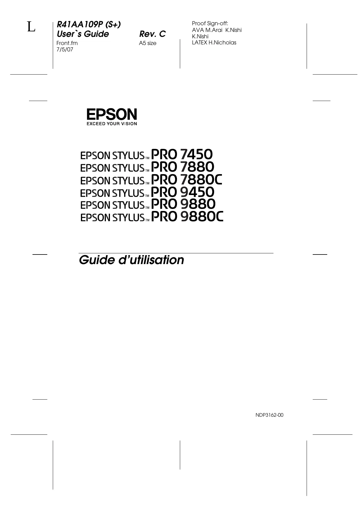 Ni Seiko Epson Corporation ni ses filiales ne pourront être tenues responsables envers l’acquéreur de ce produit ou envers des tiers, des dommages, pertes, frais ou dépenses encourus par l’acquéreur ou les tiers à la suite des événements suivants : accident, mauvaise utilisation ou utilisation abusive de ce produit, modifications, réparations ou altérations illicites de ce produit ou (sauf aux États-Unis) non-respect au sens strict des consignes d’utilisation et de maintenance de Seiko Epson Corporation. Seiko Epson Corporation ne pourra être tenue responsable des dommages ou problèmes survenus par suite de l’utilisation de produits optionnels ou consommables autres que ceux désignés par Seiko Epson Corporation comme étant des Produits d’origine Epson ou des Produits approuvés par Epson. Seiko Epson Corporation ne pourra être tenue responsable des dommages ou problèmes survenus par suite des interférences électromagnétiques résultant de l'utilisation de câbles différents de ceux désignés par Seiko Epson Corporation comme étant des Produits approuvés par Epson. EPSON® est une marque déposée et EPSON STYLUS™ et Exceed Your Vision est un nom de marque de Seiko Epson Corporation. Microsoft® et Windows® sont des marques déposées de Microsoft Corporation. Apple® et Macintosh® sont des marques déposées d'Apple Inc. Adobe®, Photoshop® et Adobe® RGB sont des marques déposées d'Adobe Systems Incorporated. Avis général : les autres noms de produit utilisés dans cette notice sont donnés uniquement à titre d’identification et peuvent être des noms de marque de leur détenteur respectif. Epson décline toute responsabilité vis-à-vis de ces marques. Copyright © 2007 Seiko Epson Corporation. Tous droits réservés.