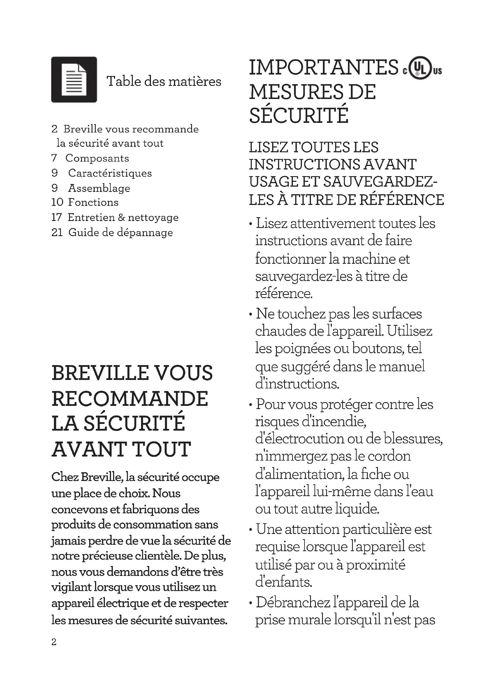 AVANT TOUT Chez Breville, la sécurité occupe une place de choix. Nous concevons et fabriquons des produits de consommation sans jamais perdre de vue la sécurité de notre précieuse clientèle. De plus, nous vous demandons d’être très vigilant lorsque vous utilisez un appareil électrique et de respecter les mesures de sécurité suivantes. IMPORTANTES MESURES DE SÉCURITÉ