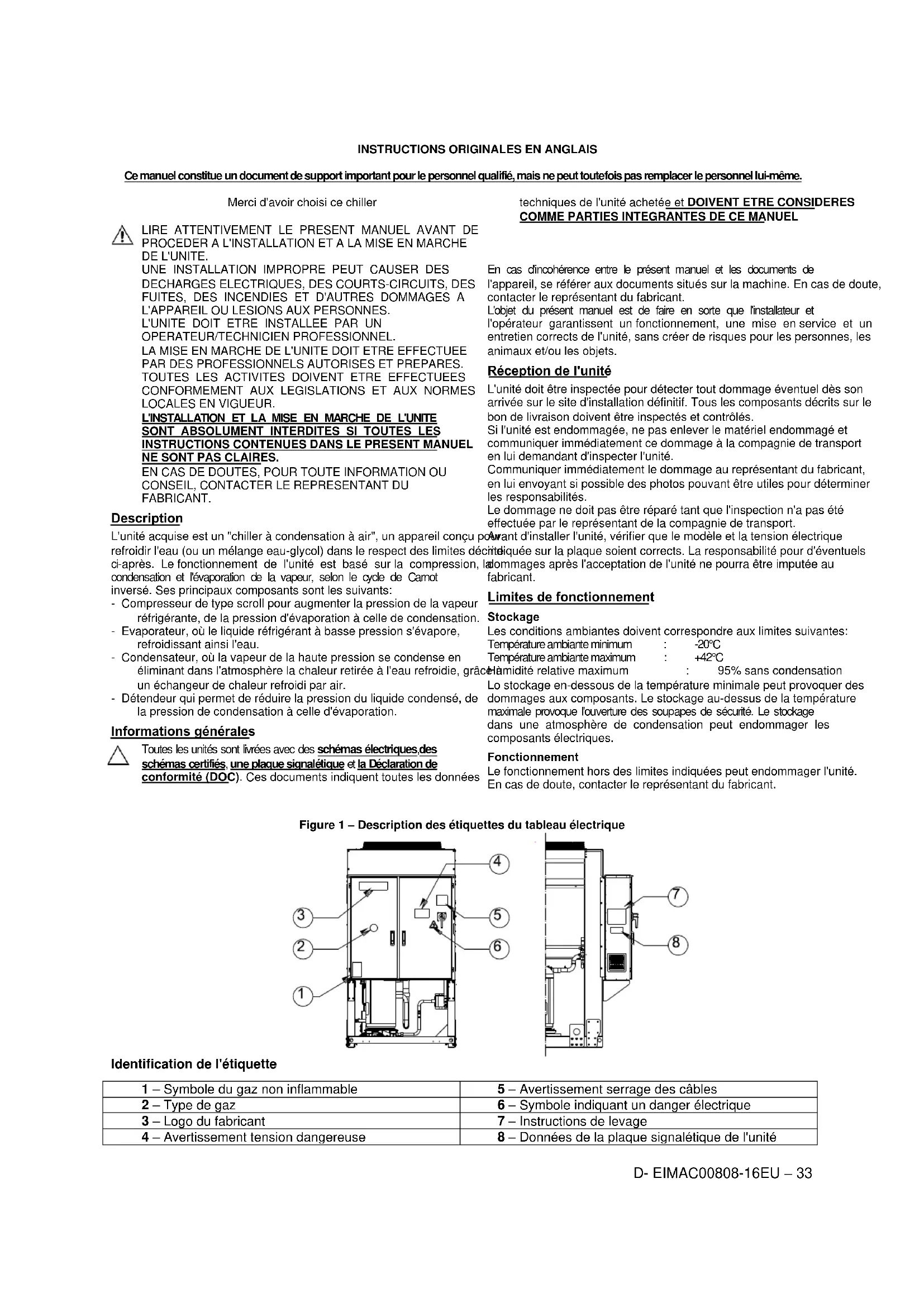 Figure 1 – Description des étiquettes du tableau électrique Identification de l'étiquette 1 – Symbole du gaz non inflammable 5 – Avertissement serrage des câbles 2 – Type de gaz 6 – Symbole indiquant un danger électrique 3 – Logo du fabricant 7 – Instructions de levage 4 – Avertissement tension dangereuse 8 – Données de la plaque signalétique de l'unitéD-EIMAC00808-16EU – 34