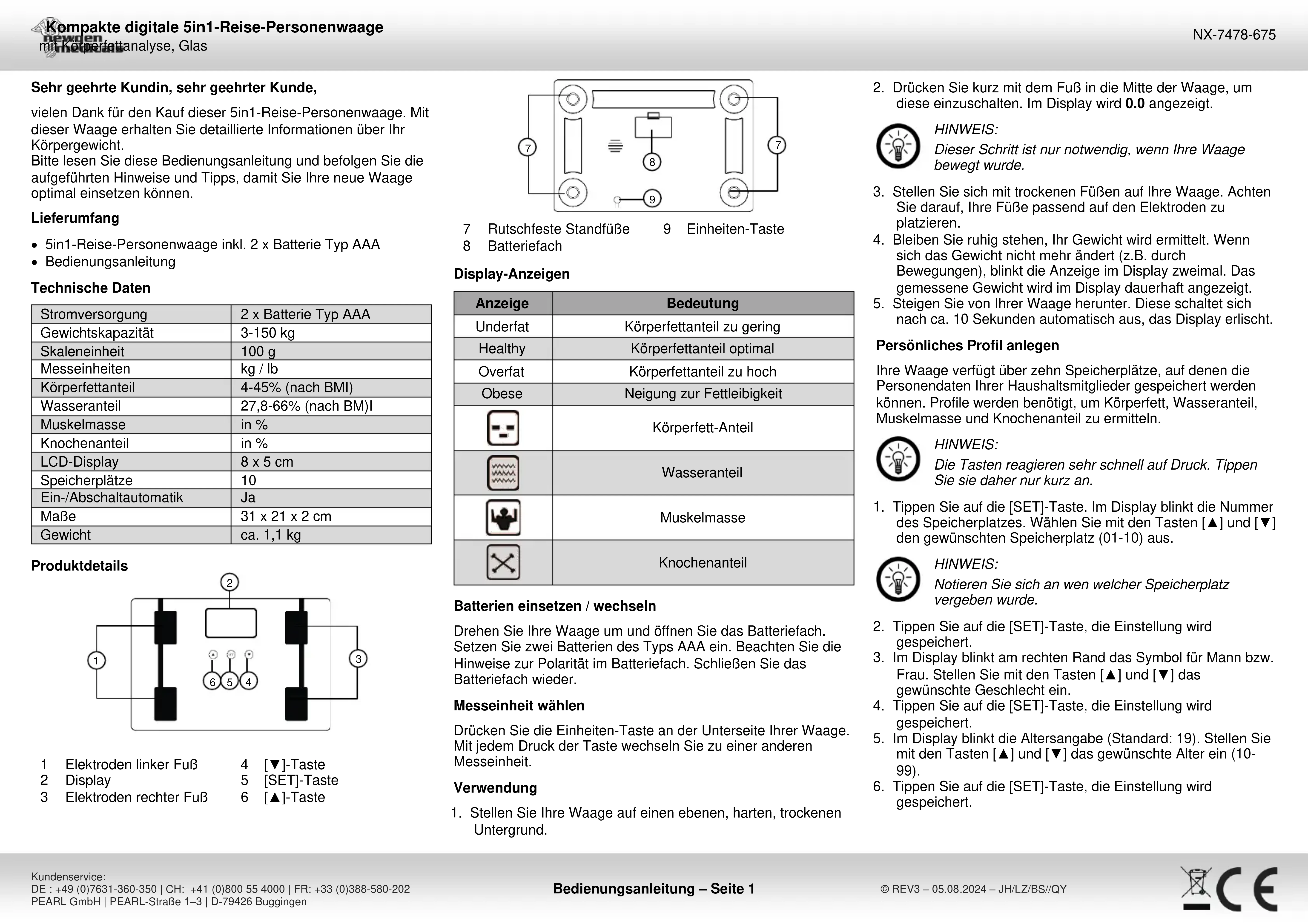 Masse graisseuse Femme Âge Faible Normale Élevée Très élevée 17-20 < 15 15-21 22-26 > 26 21-42 < 17 17-23 24-28 > 28 43-65 < 18 18-24 25-29 > 29 66-100 < 19 19-25 25-30 > 30 Dépannage Le message ERR s'affiche sur l'écran. Le poids maximum que votre balance peut supporter a été dépassé. La capacité maximale est de 150 kg. Le message LO s'affiche sur l'écran. Remplacez les piles par deux piles neuves du même type (AAA). Nettoyage Nettoyez la balance régulièrement avec un chiffon doux et humide. N'utilisez pas de produit nettoyant agressif ni d'alcool. Consignes de sécurité Ce mode d'emploi vous permet de vous familiariser avec le fonctionnement du produit. Conservez-le précieusement afin de pouvoir le consulter en cas de besoin. Pour connaître les conditions de garantie, veuillez contacter votre revendeur. Veuillez également tenir compte des conditions générales de vente ! Veillez à utiliser le produit uniquement comme indiqué dans la notice. Une mauvaise utilisation peut endommager le produit ou son environnement. Le démontage ou la modification du produit affecte sa sécurité. Attention, risque de blessure ! N'ouvrez jamais le produit, sauf pour remplacer les piles. Ne tentez jamais de réparer vous-même le produit ! Manipulez le produit avec précaution. Un coup, un choc, ou une chute, même de faible hauteur, peut l'endommager. N'exposez pas l'appareil à une chaleur extrême. Ne plongez jamais l'appareil dans l'eau ni dans aucun autre liquide. Ne montez pas sur la balance avec les pieds humides ou mouillés - Risque de chute par glissade ! L'appareil ne convient pas pour les personnes suivantes : Personnes équipées d'un stimulateur cardiaque ou d'un autre implant médical, les femmes enceintes, les personnes souffrant de diabète, les personnes avec restrictions médicales ou physiques. N'exposez pas la balance à des températures extrêmes ou à une haute humidité de l'air. Avant de vous peser, retirez vos chaussettes. Ne surchargez pas la balance. La balance est conçue pour un usage privé uniquement et non pour une utilisation commerciale ou médicale. ATTENTION : Pour effectuer les mesures, l’appareil fait passer un courant électrique à travers l’utilisateur. Il ne doit pas être utilisé par des personnes portant un stimulateur cardiaque ou d’autres implants médicaux. Demandez conseil à votre médecin avant d’utiliser ce produit, ou si vous êtes enceinte ou pourriez l’être. Tenir hors de portée des enfants. Aucune garantie ne pourra être appliquée en cas de mauvaise utilisation. Le fabricant décline toute responsabilité en cas de dégâts matériels ou dommages (physiques ou moraux) dus à une mauvaise utilisation et/ou au non-respect des consignes de sécurité. Sous réserve de modification et d'erreur ! Consignes importantes pour le traitement des déchets Cet appareil électronique ne doit PAS être jeté dans la poubelle de déchets ménagers. Pour l'enlèvement approprié des déchets, veuillez vous adresser aux points de ramassage publics de votre municipalité. Les détails concernant l'emplacement d'un tel point de ramassage et des éventuelles restrictions de quantité existantes par jour/mois/année, ainsi que sur des frais éventuels de collecte, sont disponibles dans votre municipalité. Consignes importantes sur les batteries/piles et leur recyclage Les piles ne doivent PAS être jetées dans la poubelle ordinaire. La législation oblige aujourd'hui chaque consommateur à jeter les batteries/piles usagées dans les poubelles spécialement prévues à cet effet. Vous pouvez déposer vos batteries/piles usagées dans les lieux de collecte de déchets de votre municipalité et dans les lieux où elles sont vendues. Maintenez les batteries/piles hors de portée des enfants. Les batteries/piles dont s'échappe du liquide sont dangereuses. Ne les manipulez pas sans gants adaptés. N'essayez pas d'ouvrir les batteries/piles. Ne les jetez pas au feu. Les piles normales ne sont pas rechargeables. Attention : risque d'explosion ! N'utilisez ensemble que des batteries/piles du même type, et remplacez-les toutes en même temps ! Retirez les batteries/piles de l’appareil si vous ne comptez pas l'utiliser pendant une période prolongée. Déclaration de conformité La société PEARL GmbH déclare ce produit NX-7478 conforme aux directives actuelles suivantes du Parlement Européen : 2011/65/UE, relative à la limitation de l'utilisation de certaines substances dangereuses dans les équipements électriques et électroniques, et 2014/30/UE, concernant la compatibilité électromagnétique. Service Qualité Dipl. Ing. (FH) Andreas Kurtasz La déclaration de conformité complète du produit est disponible en téléchargement à l'adresse www.pearl.fr/support/notices ou sur simple demande par courriel à qualite@pearl.fr.