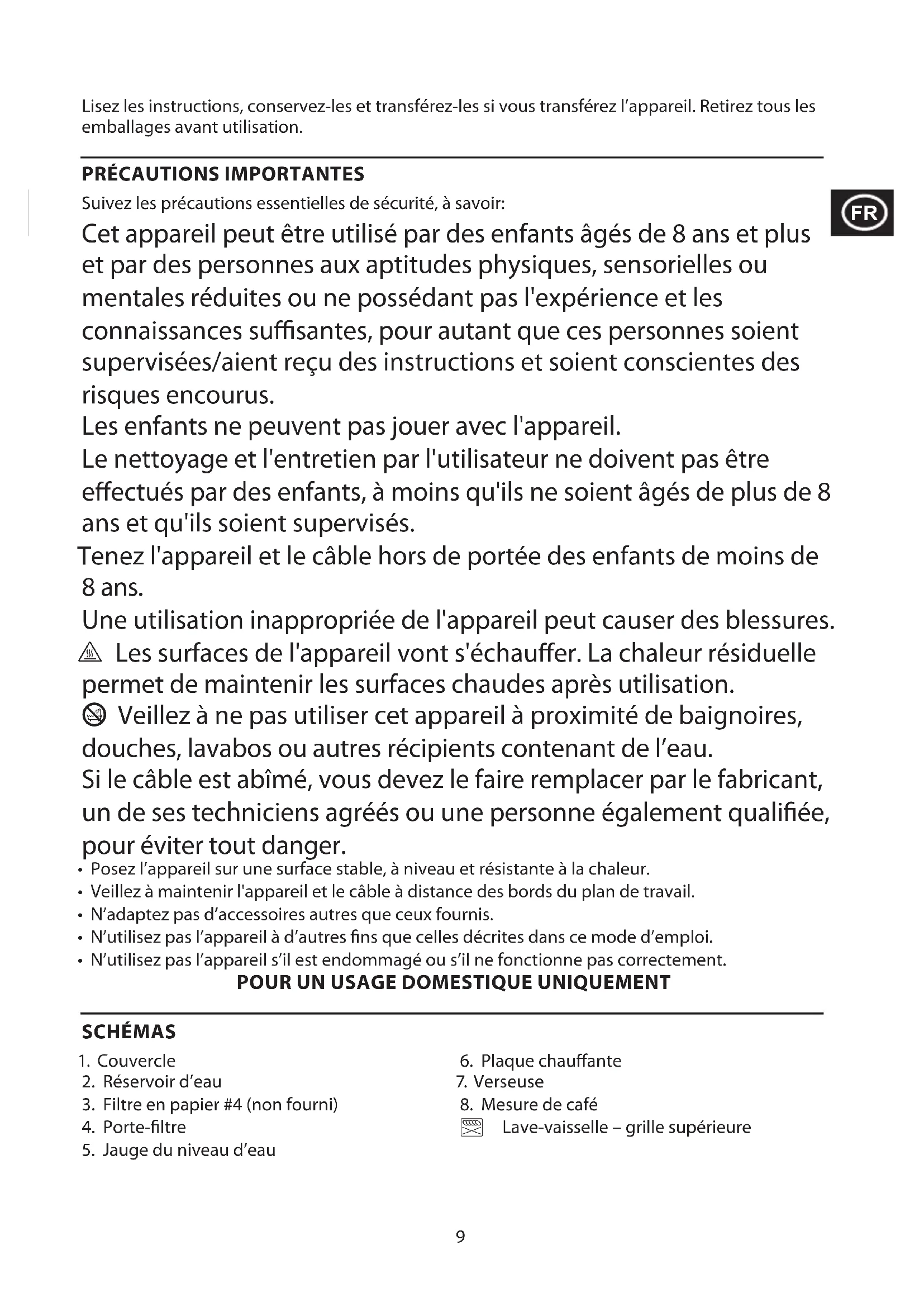 Suivez les précautions essentielles de sécurité, à savoir: Cet appareil peut être utilisé par des enfants âgés de 8 ans et plus et par des personnes aux aptitudes physiques, sensorielles ou mentales réduites ou ne possédant pas l'expérience et les connaissances susantes, pour autant que ces personnes soient supervisées/aient reçu des instructions et soient conscientes des risques encourus. Les enfants ne peuvent pas jouer avec l'appareil. Le nettoyage et l'entretien par l'utilisateur ne doivent pas être eectués par des enfants, à moins qu'ils ne soient âgés de plus de 8 ans et qu'ils soient supervisés. Tenez l'appareil et le câble hors de portée des enfants de moins de 8 ans. Une utilisation inappropriée de l'appareil peut causer des blessures. h Les surfaces de l'appareil vont s'échauer. La chaleur résiduelle permet de maintenir les surfaces chaudes après utilisation. b Veillez à ne pas utiliser cet appareil à proximité de baignoires, douches, lavabos ou autres récipients contenant de l’eau. Si le câble est abîmé, vous devez le faire remplacer par le fabricant, un de ses techniciens agréés ou une personne également qualiée, pour éviter tout danger.