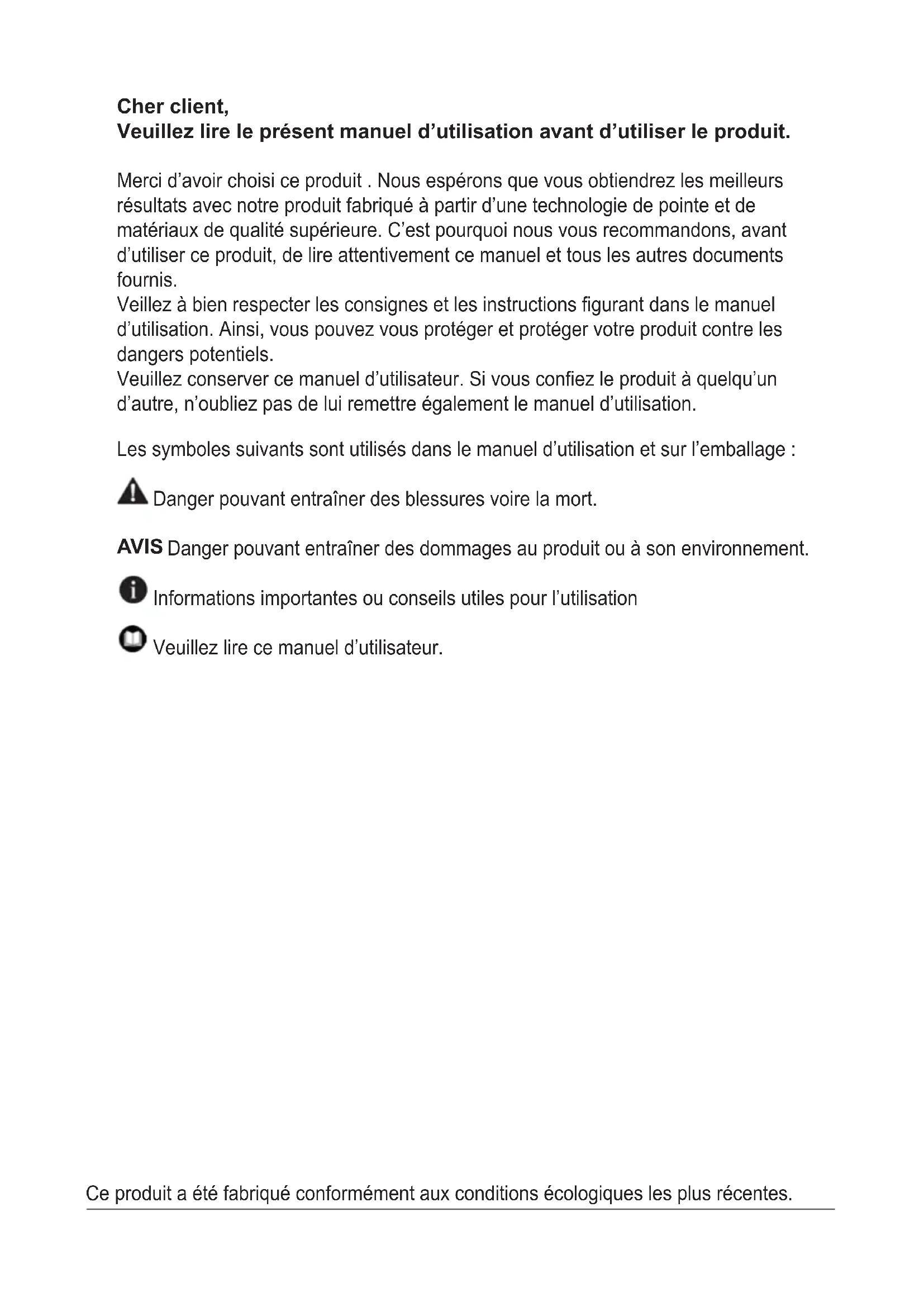 DFI 46707 DFI 46708 DFI 46709 DFI 46750Les symboles suivants sont utilisés dans le manuel d’utilisation et sur l’emballage : Danger pouvant entraîner des blessures voire la mort. AVIS Danger pouvant entraîner des dommages au produit ou à son environnement. Informations importantes ou conseils utiles pour l’utilisation Veuillez lire ce manuel d’utilisateur. Cher client, Veuillez lire le présent manuel d’utilisation avant d’utiliser le produit. Merci d’avoir choisi ce produit . Nous espérons que vous obtiendrez les meilleurs résultats avec notre produit fabriqué à partir d’une technologie de pointe et de matériaux de qualité supérieure. C’est pourquoi nous vous recommandons, avant d’utiliser ce produit, de lire attentivement ce manuel et tous les autres documents fournis. Veillez à bien respecter les consignes et les instructions figurant dans le manuel d’utilisation. Ainsi, vous pouvez vous protéger et protéger votre produit contre les dangers potentiels. Veuillez conserver ce manuel d’utilisateur. Si vous confiez le produit à quelqu’un d’autre, n’oubliez pas de lui remettre également le manuel d’utilisation. Ce produit a été fabriqué conformément aux conditions écologiques les plus récentes.TABLE DES MATIÈRES