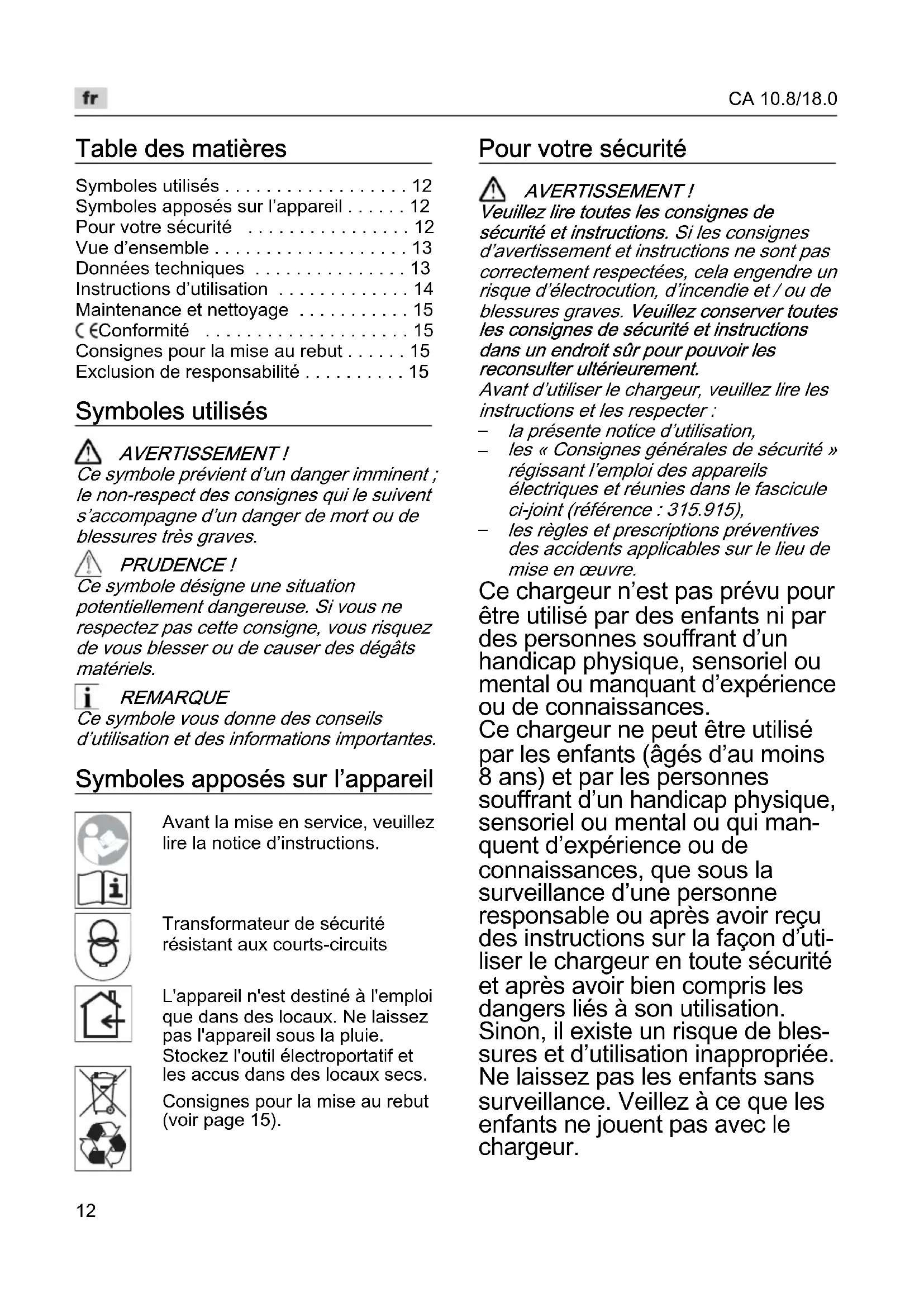 les règles et prescriptions préventives des accidents applicables sur le lieu de mise en œuvre. Ce chargeur n’est pas prévu pour être utilisé par des enfants ni par des personnes souffrant d’un handicap physique, sensoriel ou mental ou manquant d’expérience ou de connaissances. Ce chargeur ne peut être utilisé par les enfants (âgés d’au moins 8 ans) et par les personnes souffrant d’un handicap physique, sensoriel ou mental ou qui man- quent d’expérience ou de connaissances, que sous la surveillance d’une personne responsable ou après avoir reçu des instructions sur la façon d’uti- liser le chargeur en toute sécurité et après avoir bien compris les dangers liés à son utilisation. Sinon, il existe un risque de bles- sures et d’utilisation inappropriée. Ne laissez pas les enfants sans surveillance. Veillez à ce que les enfants ne jouent pas avec le chargeur.CA 10.8/18.0