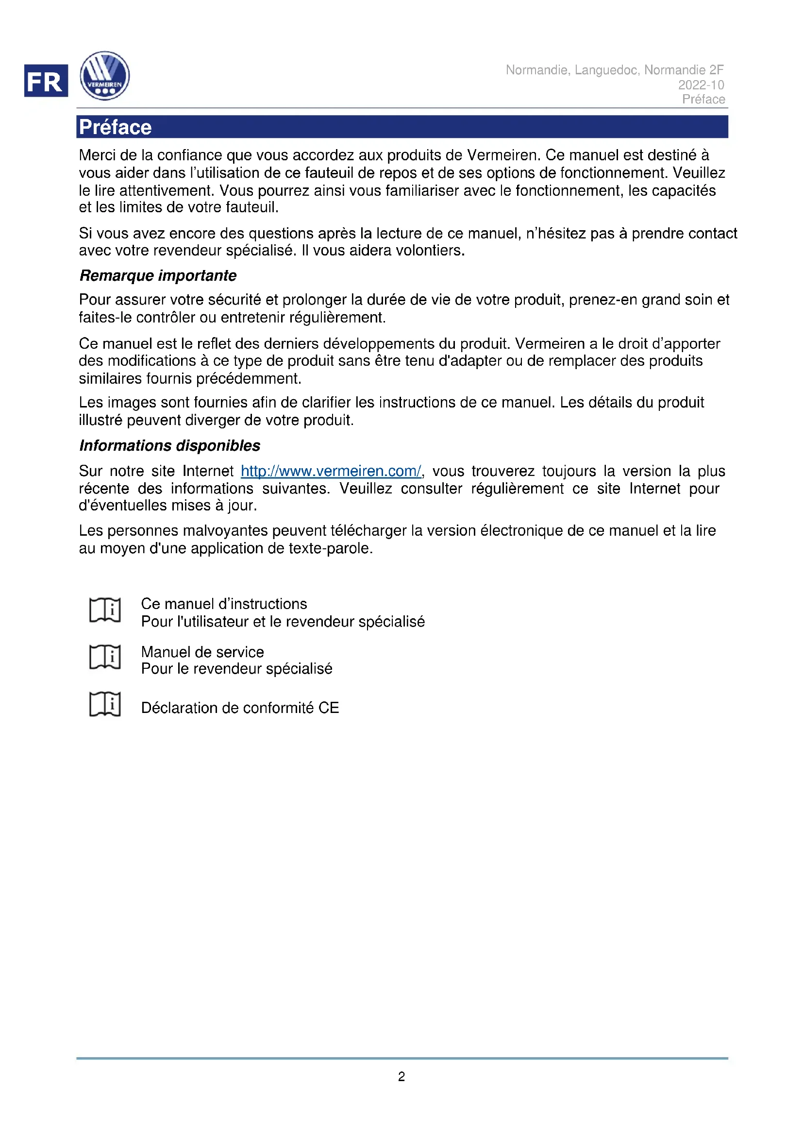 Préface Merci de la confiance que vous accordez aux produits de Vermeiren. Ce manuel est destiné à vous aider dans l’utilisation de ce fauteuil de repos et de ses options de fonctionnement. Veuillez le lire attentivement. Vous pourrez ainsi vous familiariser avec le fonctionnement, les capacités et les limites de votre fauteuil. Si vous avez encore des questions après la lecture de ce manuel, n’hésitez pas à prendre contact avec votre revendeur spécialisé. Il vous aidera volontiers. Remarque importante Pour assurer votre sécurité et prolonger la durée de vie de votre produit, prenez-en grand soin et faites-le contrôler ou entretenir régulièrement. Ce manuel est le reflet des derniers développements du produit. Vermeiren a le droit d’apporter des modifications à ce type de produit sans être tenu d'adapter ou de remplacer des produits similaires fournis précédemment. Les images sont fournies afin de clarifier les instructions de ce manuel. Les détails du produit illustré peuvent diverger de votre produit. Informations disponibles Sur notre site Internet http://www.vermeiren.com/, vous trouverez toujours la version la plus récente des informations suivantes. Veuillez consulter régulièrement ce site Internet pour d'éventuelles mises à jour. Les personnes malvoyantes peuvent télécharger la version électronique de ce manuel et la lire au moyen d'une application de texte-parole.