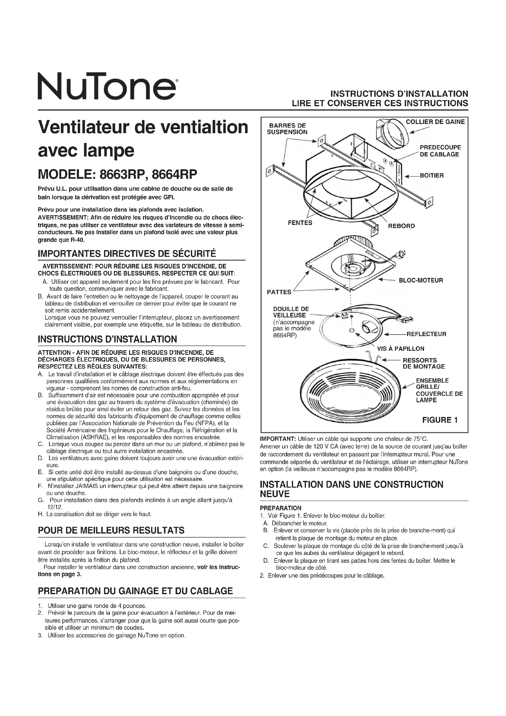 ATTENTION - AFIN DE RÉDUIRE LES RISQUES D’INCENDIE, DE DÉCHARGES ÉLECTRIQUES, OU DE BLESSURES DE PERSONNES, RESPECTEZ LES RÈGLES SUIVANTES:A. Le travail d’installation et le câblage électrique doivent être éffectués pas des personnes qualifiées conformément aux normes et aux réglementations en vigueur - comprenant les nornes de construction anti-feu.B. Suffisamment d’air est nécessaire pour une combustion appropriée et pour une évacuation des gaz au travers du système d’évacuation (cheminée) de résidus brûlés pour ainsi éviter un retour des gaz. Suivez les données et les normes de sécurité des fabricants d’équipement de chauffage comme celles publiées par l’Association Nationale de Prévention du Feu (NFPA), et la Société Américaine des Ingénieurs pour le Chauffage, la Réfrigération et la Climatisation (ASHRAE), et les responsables des normes encastrée.C. Lorsque vous coupez ou percez dans un mur ou un plafond, n’abîmez pas le câblage électrique ou tout autre installation encastrée.D. Les ventilateurs avec gaine doivent toujours avoir une une évacuation extéri-eure.E. Si cette unité doit être installé au-dessus d’une baignoire ou d’une douche, une stipulation spécifique pour cette utilisation est nécessaire.F. N’installez JAIMAIS un interrupteur qui peut être atteint depuis une baignoire ou une douche.G. Pour installation dans des plafonds inclinés à un angle allant jusqu’à 12/12. La canalisation doit se diriger vers le haut.
