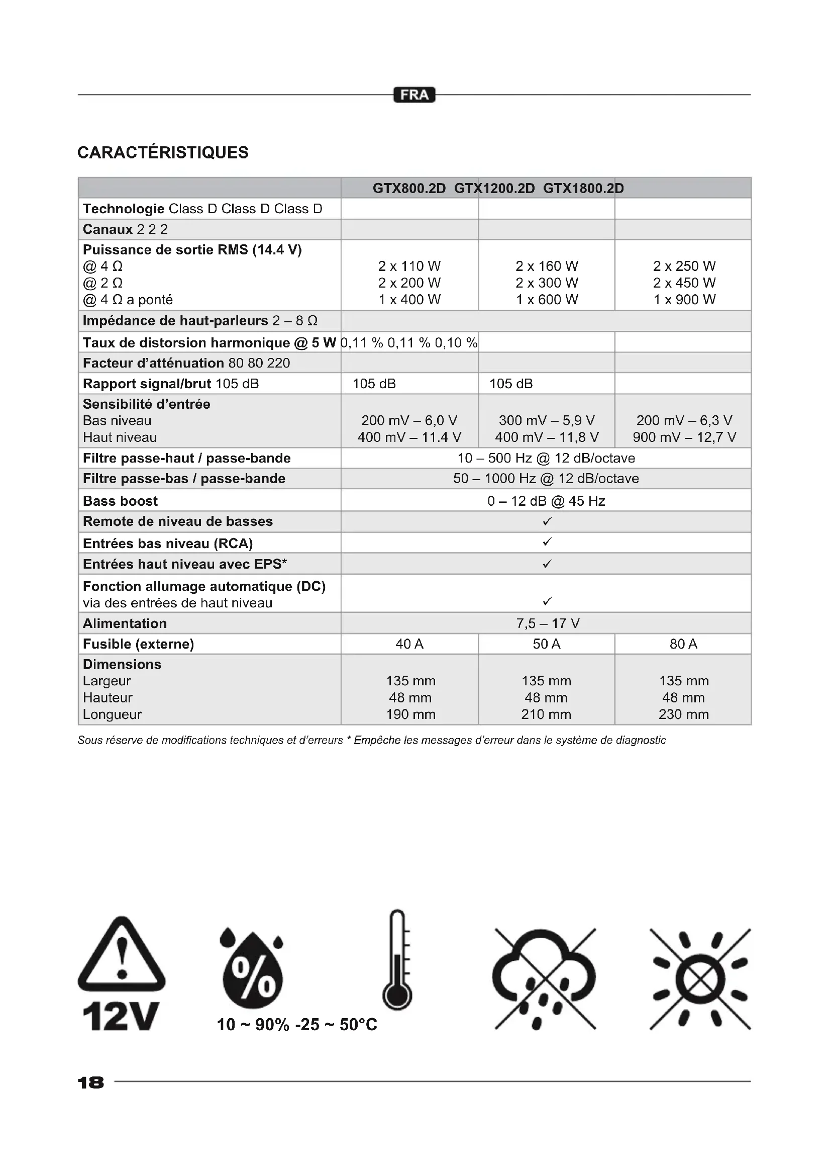 Vériez les étapes suivantes: Le contrôleur de niveau d’entrée de l’appareil est-il réglé trop haut? Baissez lentement le contrôleur jusqu’à ce que vous entendiez un signal audio clair. L’amplication des basses de l’appareil est-elle trop élevée? Baissez lentement le contrôleur jusqu’à ce que vous entendiez un signal audio clair. La fonction Loudness de l’autoradio est-elle réglée trop haut? Désactivez le Loudness ou baissez le paramètre Loudness jusqu’à ce que vous entendiez un signal audio clair. Les paramètres d’égalisation et de son de l’autoradio sont-ils trop élevés? Baissez les paramètres Treble, Mid et Bass ou désactivez l’égaliseur jusqu’à ce que vous entendiez un signal audio clair. BRUITS AUDIBLES (EN FONCTION DU RÉGIME MOTEUR) Vériez les étapes suivantes: Les câbles RCA ont-ils été posés séparément du câble d’alimentation dans le véhicule? Si nécessaire, réacheminez les câbles et assurez-vous que les câbles RCA sont posés séparément du câble d’alimentation à gauche et à droite du véhicule. La connexion à la masse de l’appareil est-elle correctement connectée ? Assurez-vous que la connexion à la masse de l’appareil n’est pas connectée directement à la borne négative de la batterie du véhicule. Sélectionnez un point de masse approprié sur la carrosserie du véhicule à connecter. Si nécessaire, utilisez un spray contact pour améliorer la conductivité des connexions. La conductivité du câble de masse de la batterie du véhicule vers la carrosserie est-elle correcte ? Assurez-vous que la connexion à la masse de la batterie du vçéhicule est stable et conductrice avec la carrosserie. Si nécessaire, utilisez un spray contact pour améliorer la conductivité des connexions.25 DATI TECNICI 10 ~ 90% -25 ~ 50°C