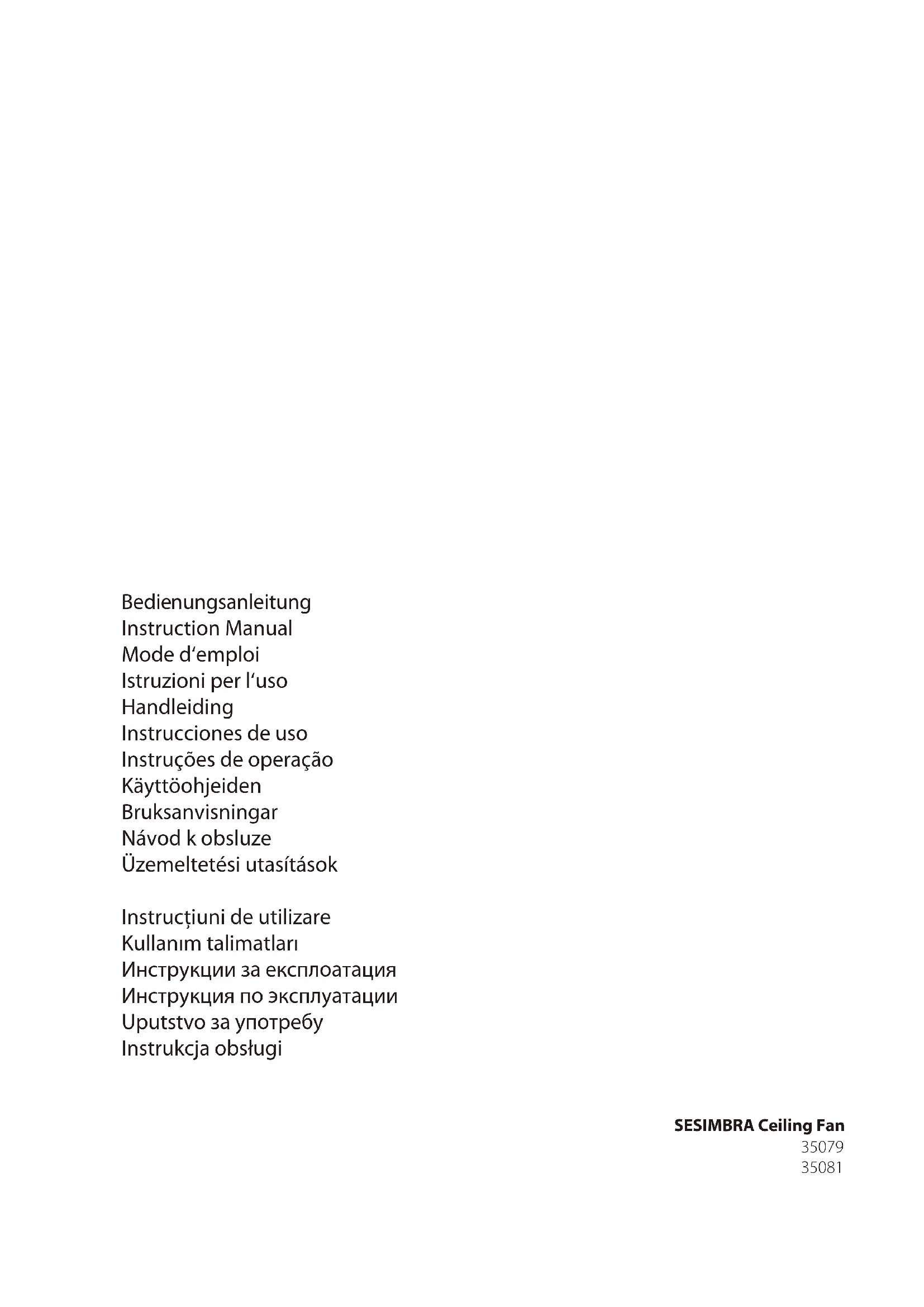 parts of the safety suspension system device shall be performed by the manufacturer, its service agent or suitably qualified persons. 22. The mounting of the suspension system shall be performed by the manufacturer, its service agent or suitably qualified persons. 23. The fan is to be supplied through a residual current device (RCD) having a rated residual operating current not exceeding 30 mA. 24. The fan is considered to be suitable for use in countries having a warm damp equable climate. It may also be used in other countries.8 SESIMBRA Ceiling Fan Consignes de sécurité Avis Veuillez lire attentivement ce manuel avant d’essayer de monter ou d'installer votre nouveau ventilateur de plafond. Pour assurer une installation sûre et réussie, veuillez lire ce manuel, vous assurer de l’avoir sous la main pour que votre installateur puisse le consulter et le conserver dans un endroit sûr afin de pouvoir le relire ultérieurement. 1. TOUTE tâche électrique doit exclusivement être réalisée par un électricien qualifié et agréé. Ce ventilateur de plafond DOIT être EXCLUSIVEMENT installé par un électricien qualifié et agréé. 2. Cet appareil peut être utilisé par les enfants de 8 ans et plus et par des personnes aux capacités physiques, sensorielles ou mentales limitées ou manquant d’expérience et de connaissances à condition qu'ils soient surveillés ou aient reçu des instructions sur l’utilisation sécurisée de l’appareil et qu’ils comprennent les dangers impliqués. Les enfants ne doivent pas jouer avec l’appareil. Le nettoyage et la maintenance utilisateur ne doivent pas être réalisés par des enfants sans surveillance. 3. Ne laissez PAS les enfants jouer avec cet appareil et surveillez les enfants à tout moment lorsqu'ils se trouvent à proximité d’appareils électriques. 4. Avant de commencer toute tâche électrique, vérifiez que le courant est coupé et/ou que la tension réseau est coupée au niveau du boîtier de circuits électriques et assurez-vous que tous les pôles sont correctement isolés de l’alimentation électrique.