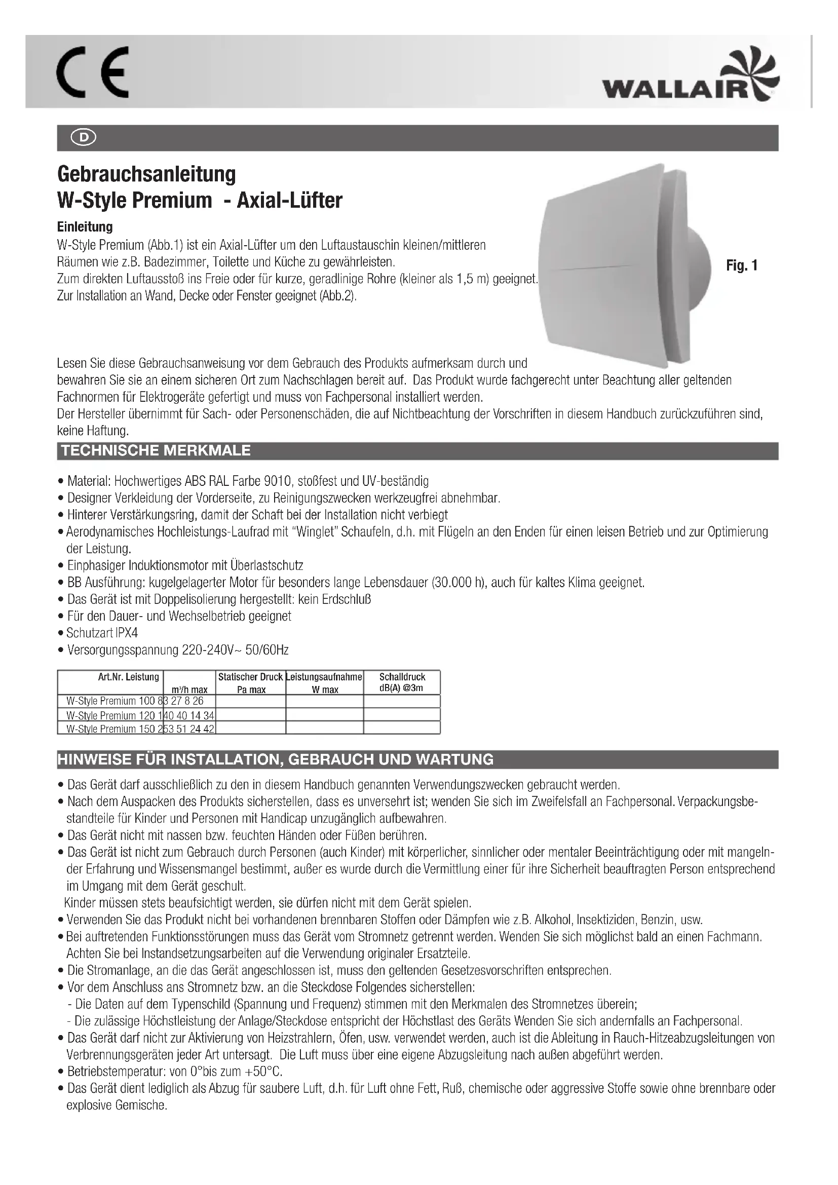 - Window installation In case of window installation it is necessary to use the appropriate window kit, which is not included. Attention: do not mount the product on the window without this kit. STANDARD CONFORMITY 2006/95/EC Low Voltage Directive (LVD) 2004/108/EC Electromagnetic Compatibility (EMC), in conformity with the following standards: Electrical Safety EN60335-1(2008); EN 60335-2-80(2005); EN 60335-2-80/A2(2009) Electromagnetic Compatibility EN 55014-1(2006)+A1+A2; EN 55014-2(1997)+A1(2001)+A2(2008)+IS1(2007) EN 61000-3-2(2006)+A1(2009)+A2(2009); EN 61000-3-3(2008).7 Introduction W-Style Premium (figure 1) est un aérateur axial conçu pour garantir le renouvellement de l’air dans des endroits de petites/grandes dimensions tels que les salles de bain, toilettes et cuisines. Adapté pour l’expulsion de l’air directement vers l’extérieur ou à travers de courtes canalisations linéaires (inférieur à 1,5 m). Installation murale, au plafond ou à la fenêtre (fig.2). Lisez ce manuel avec attention avant d’utiliser le produit et conservez-le dans un endroit sûr afin de pourvoir le consulter si nécessaire. Le produit est construit selon les règles de l’art et conformément aux normes en vigueur en matière d’appareils électriques, et doit être installé par du personnel techniquement qualifié. L’entreprise de construction n’assume aucune responsabilité pour les dommages causés aux personnes ou aux choses dérivant du non-respect des normes contenues dans ce manuel.
