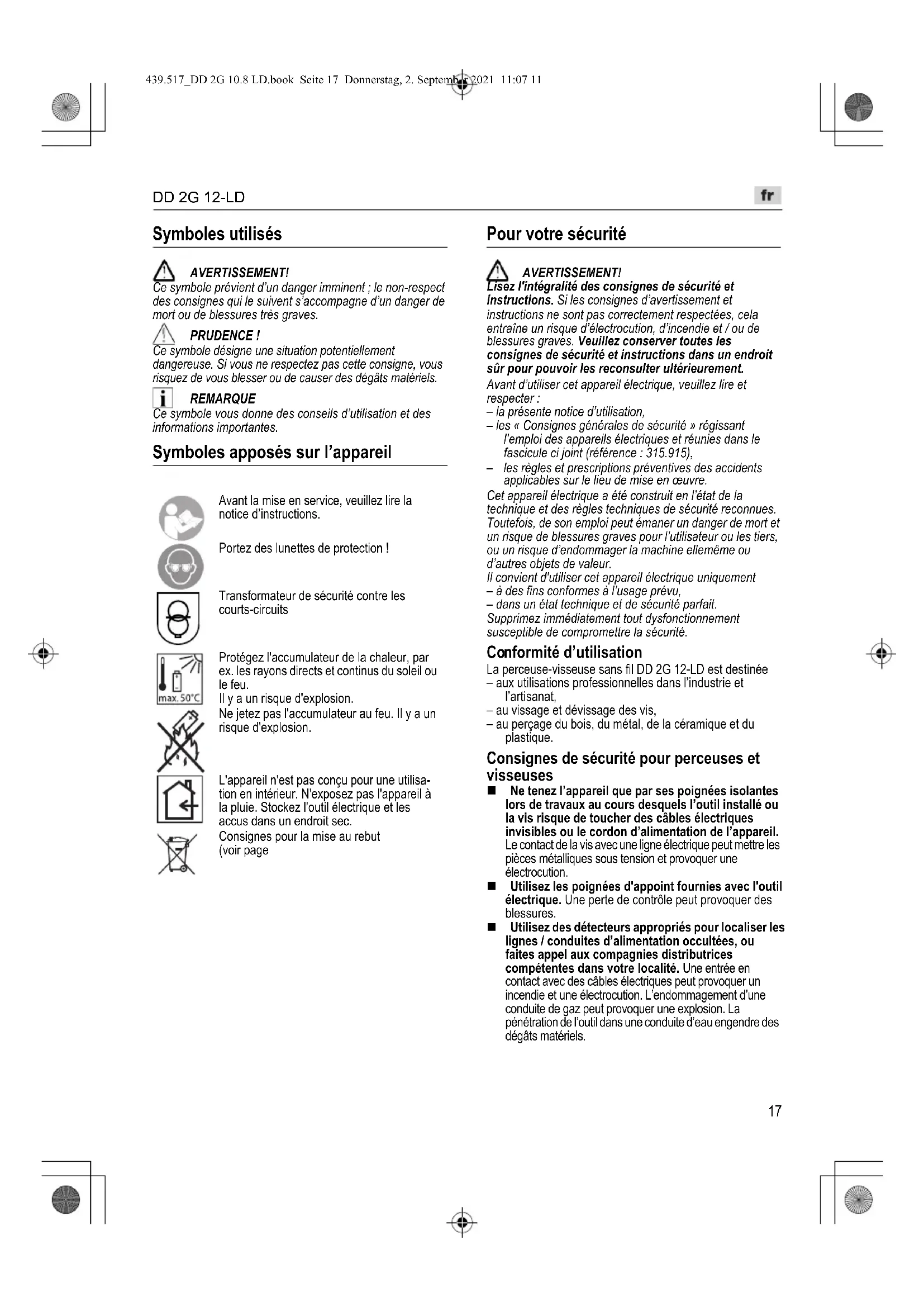 nformité d’utilisation La perceuse-visseuse sans fil DD 2G 12-LD est destinée – aux utilisations professionnelles dans l’industrie et l’artisanat, – au vissage et dévissage des vis, – au perçage du bois, du métal, de la céramique et du plastique. Consignes de sécurité pour perceuses et visseuses Ne tenez l’appareil que par ses poignées isolantes lors de travaux au cours desquels l’outil installé ou la vis risque de toucher des câbles électriques invisibles ou le cordon d’alimentation de l’appareil. Le contact de la vis avec une ligne électrique peut mettre les pièces métalliques sous tension et provoquer une électrocution. Utilisez les poignées d'appoint fournies avec l'outil électrique. Une perte de contrôle peut provoquer des blessures. Utilisez des détecteurs appropriés pour localiser les lignes / conduites d’alimentation occultées, ou faites appel aux compagnies distributrices compétentes dans votre localité. Une entrée en contact avec des câbles électriques peut provoquer un incendie et une électrocution. L’endommagement d’une conduite de gaz peut provoquer une explosion. La pénétration de l’outil dans une conduite d’eau engendre des dégâts matériels. Avant la mise en service, veuillez lire la notice d’instructions. Portez des lunettes de protection ! Transformateur de sécurité contre les courts-circuits Protégez l'accumulateur de la chaleur, par ex. les rayons directs et continus du soleil ou le feu. Il y a un risque d'explosion. Ne jetez pas l'accumulateur au feu. Il y a un risque d'explosion. L'appareil n'est pas conçu pour une utilisa- tion en intérieur. N'exposez pas l'appareil à la pluie. Stockez l'outil électrique et les accus dans un endroit sec. Consignes pour la mise au rebut (voir page 439.517_DD 2G 10.8 LD.book Seite 17 Donnerstag, 2. September 2021 11:07 1118 Éteignez immédiatement l'outil électrique si l'outil installé est bloqué. Préparez-vous au fait que les couples de réaction élevés provoquent un recul. L'outil installé se bloque si : – l'outil électrique est surchargé ou – il se coince dans la pièce à usiner. Tenez fermement l'outil électrique. Lors du serrage et desserrage de vis, des couples de réaction élevés peuvent survenir à court terme. Sécurisez la pièce. Une pièce retenue au moyen de dispositifs de serrage ou d’un étau l’est plus sûrement qu’avec la main. Veuillez attendre l'arrêt complet de l'outil électrique avant de le déposer. L'outil installé risque de se coincer et d'entraîner une perte de contrôle sur l'outil électrique. Utilisez uniquement des accumulateurs d'origine correspondant à la tension indiquée sur la plaque signalétique de votre outil électrique. En cas d'utilisation d'autres accumulateurs, par ex. contrefaçons, accumulateurs recyclés ou d'autres marques, il y a un risque de blessures ou de dommages provoqués par explosion de l'accumulateur. Consignes de sécurité pour le maniement des accus N'ouvrez pas l'accu. Il y a un risque de court-circuit. Protégez l'accu de la chaleur (par ex. des rayonnements permanents du soleil), du feu, de l'eau et de l'humidité. Risque d'explosion. En cas de dommage et d'utilisation non conforme de l'accu, des vapeurs peuvent s'échapper. Assurez un apport d'air frais et rendez-vous chez un médecin en cas de troubles. Les vapeurs peuvent irriter les voies respiratoires. En cas d’utilisation abusive, du liquide peut sortir de l’accumulateur. Évitez tout contact avec ce liquide. En cas de contact par mégarde, rincez soigneusement avec de l’eau. Au cas où le liquide rentrerait dans les yeux, consultez en plus un médecin. Le liquide qui sort de l’accumulateur peut entraîner des irritations de la peau ou causer des brûlures. Ne chargez les accumulateurs qu'avec des chargeurs recommandés par le fabricant. Un chargeur approprié à un type spécifique d’accumulateur peut engendrer un risque d’incendie lorsqu’il est utilisé avec d’autres accumulateurs. L'accu risque d'être endommagé par des objets pointus comme par exemple les clous, tournevis ou par la pénétration d'une force externe. Un court-circuit interne risque de se produire et l'accu risque de brûler, fumer, exploser ou surchauffer. Chargeur Vérifiez toujours si la tension de réseau correspond à la tension indiquée sur la plaque signalétique du chargeur. La fiche de secteur du chargeur doit être appropriée à la prise de courant. Ne modifiez en aucun cas la fiche. N’utilisez pas de fiches d’adaptateur avec des appareils avec mise à la terre. Les fiches non modifiées et les prises de courant appropriées réduisent le risque de choc électrique. Utilisez le chargeur uniquement dans des locaux secs et évitez tout contact avec l'humidité et la pluie. La pénétration d’eau dans le chargeur augmente le risque d’un choc électrique. N'utilisez jamais le chargeur si le câble, la prise ou l'appareil luimême sont endommagés par des influences extérieures. Apportez le chargeur à l'atelier le plus proche. N'ouvrez jamais le chargeur. En cas de dysfonctionnement, apportez-le dans un atelier spécialisé. Ne posez aucun objet sur le chargeur et ne le placez pas sur une surface molle. Il y a un risque d'incendie. Consignes de sécurité particulières Avant tout travail sur l'outil électrique, placez le sélecteur du sens de rotation (2) en position centrale. Actionnez le sélecteur du sens de rotation (2) ou le réglage du couple (4) uniquement lorsque l'outil est à l'arrêt. Pour marquer l’outil électrique, n’utilisez que des étiquettes autocollantes. Ne percez jamais de trous dans le corps de l’appareil. Bruit et vibrations REMARQUE Les valeurs du niveau de bruit exprimé en décibels A ainsi que les valeurs totales des vibrations figurent dans le tableau de la page 6. Les niveaux de bruits et vibrations ont été déterminés conformément à EN 60745. AVERTISSEMENT! Les valeurs de me