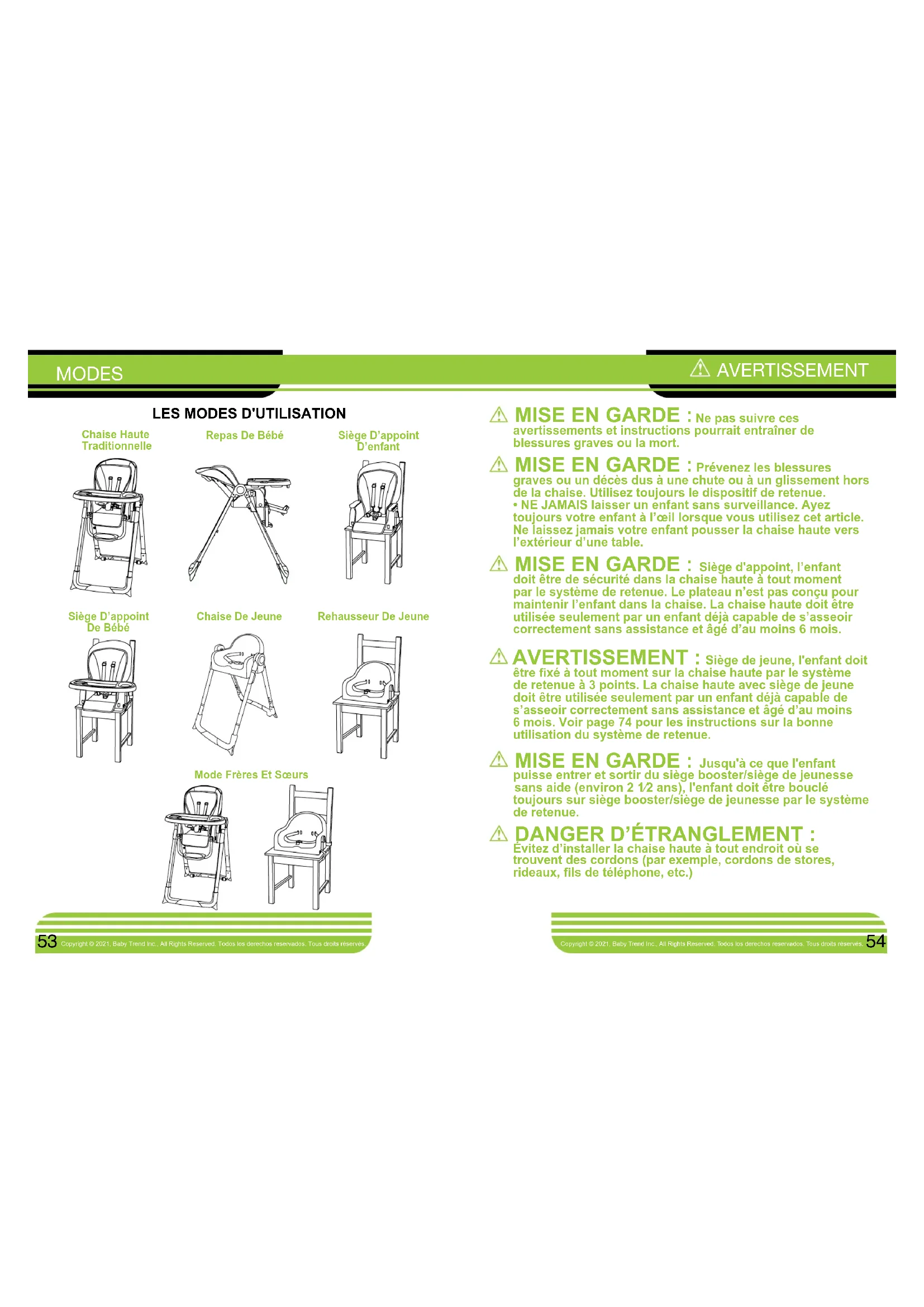 Chaise Haute TraditionnelleSiège D’appoint De Bébé Repas De Bébé Siège D’appoint D’enfantMode Frères Et SœursRehausseur De JeuneChaise De Jeune MISE EN GARDE : Ne pas suivre ces avertissements et instructions pourrait entraîner de blessures graves ou la mort. MISE EN GARDE : Prévenez les blessures graves ou un décès dus à une chute ou à un glissement hors de la chaise. Utilisez toujours le dispositif de retenue. • NE JAMAIS laisser un enfant sans surveillance. Ayez toujours votre enfant à l’œil lorsque vous utilisez cet article. Ne laissez jamais votre enfant pousser la chaise haute vers l’extérieur d’une table. MISE EN GARDE : Siège d'appoint, l’enfant doit être de sécurité dans la chaise haute à tout moment par le système de retenue. Le plateau n’est pas conçu pour maintenir l’enfant dans la chaise. La chaise haute doit être utilisée seulement par un enfant déjà capable de s’asseoir correctement sans assistance et âgé d’au moins 6 mois. AVERTISSEMENT : Siège de jeune, l'enfant doit être xé à tout moment sur la chaise haute par le système de retenue à 3 points. La chaise haute avec siège de jeune doit être utilisée seulement par un enfant déjà capable de s’asseoir correctement sans assistance et âgé d’au moins 6 mois. Voir page 74 pour les instructions sur la bonne utilisation du système de retenue. MISE EN GARDE : Jusqu'à ce que l'enfant puisse entrer et sortir du siège booster/siège de jeunesse sans aide (environ 2 1⁄2 ans), l'enfant doit être bouclé toujours sur siège booster/siège de jeunesse par le système de retenue. DANGER D’ÉTRANGLEMENT : Évitez d’installer la chaise haute à tout endroit où se trouvent des cordons (par exemple, cordons de stores, rideaux, ls de téléphone, etc.)Copyright © 2017, Baby Trend Inc., All Rights Reserved. Todos Los Derechos Reservados. WARNING