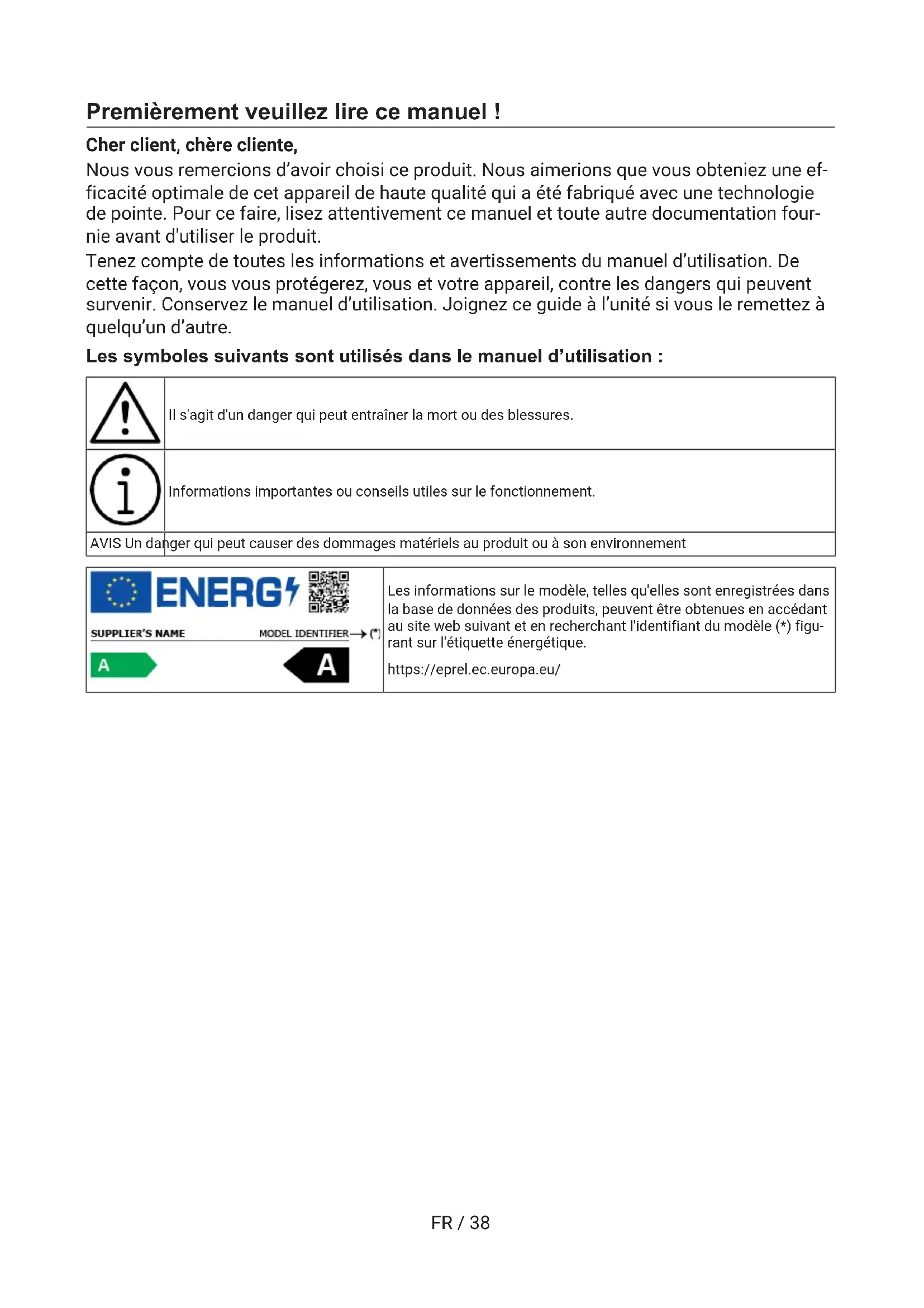 PTFR / 38 Premièrement veuillez lire ce manuel ! Cher client, chère cliente, Nous vous remercions d’avoir choisi ce produit. Nous aimerions que vous obteniez une ef- ficacité optimale de cet appareil de haute qualité qui a été fabriqué avec une technologie de pointe. Pour ce faire, lisez attentivement ce manuel et toute autre documentation four- nie avant d'utiliser le produit. Tenez compte de toutes les informations et avertissements du manuel d’utilisation. De cette façon, vous vous protégerez, vous et votre appareil, contre les dangers qui peuvent survenir. Conservez le manuel d’utilisation. Joignez ce guide à l’unité si vous le remettez à quelqu’un d’autre. Les symboles suivants sont utilisés dans le manuel d’utilisation: Il s'agit d'un danger qui peut entraîner la mort ou des blessures. Informations importantes ou conseils utiles sur le fonctionnement. AVIS Un danger qui peut causer des dommages matériels au produit ou à son environnement Les informations sur le modèle, telles qu'elles sont enregistrées dans la base de données des produits, peuvent être obtenues en accédant au site web suivant et en recherchant l'identifiant du modèle (*) figu- rant sur l'étiquette énergétique. https://eprel.ec.europa.eu/FR / 39 Table des matières 1 Consignes de sécurité.................... 40